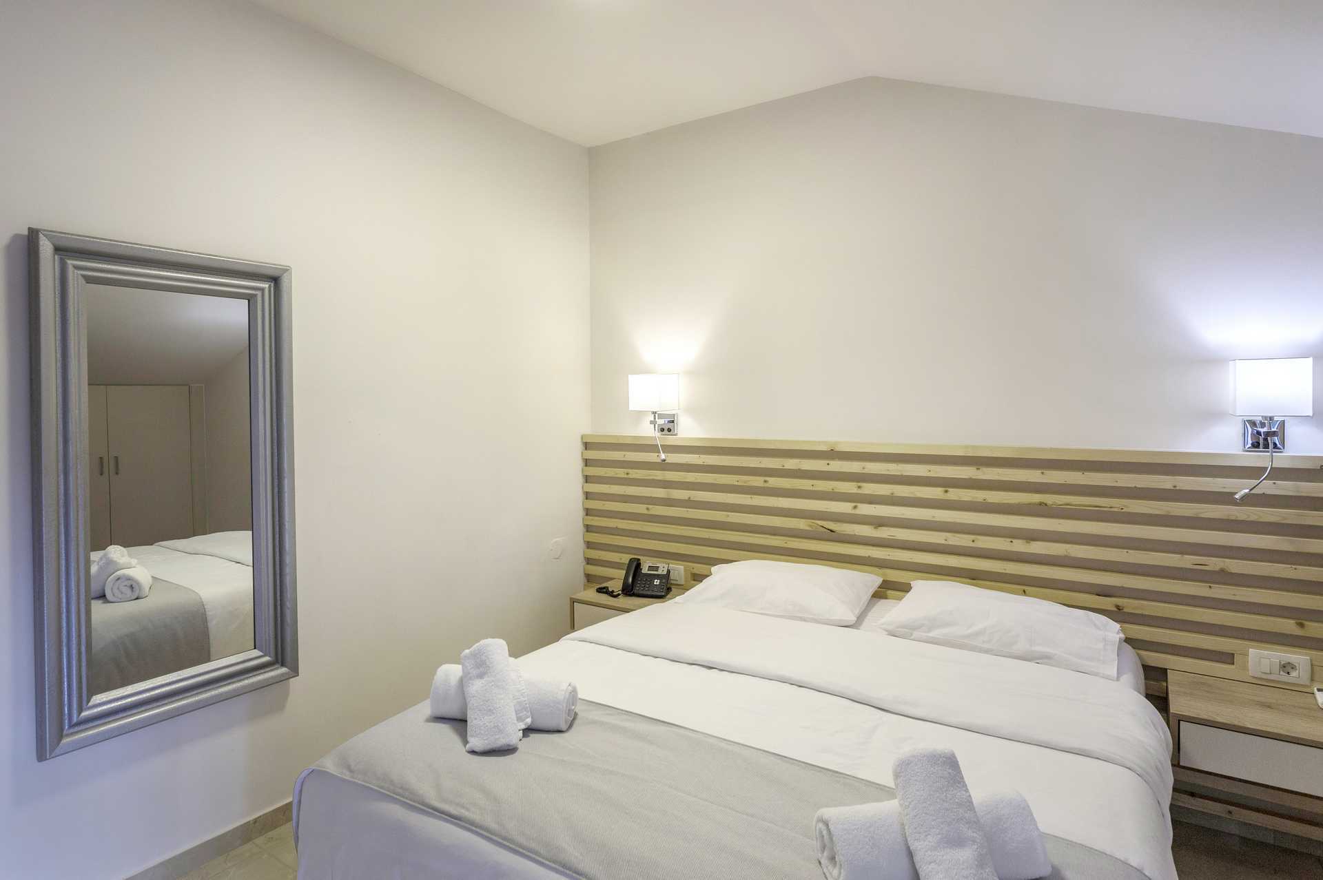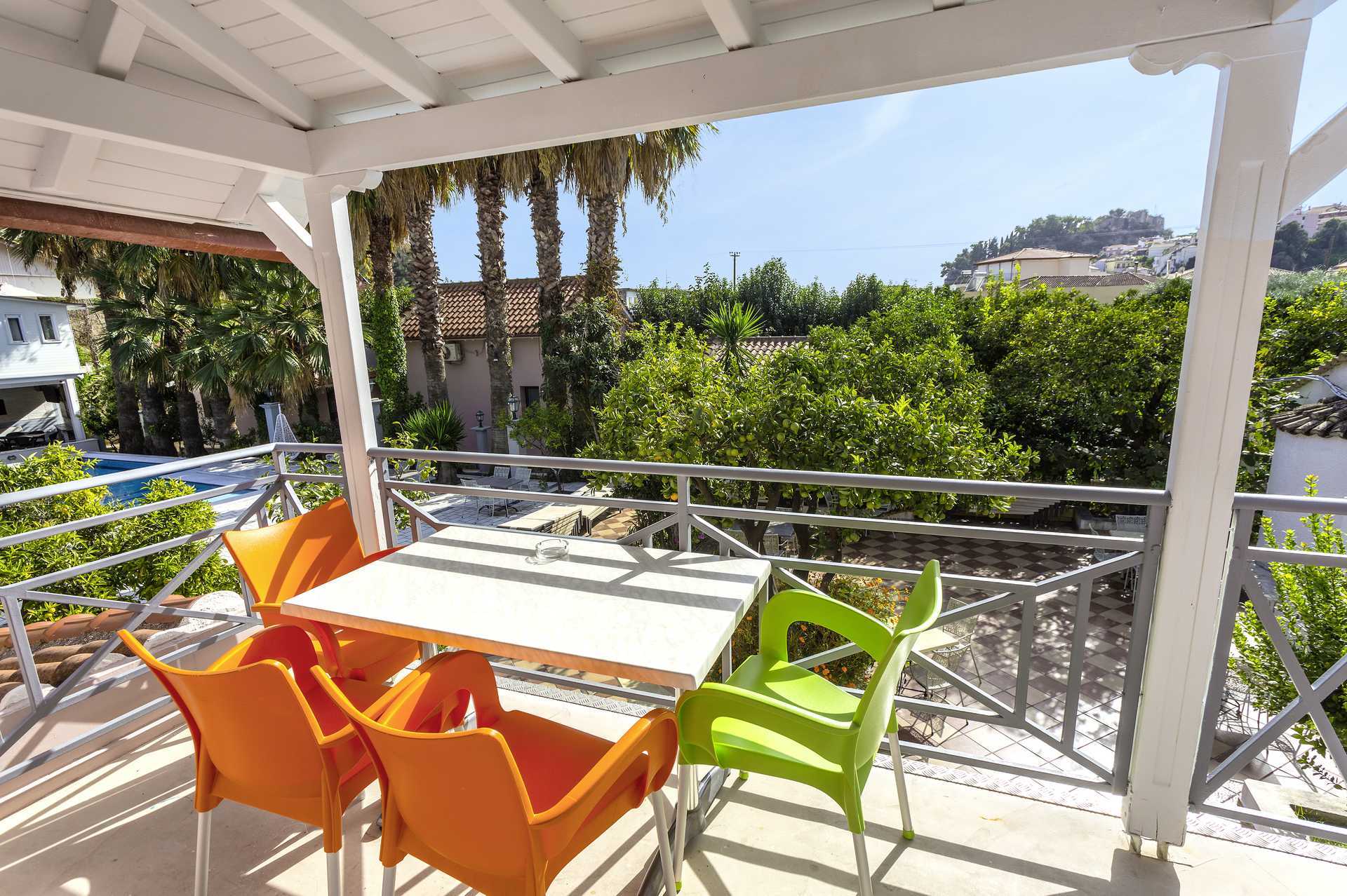 Større dobbeltværelse med indbygget balkon med høje vægge. Værelserne er placeret på de øverste etager i hovedbygningen. En dobbeltseng. Mulighed for ekstra opredning i sovesofa. Gratis wifi, aircondition og deponering. Køleskab. Tv med internationale kanaler. Hårtørrer. Badeværelse med bruser og toilet. Rengøring 7 gange om ugen.