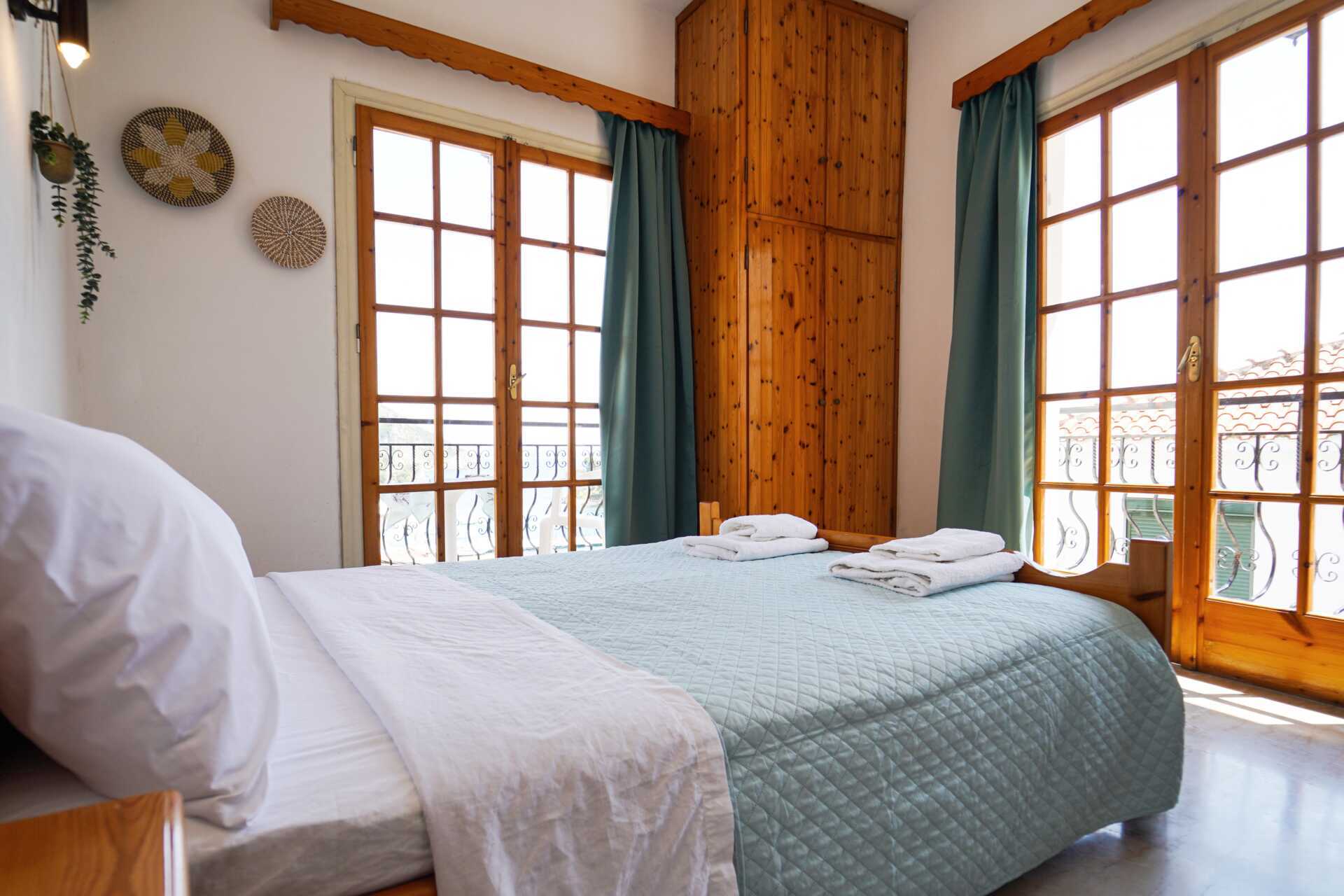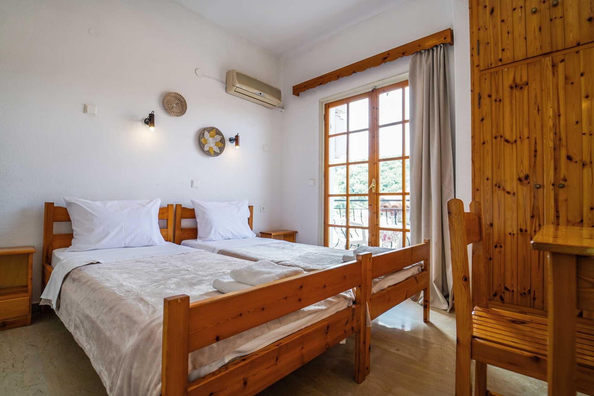 Dobbeltværelse med balkon eller terrasse i stueplan. Nogle balkoner er smalle, ca. 40-50 cm, og der er plads til to skamler og et lille bord. En dobbeltseng eller to enkeltsenge. Mulighed for ekstra opredning i enkeltseng. Gratis wifi og aircondition. Køleskab. Badeværelse med bruser og toilet. Rengøring 7 gange om ugen. Børn under to år tæller med i det maksimale antal personer på værelset.