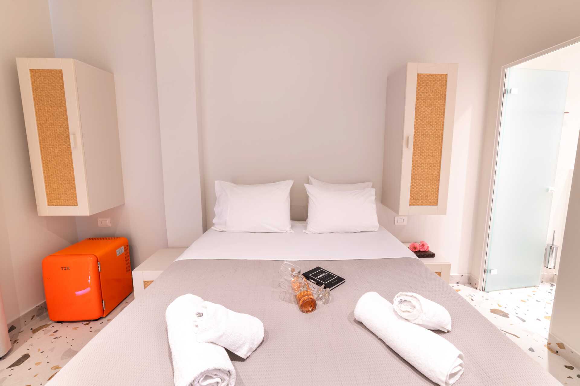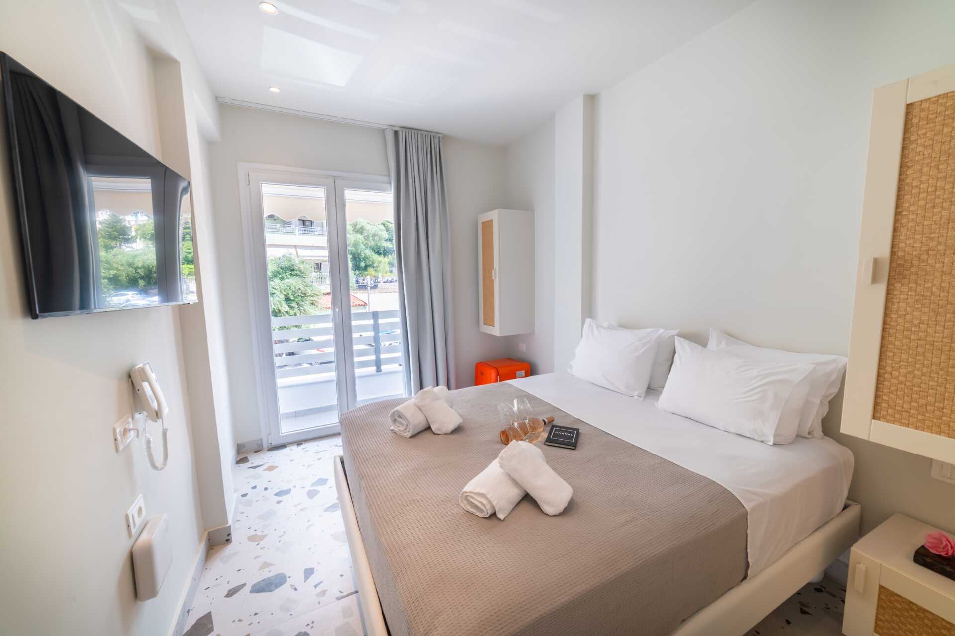 Superior-værelse med lille balkon. En dobbeltseng. Gratis wifi, aircondition og deponering. Lille køleskab. El-kedel. Tv med internationale kanaler. Badekåber og tøfler. Hårtørrer. Badeværelse med bruser og toilet. Rengøring 7 gange om ugen.