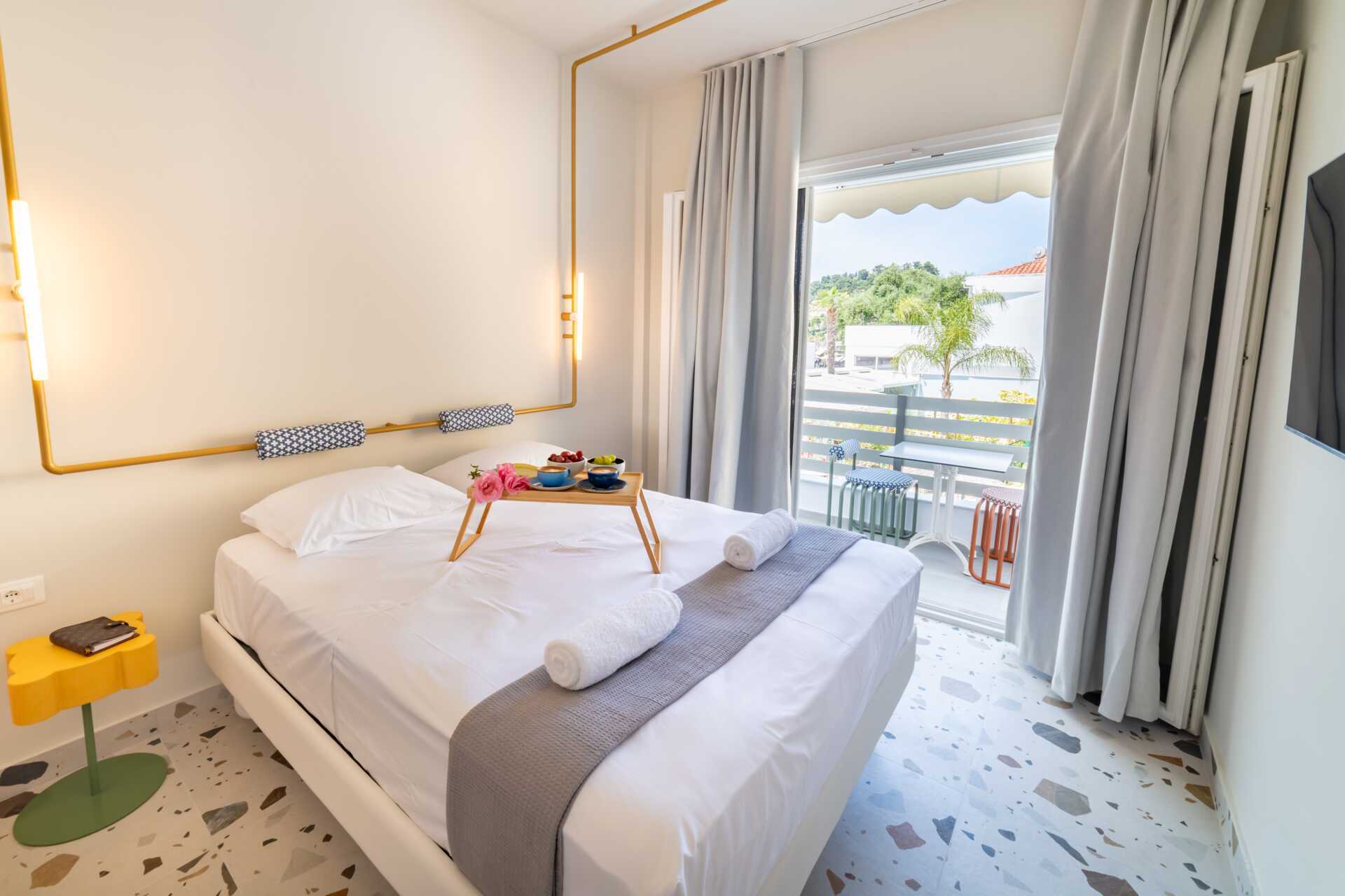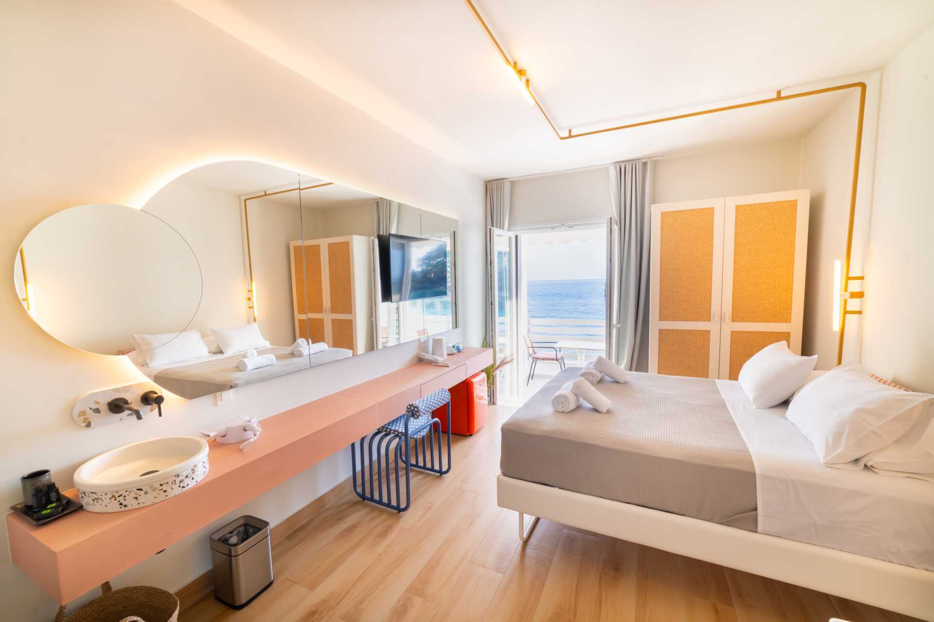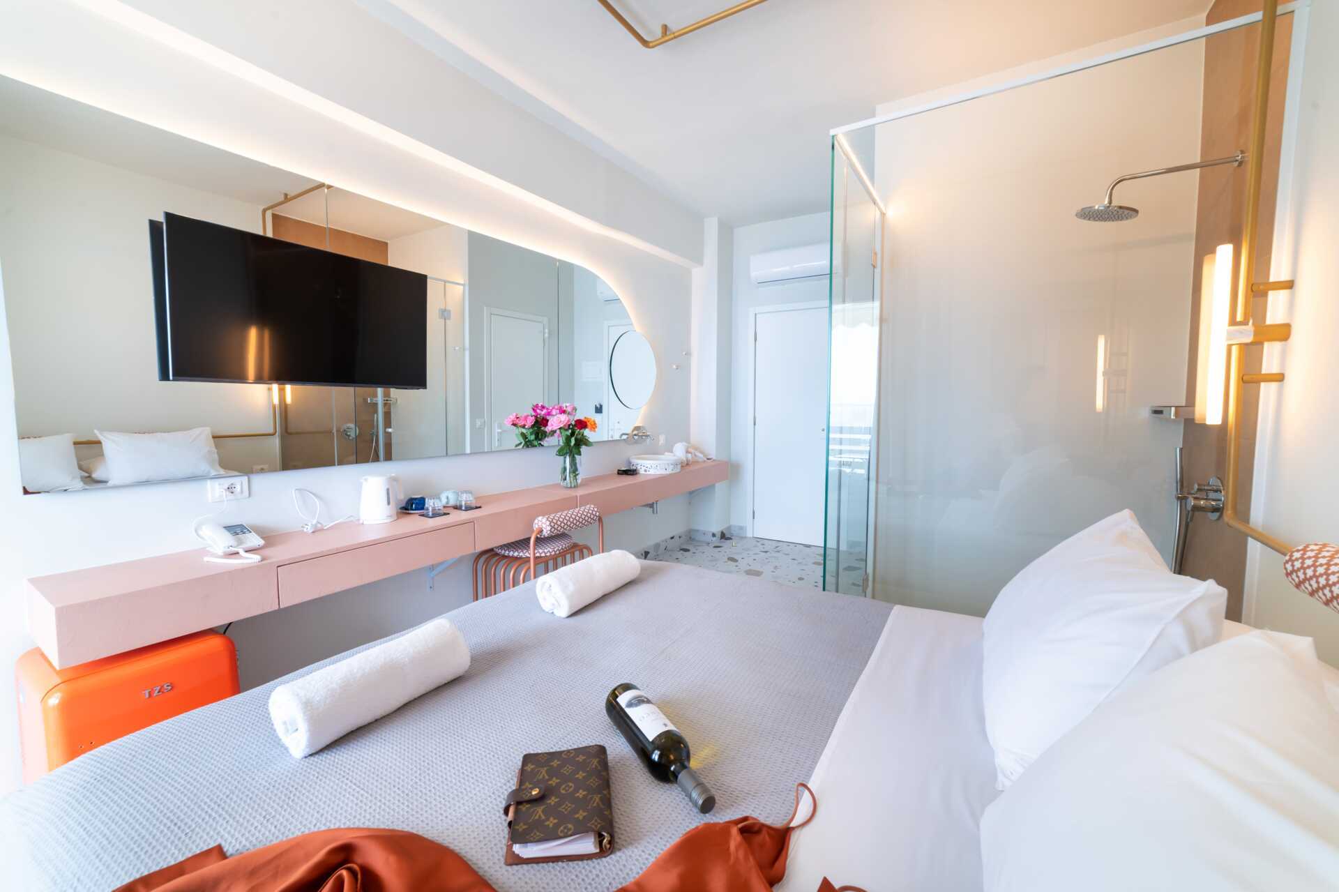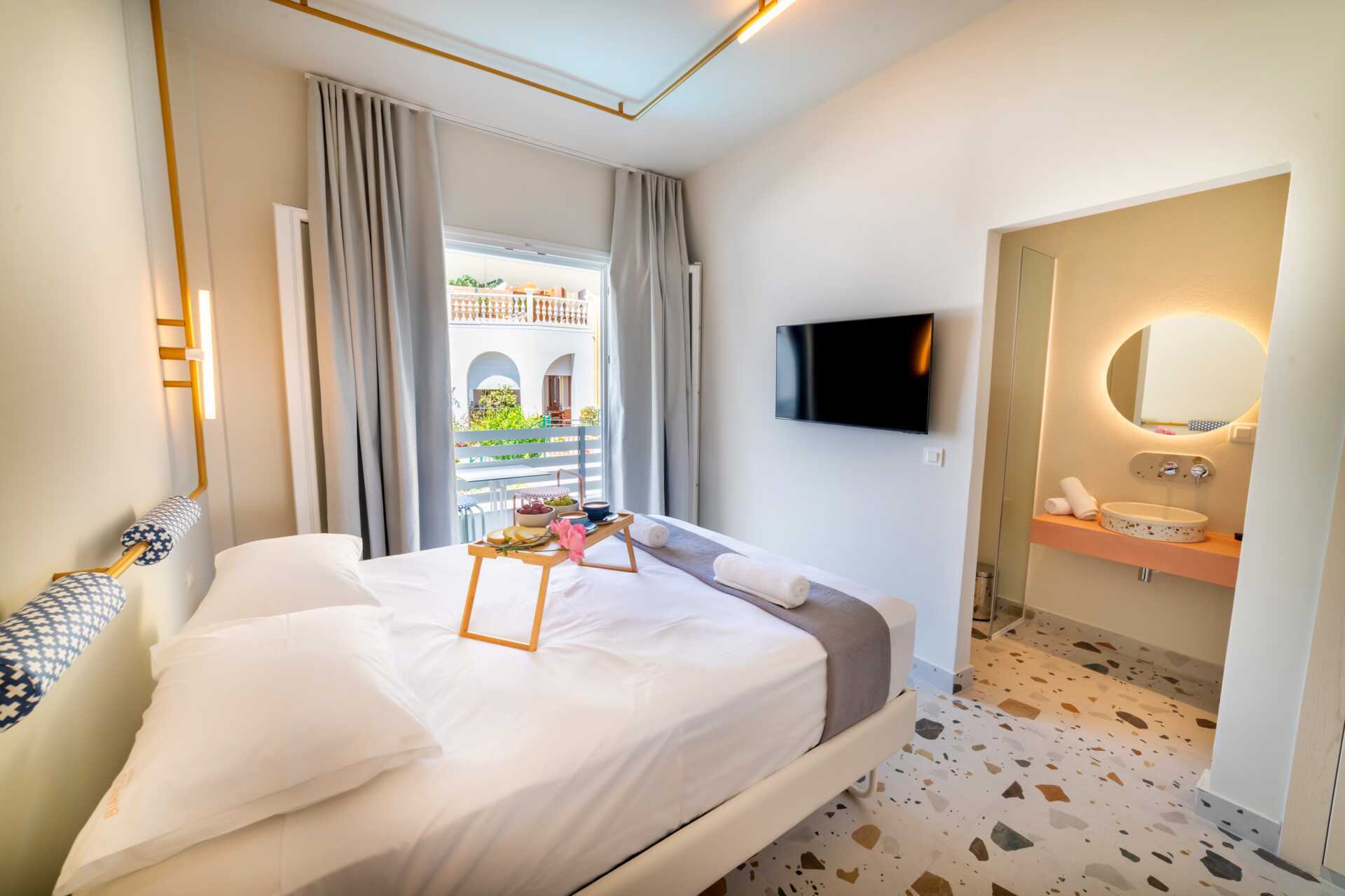 Junior-suite med balkon og havudsigt. En dobbeltseng. Gratis wifi, aircondition og deponering. Lille køleskab. El-kedel. Tv med internationale kanaler. Hårtørrer. Badekåber og tøfler. Badeværelse med badekar og bruser samt toilet. Rengøring 7 gange om ugen.