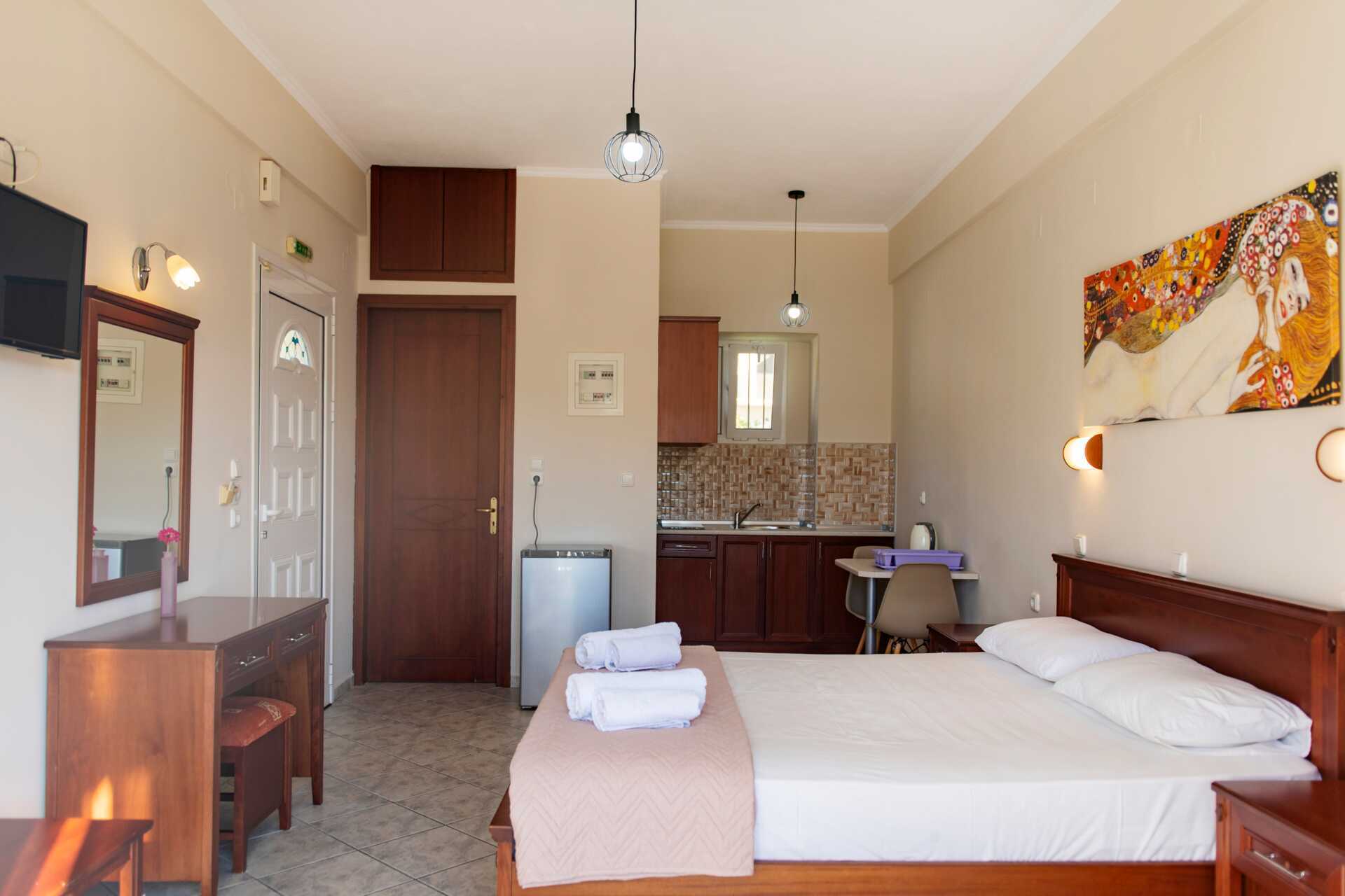 1-værelses lejligheder med balkon eller terrasse. Kombineret soveværelse og minikøkken. En dobbeltseng eller to enkeltsenge. Minikøkken med køleskab, kogeplader, el-kedel og enkelt køkkenudstyr. Gratis wifi og deponering. Aircondition mod betaling. Tv med lokale kanaler. Hårtørrer. Badeværelse med bruser og toilet. Rengøring 6 gange om ugen.