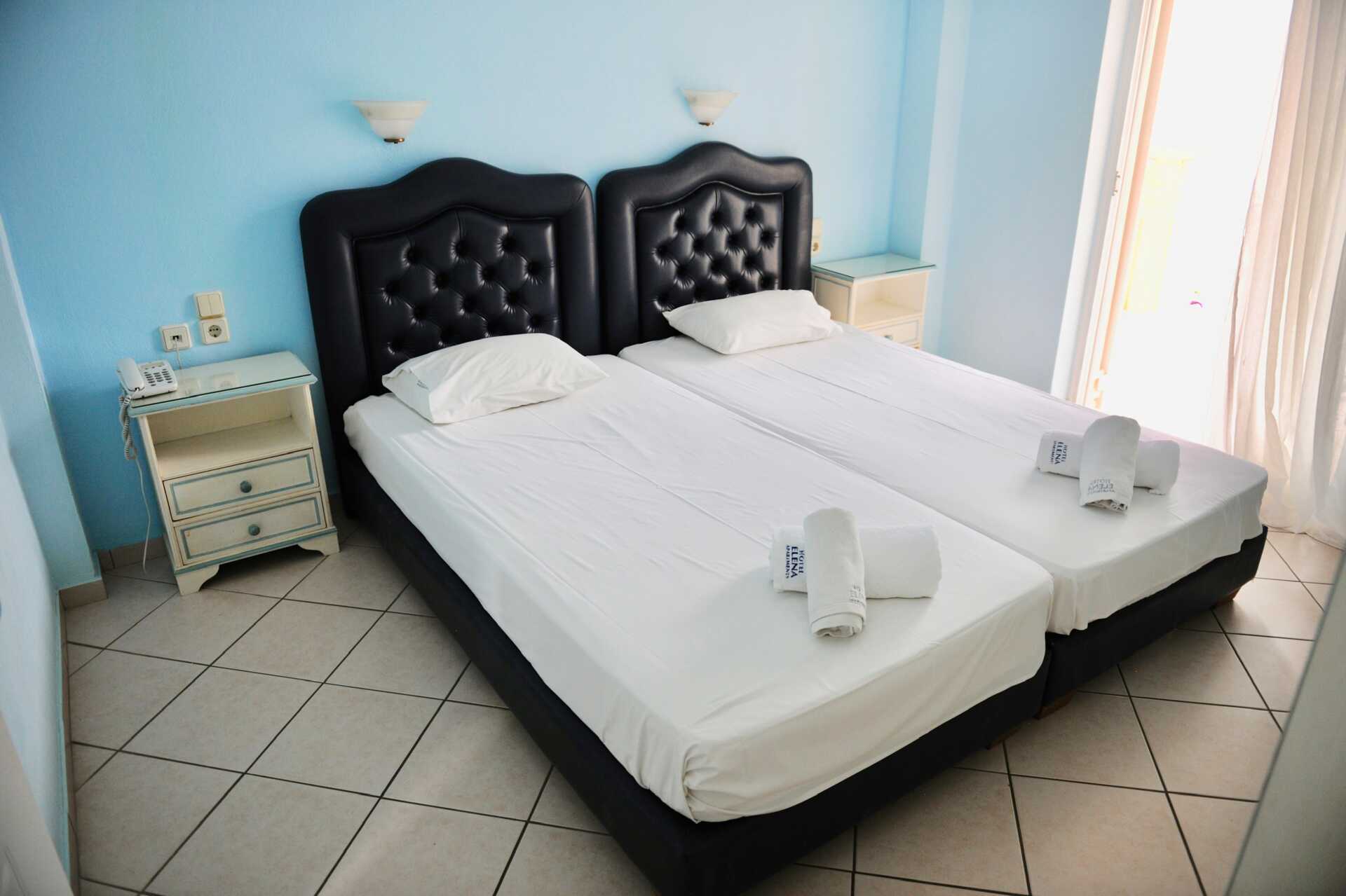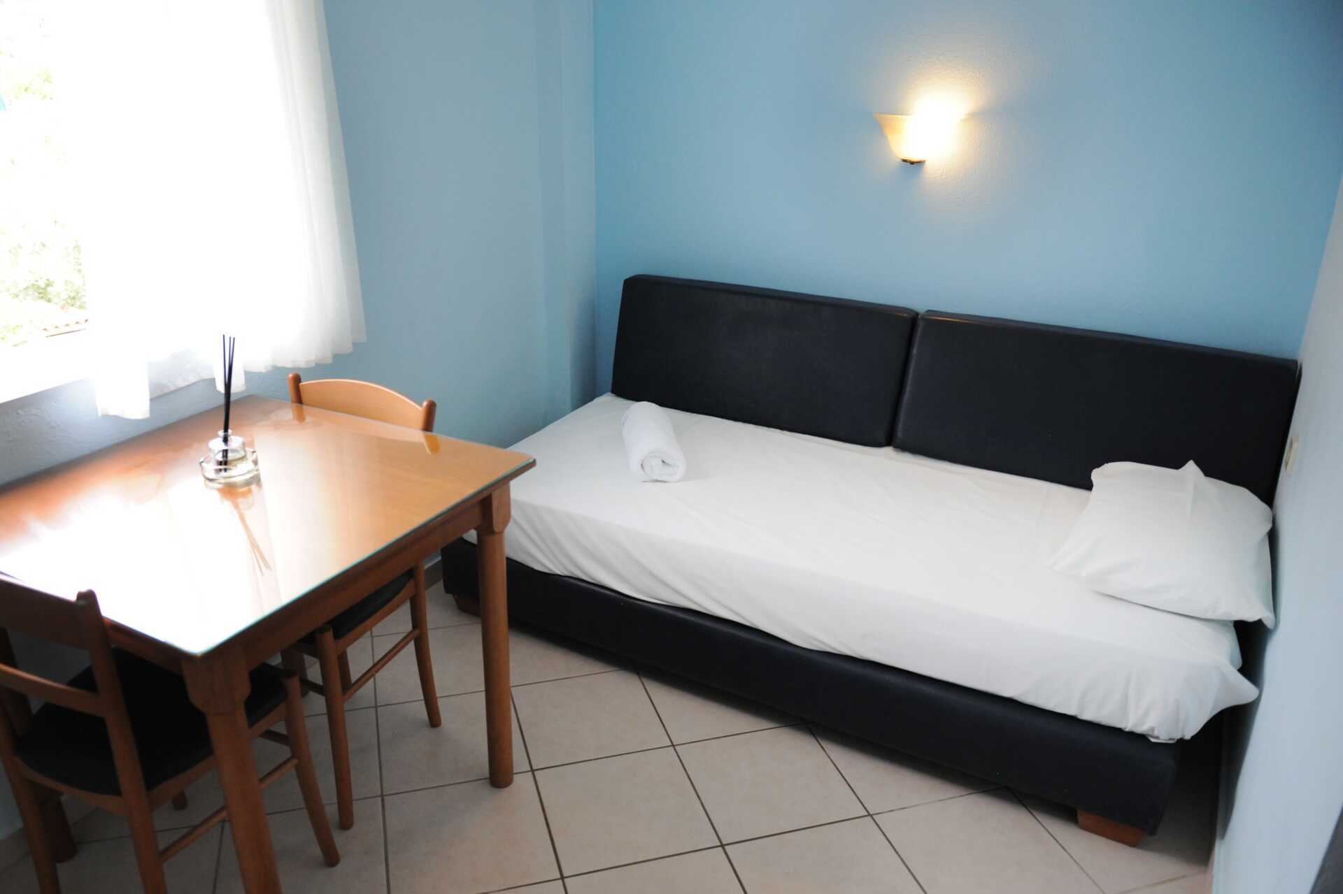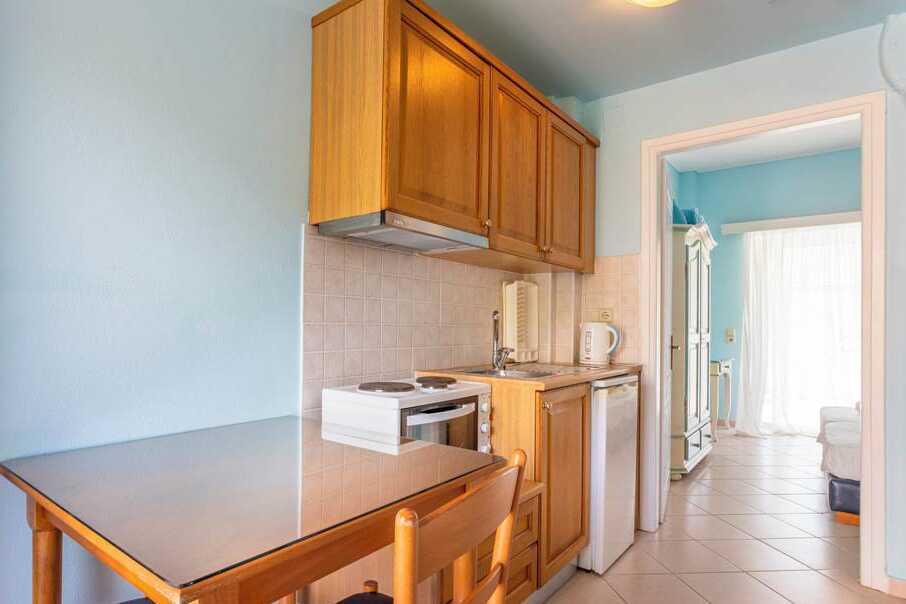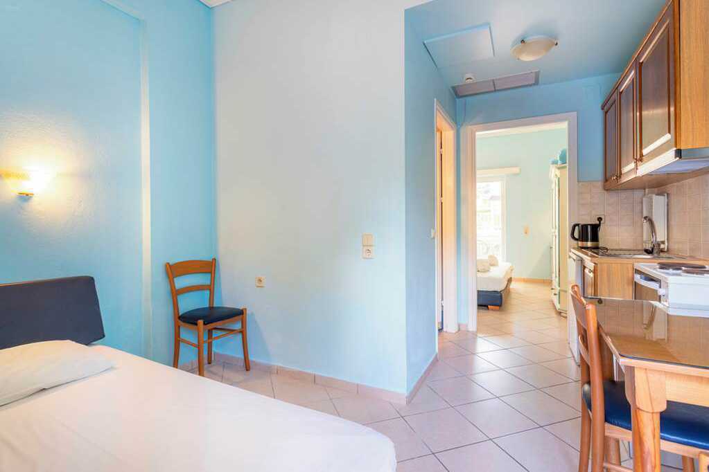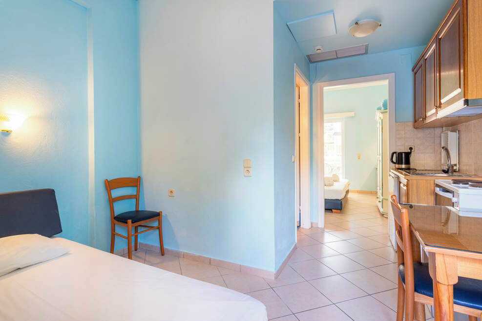 1-værelses lejlighed med balkon eller terrasse i stueplan. Nogle balkoner har pooludsigt. To enkeltsenge og mulighed for ekstra opredning på en sovesofa. Minikøkken med køleskab. Kogeplader, el-kedel, kaffemaskine og enkelt køkkenudstyr. Gratis wifi, aircondition og deponering. Tv med lokale kanaler. Hårtørrer. Badeværelse med bruser og toilet. Rengøring 6 gange om ugen.