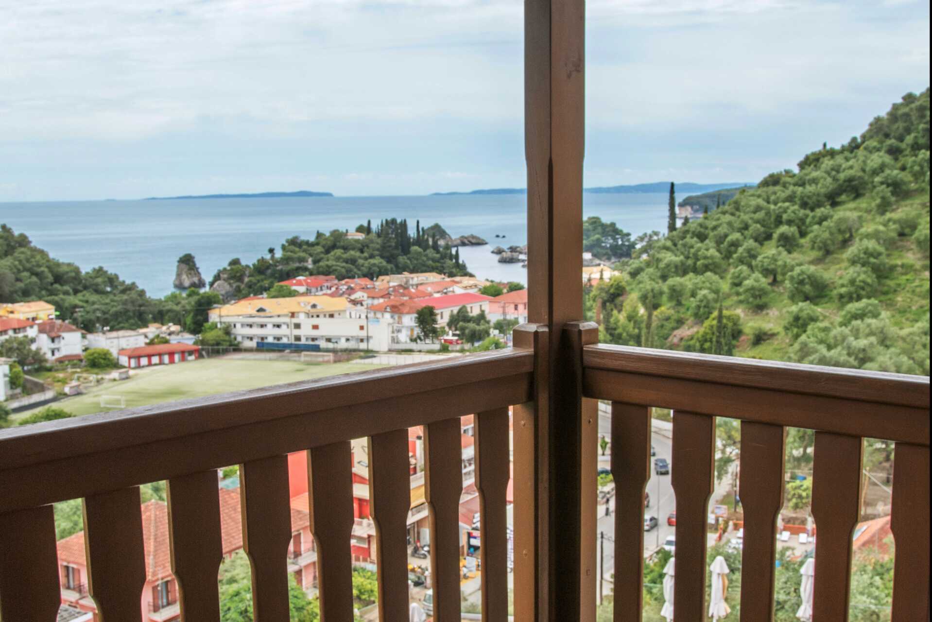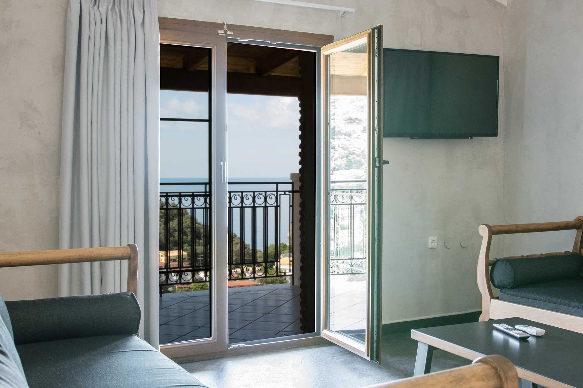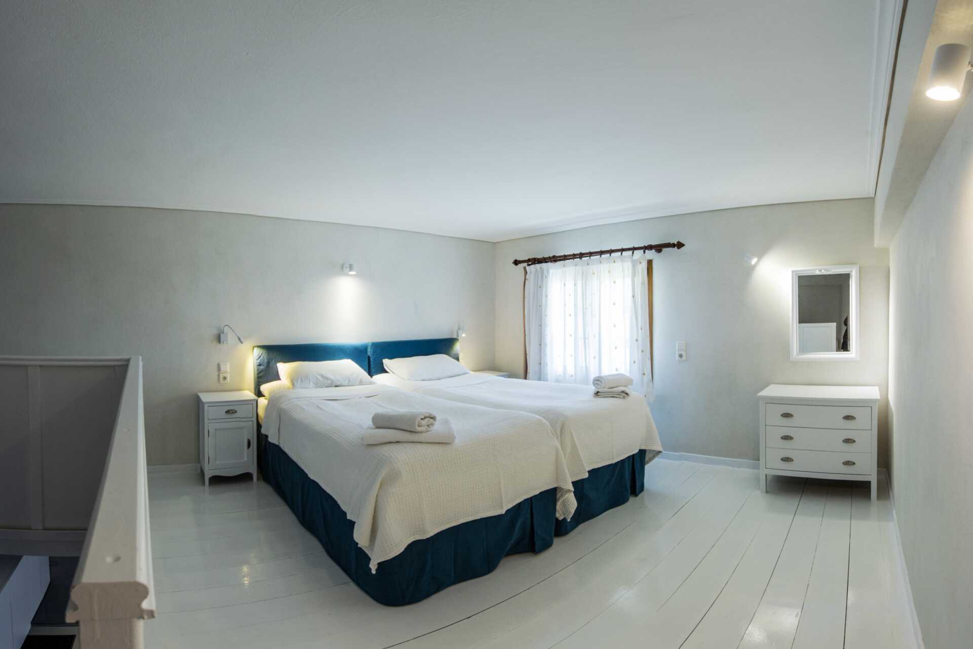 Dobbeltværelse i etage med balkon og havudsigt. Ovenpå op af en trappe er der hems med to enkeltsenge. I entréplan er der et opholdsrum med mulighed for ekstra opredninger på en sovesofa. Ved ankomsten venter en flaske vand i lejligheden. Gratis wifi, aircondition og deponering. Tv med internationale kanaler. Badeværelse med badekar eller bruser samt toilet. Rengøring 6 gange om ugen.