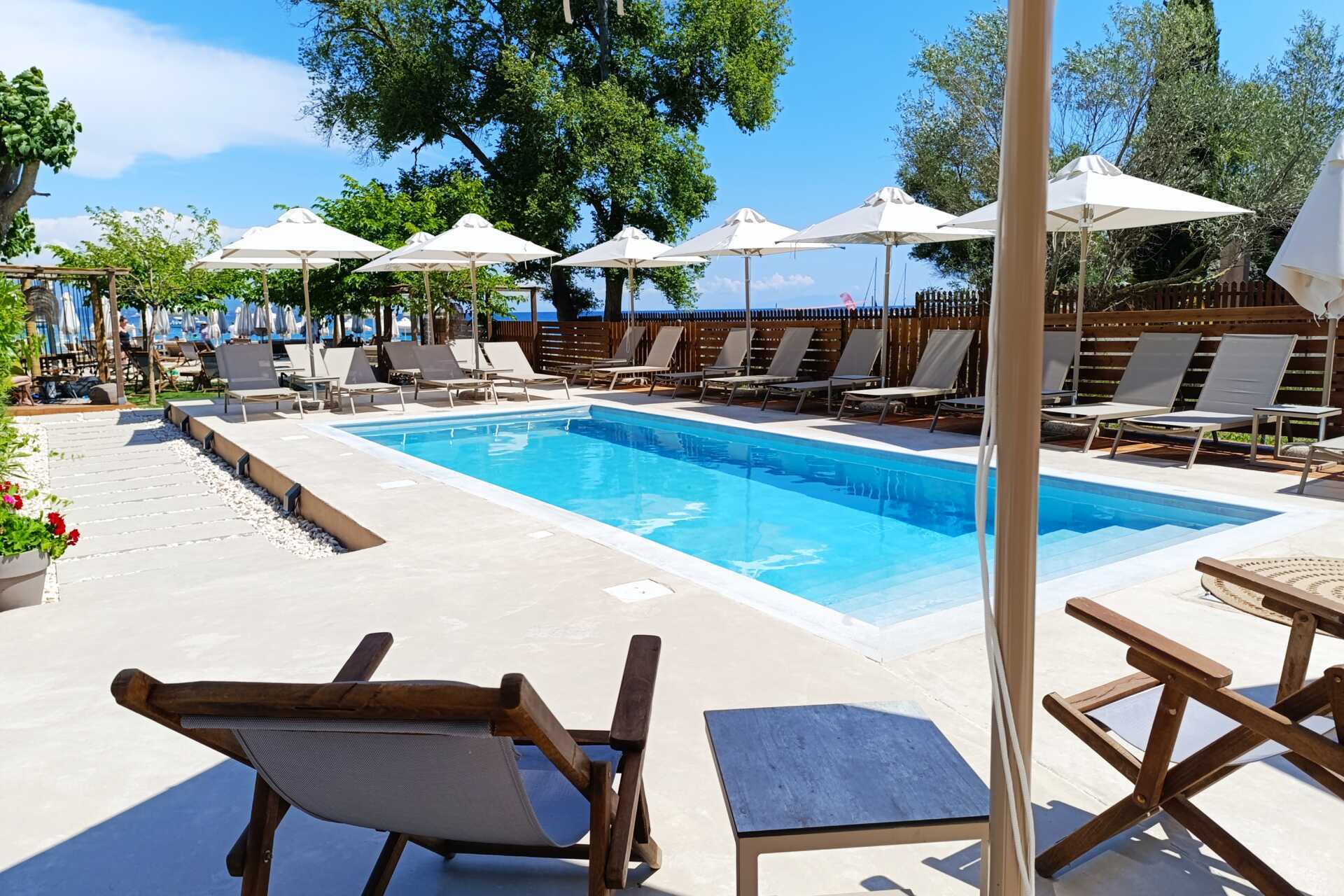 En helt ny pool med et indbydende poolområde stod færdigt i sommeren 2024. Poolhåndklæder kan lånes gratis. På stranden er der solstole og parasoller til udlån. To solstole og en parasol medfølger til hvert værelse - helt gratis. Der er reserveret pladser til dig, og disse ændrer sig dag for dag, og ved ankomst modtager du en rotationsplan, der viser dig, hvor du kan være.