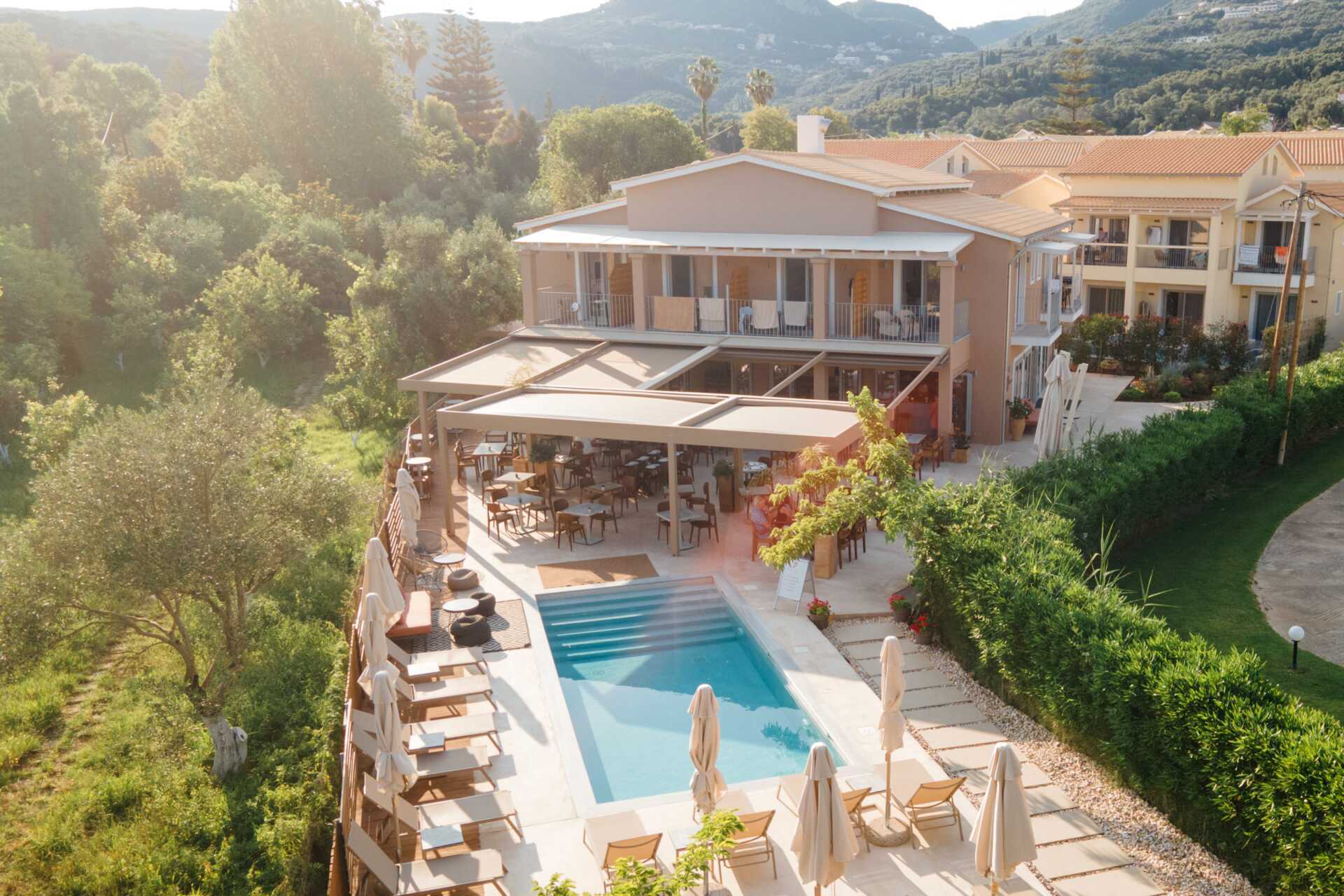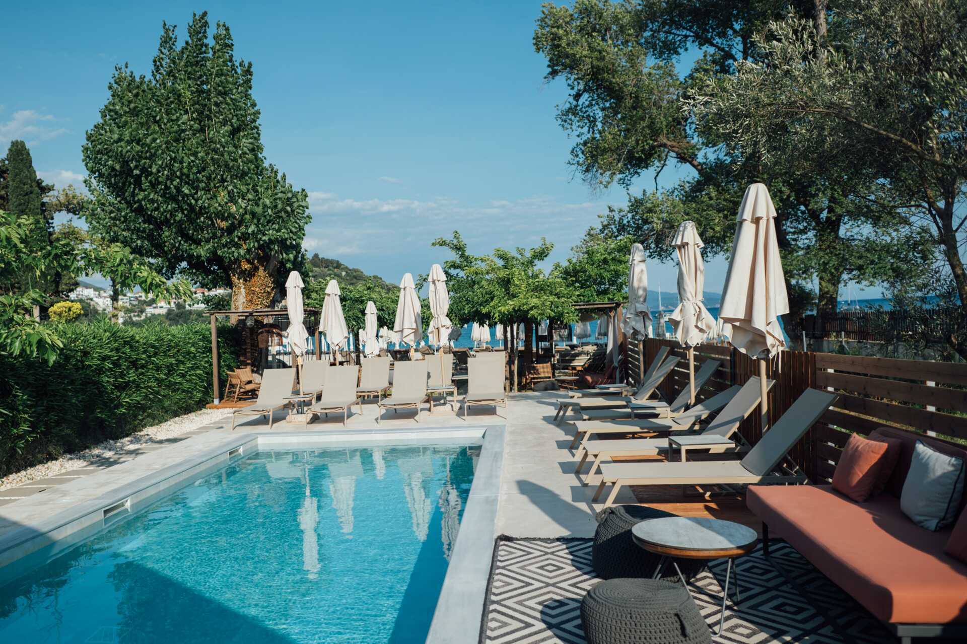 Dobbeltværelser med terrasse i stueplan med privat pool. På terrassen er der to solsenge og en stige ned i poolen. En dobbeltseng. Gratis wifi, aircondition og deponering. Køleskab. El-kedel og kaffe og te. Illy-kaffemaskine - kapsler inkluderet ved ankomst og kan derefter købes i receptionen. Tv med internationale kanaler. Hårtørrer. Tøfler. Badeværelse med bruser og toilet. Rengøring 7 gange om ugen.
