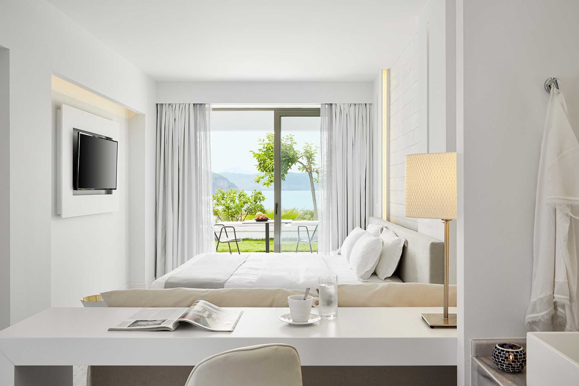 Deluxe-værelse med balkon og havudsigt. Værelserne ligger i bygningen tættest på havet. En dobbeltseng eller to enkeltsenge. Mulighed for ekstra opredning i sovesofa. Gratis wifi, aircondition og deponering. Køleskab. Tv med internationale kanaler. Tøfler. Hårtørrer. Badeværelse med bruser og toilet. Rengøring 7 gange om ugen.