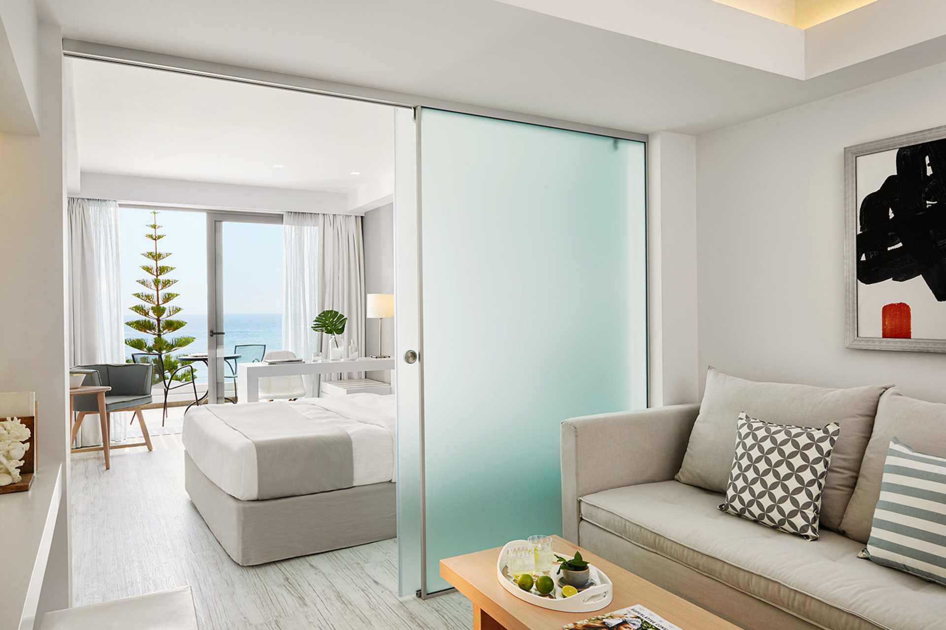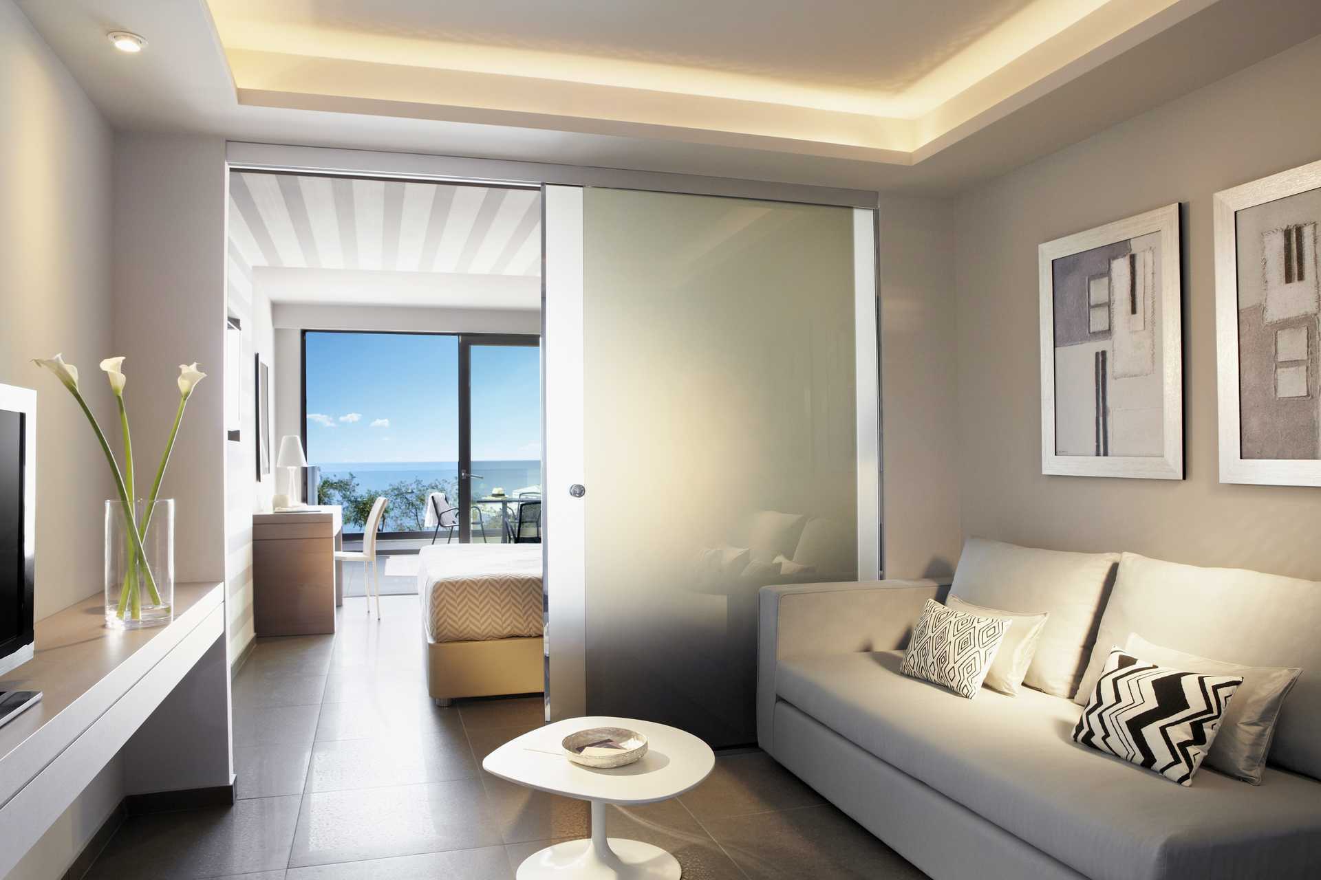 Familie-værelser med balkon eller terrasse og havudsigt. Værelserne ligger i bygningen tættest på havet og består af et soveværelse og et opholdsrum adskilt af en matteret glasdør. En dobbeltseng eller to enkeltsenge. Mulighed for ekstra opredning i sovesofa. Gratis wifi, aircondition og deponering. Køleskab. Kaffemaskine. Tv med internationale kanaler, tøfler. Hårtørrer. Badeværelse med badekar og seperat bruser samt toilet. Rengøring 7 gange om ugen.