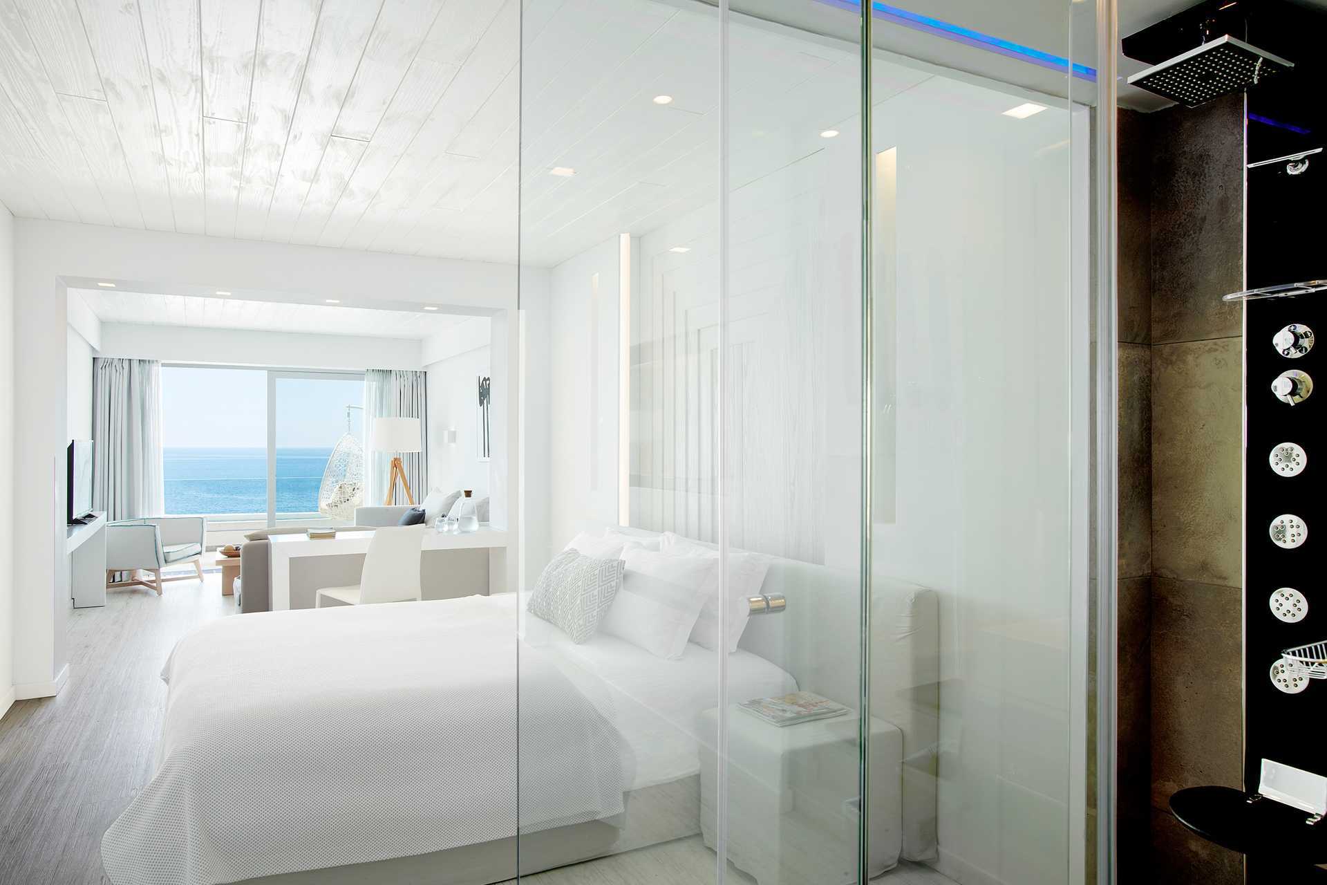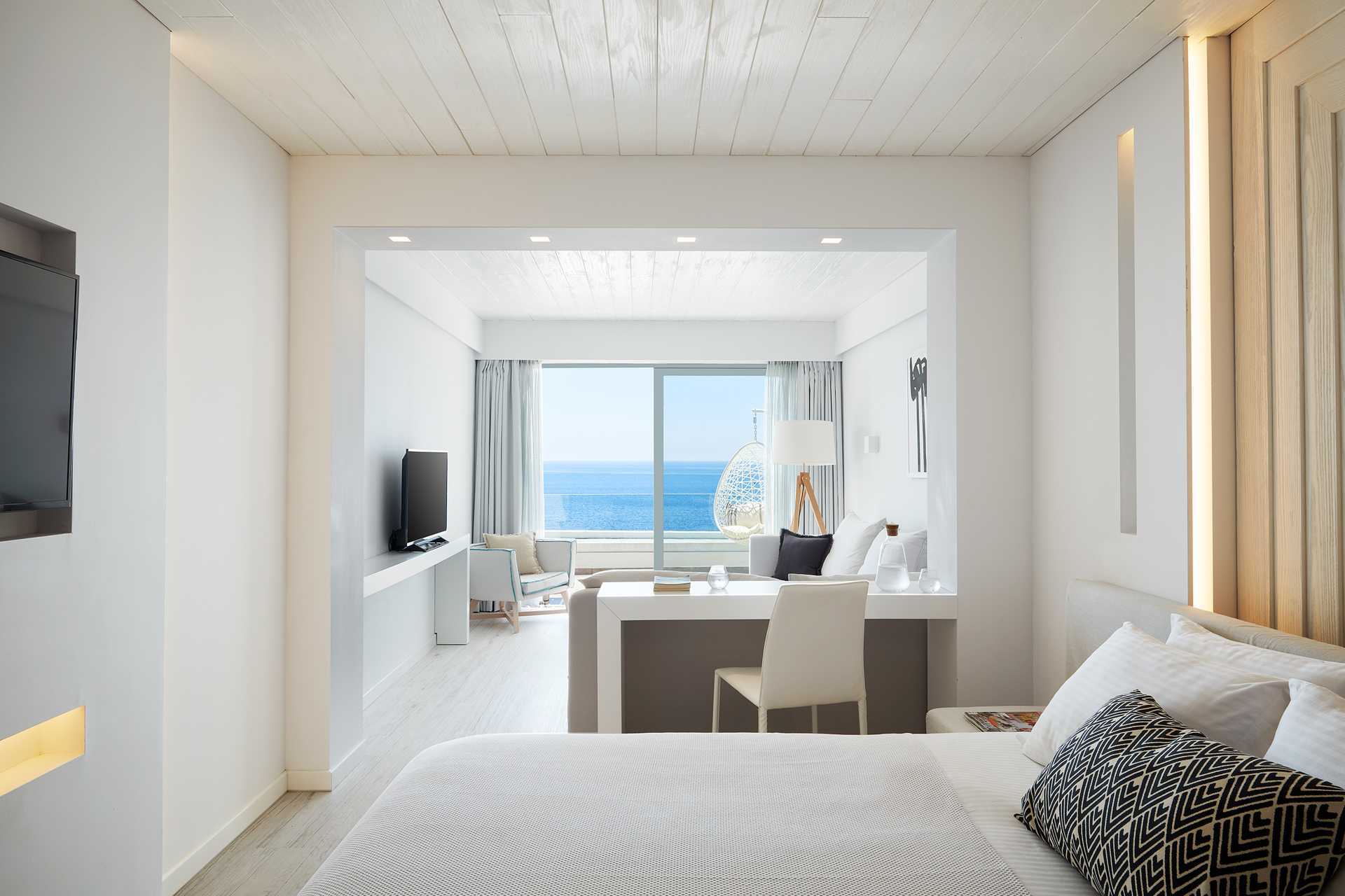 Junior-suite superior med balkon eller terrasse og havudsigt. Værelserne ligger i hovedbygningen ved poolen og har to dele, et soveværelsesområde og et opholdsområde, der kan adskilles med en skydedør af glas. En dobbeltseng eller to enkeltsenge. Mulighed for ekstra opredninger i sovesofa. Gratis wifi, aircondition og deponering. Køleskab. Tv med internationale kanaler. Tøfler. Hårtørrer. Badeværelse med bruser og toilet. Rengøring 7 gange om ugen.