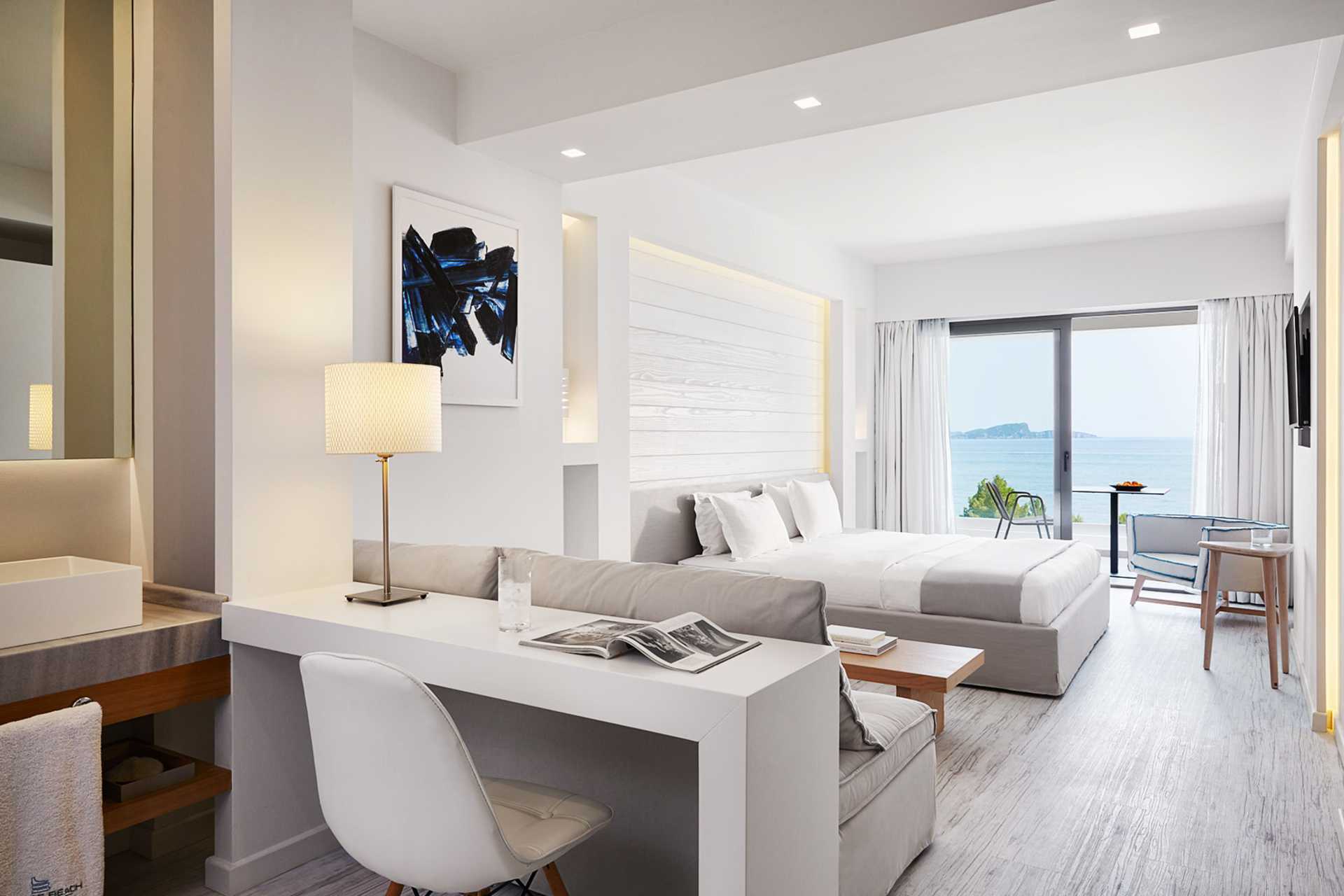 Superior-værelse med balkon og havudsigt. Værelserne ligger i hovedbygningen ved poolen. En dobbeltseng eller to enkeltsenge. Gratis wifi, aircondition og deponering. Køleskab. Tv med internationale kanaler. Tøfler. Hårtørrer. Badeværelse med bruser og toilet. Rengøring 7 gange om ugen.