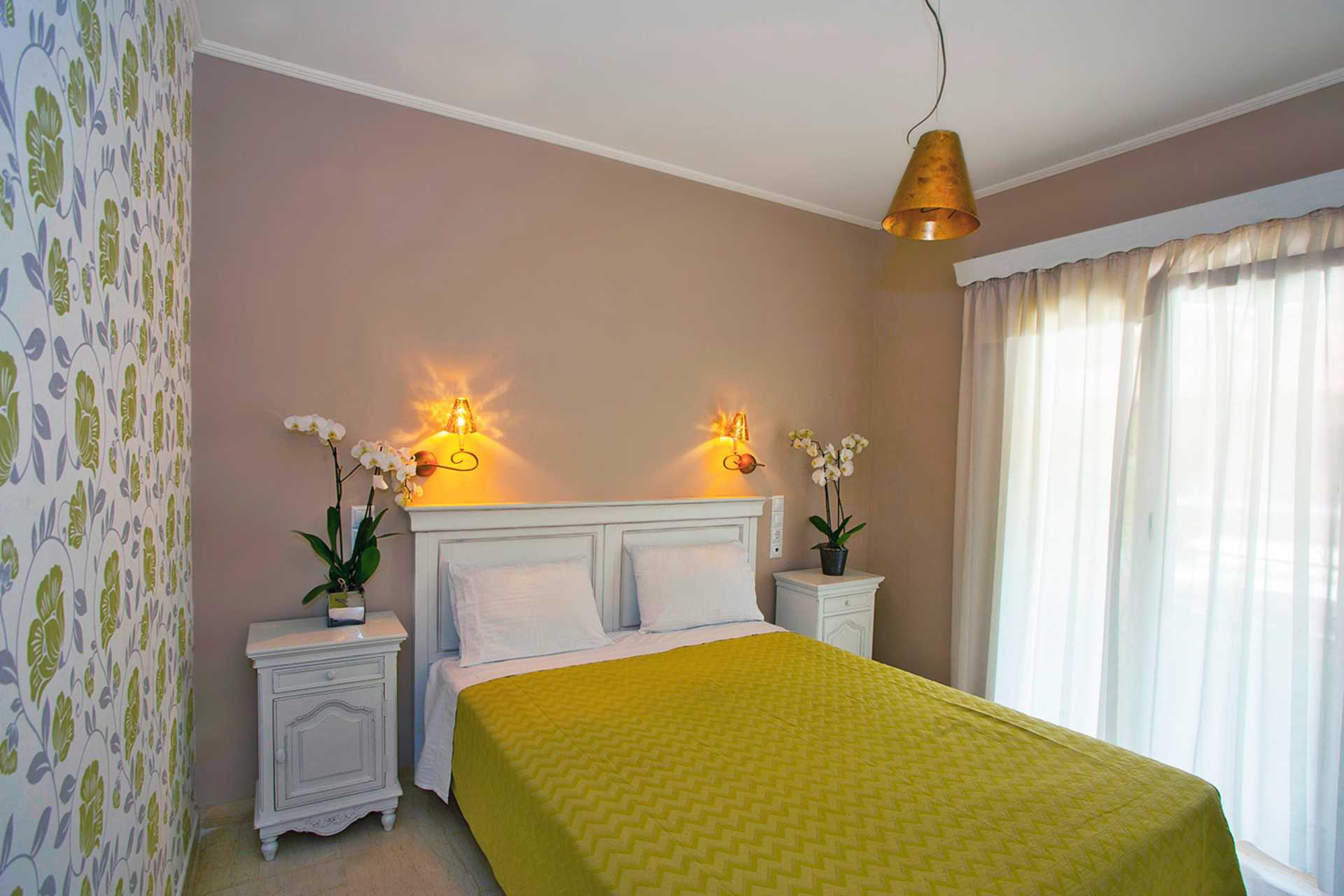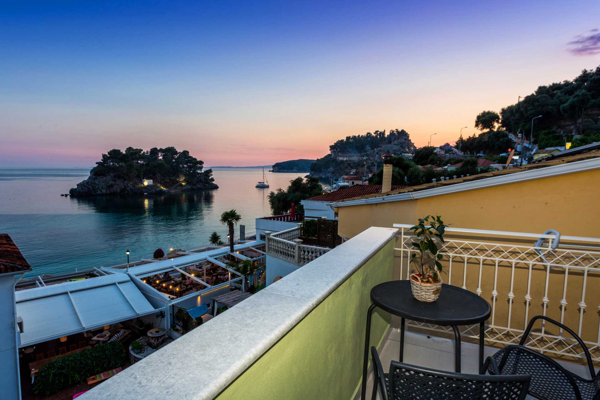 Familie-værelse i etage med balkon og havudsigt, beliggende lige ved siden af hotel Maistrali. I entréplan er der et opholdsrum med to sofaer, et minikøkken og et lille badeværelse med badekar og toilet. Ovenpå op af en trappe er der et soveværelse med to enkeltsenge, et badeværelse med bruser og to balkoner, hvoraf den ene har havudsigt. Gratis wifi, aircondition og deponering. Tv med internationale kanaler. Hårtørrer. Rengøring 7 gange om ugen.