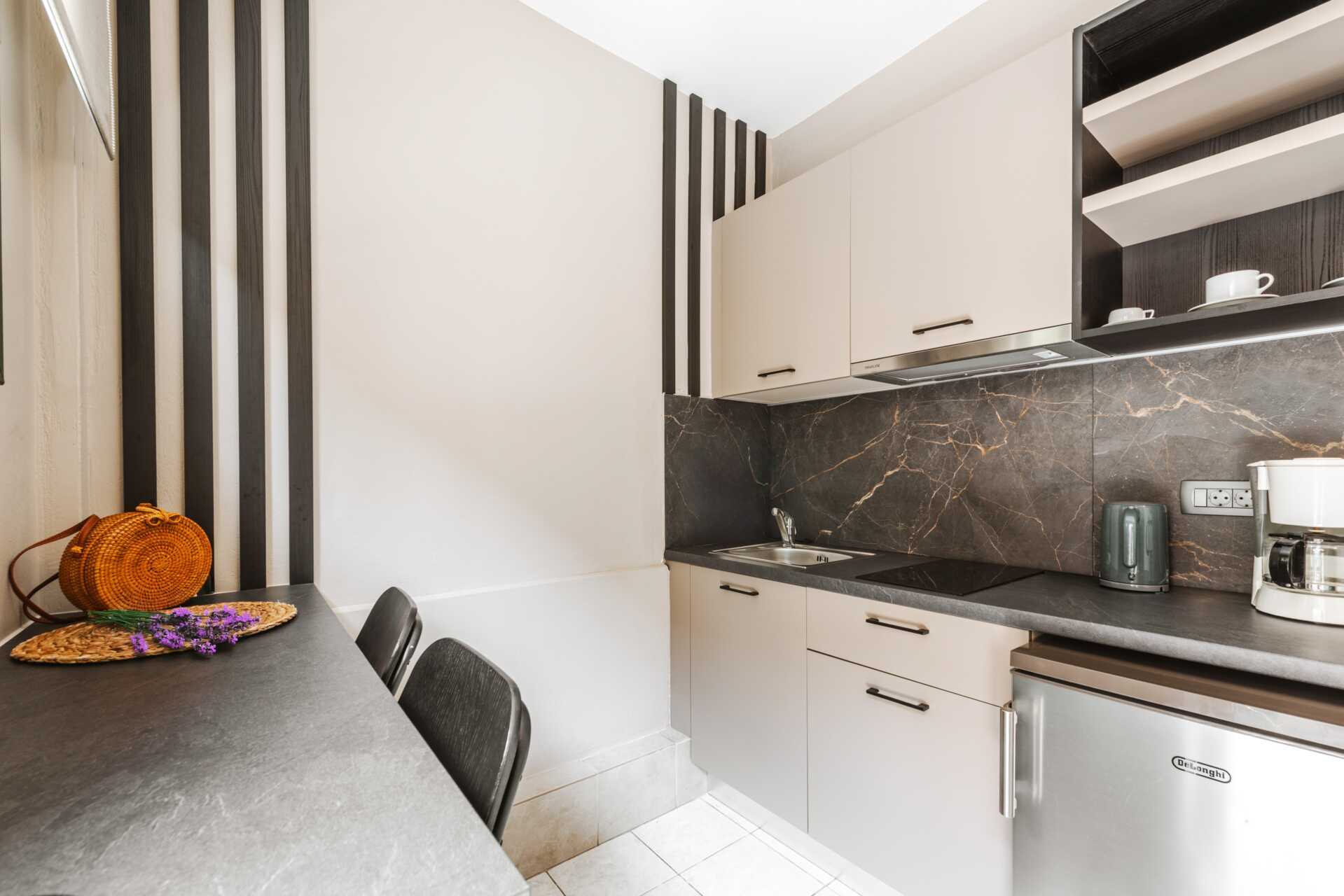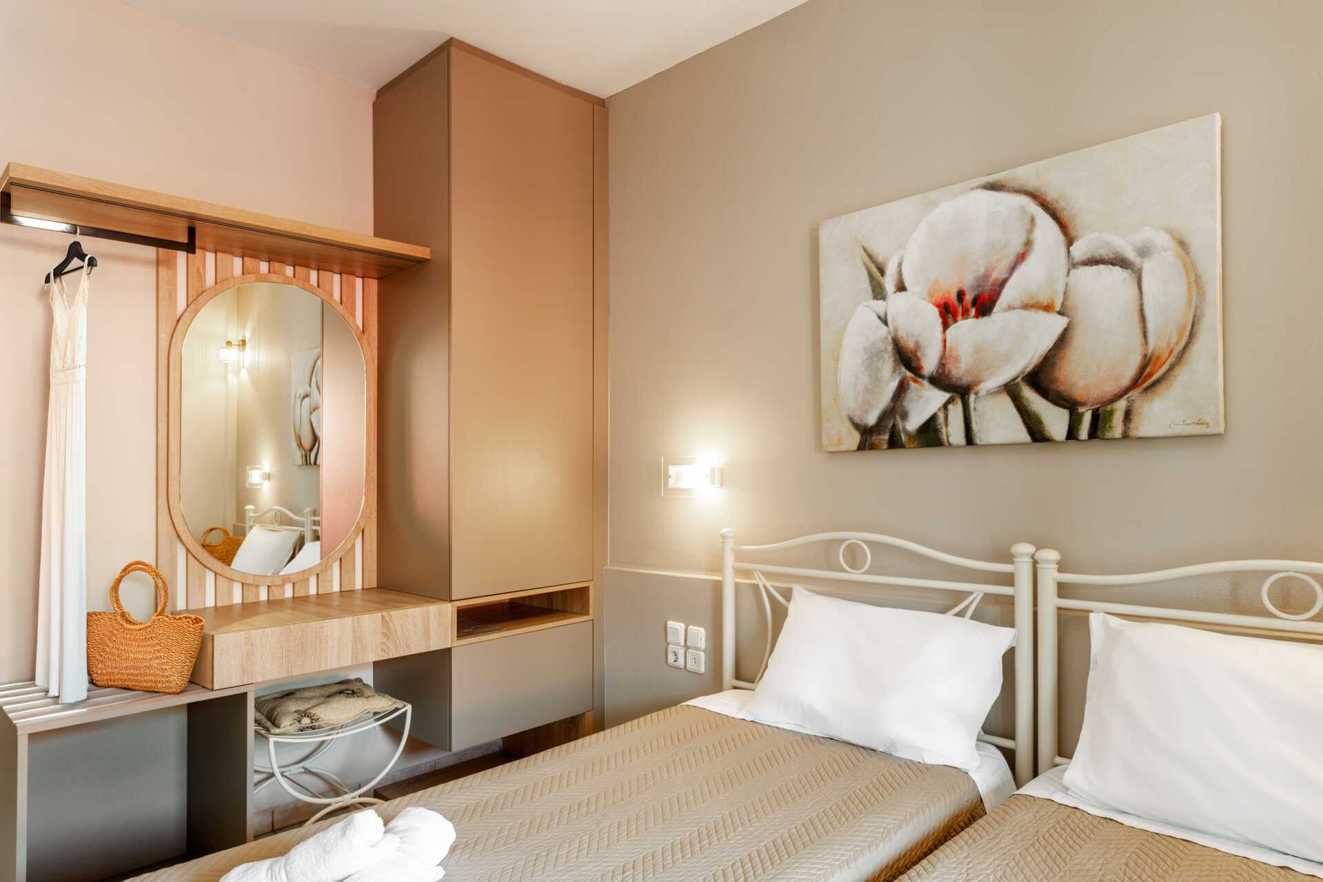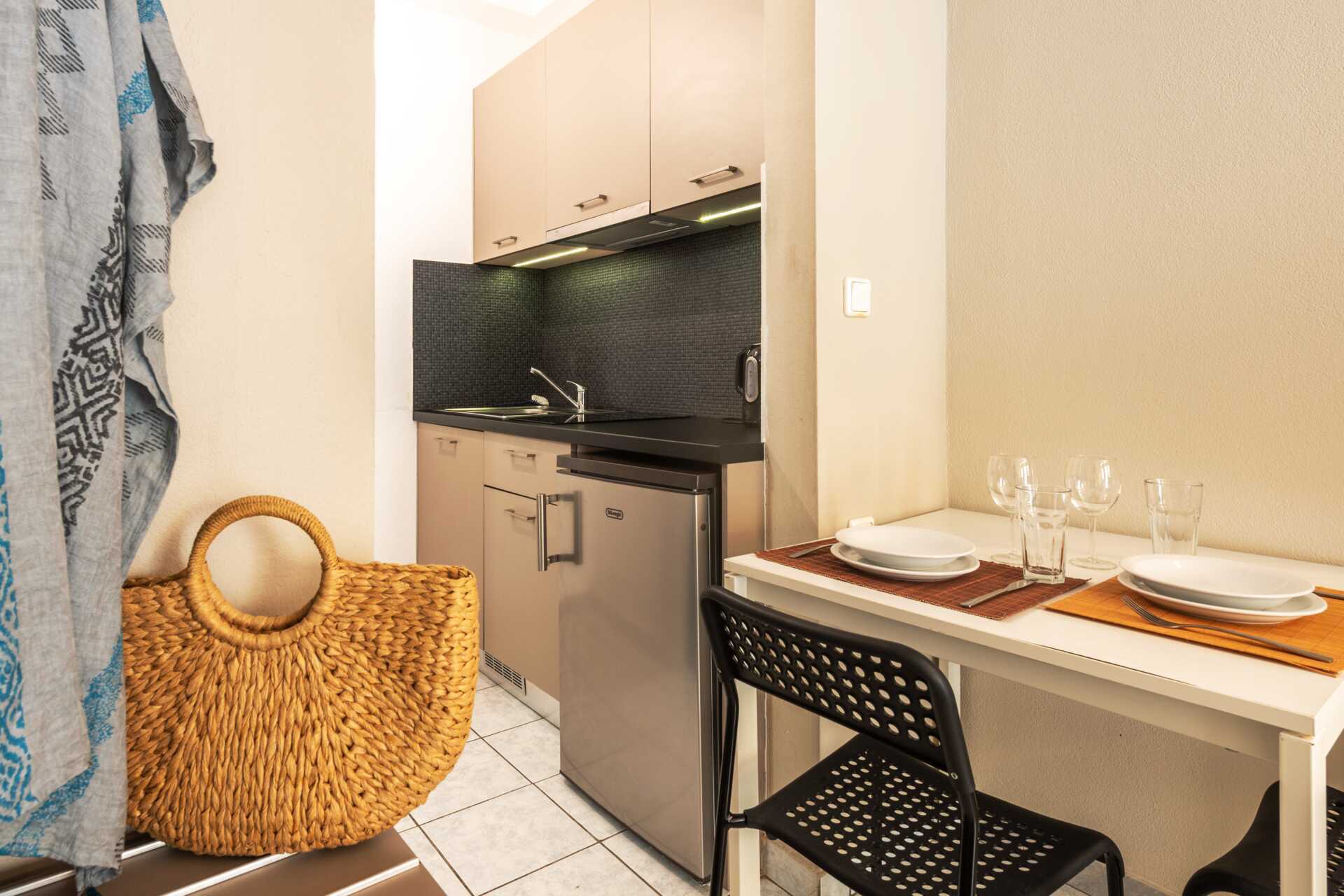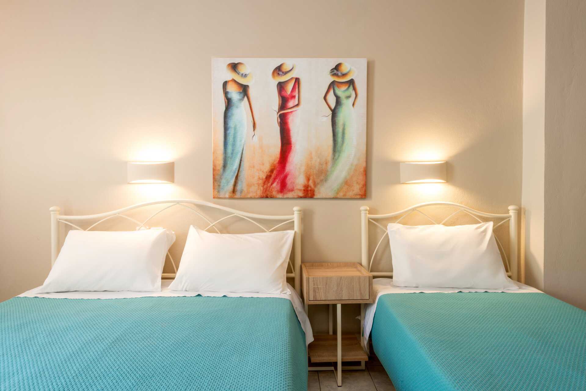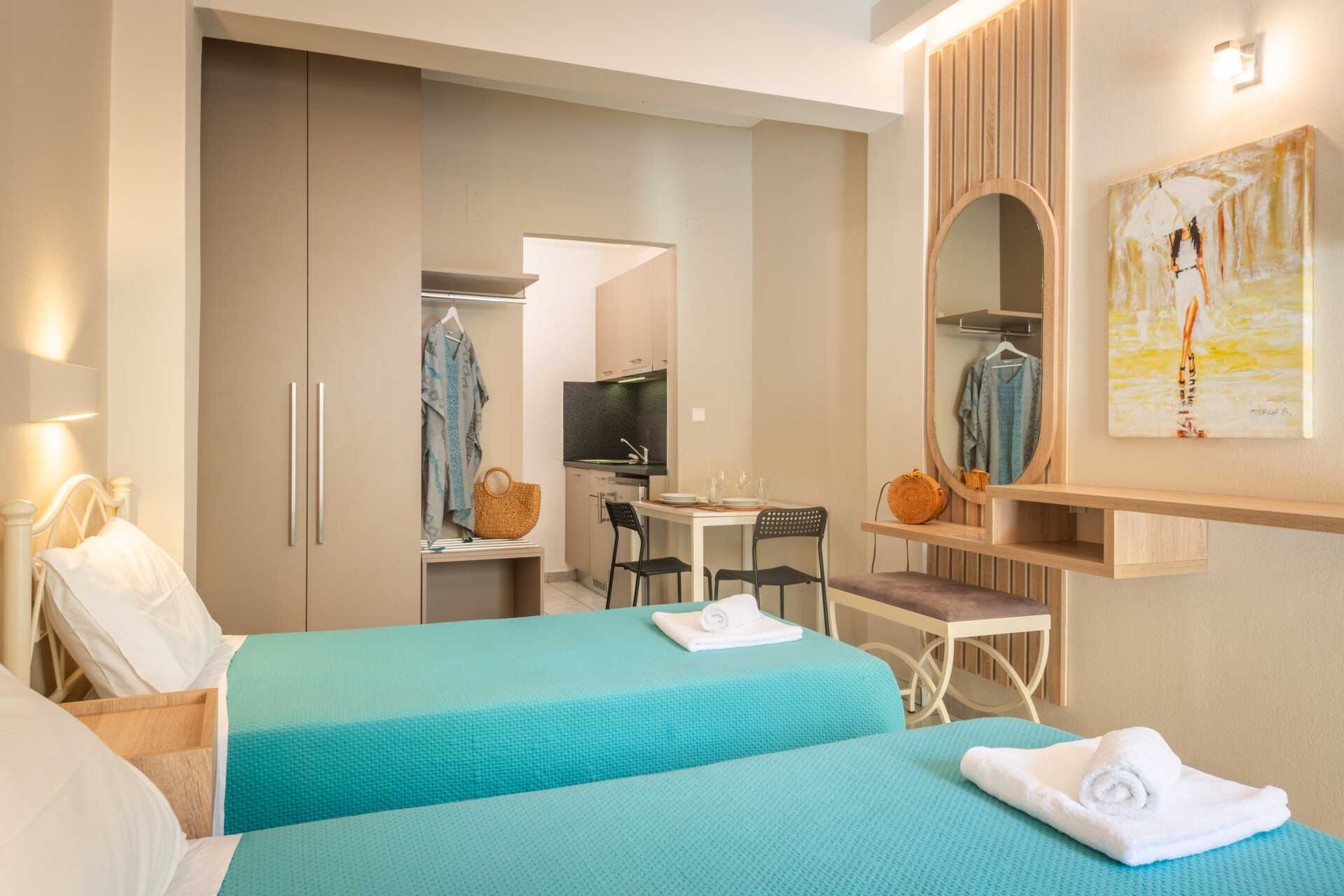 1-værelses lejlighed med balkon eller terrasse i stueplan. Soveværelse kombineret med minikøkken. To enkeltsenge eller, i en lejlighed, en mindre dobbeltseng. Minikøkken med kogeplader, køleskab, el-kedel, kaffemaskine og enkelt køkkenudstyr. Ovne er tilgængelige i nogle lejligheder. Gratis wifi. Aircondition og deponering mod betaling. Tv med internationale kanaler. Badeværelse med bruser og toilet. Rengøring 6 gange om ugen.