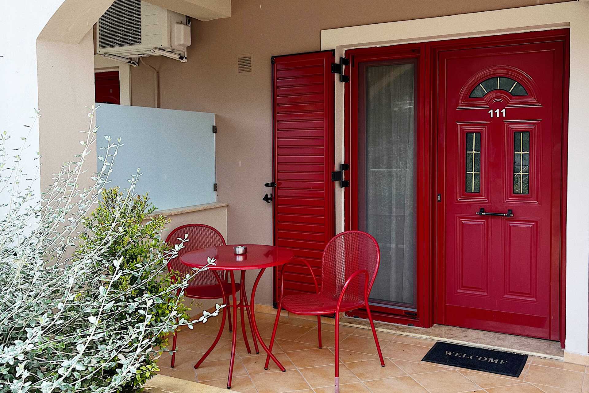 1-værelses lejligheder med terrasse på jorden. Soveværelse kombineret med minikøkken. En dobbeltseng. Minikøkken med komfur, ovn, køleskab, kaffemaskine, el-kedel og enkelt køkkenudstyr. Gratis wifi, aircondition og deponering. Tv med internationale kanaler. Hårtørrer. Badeværelse med bruser og toilet. Rengøring 6 gange om ugen.