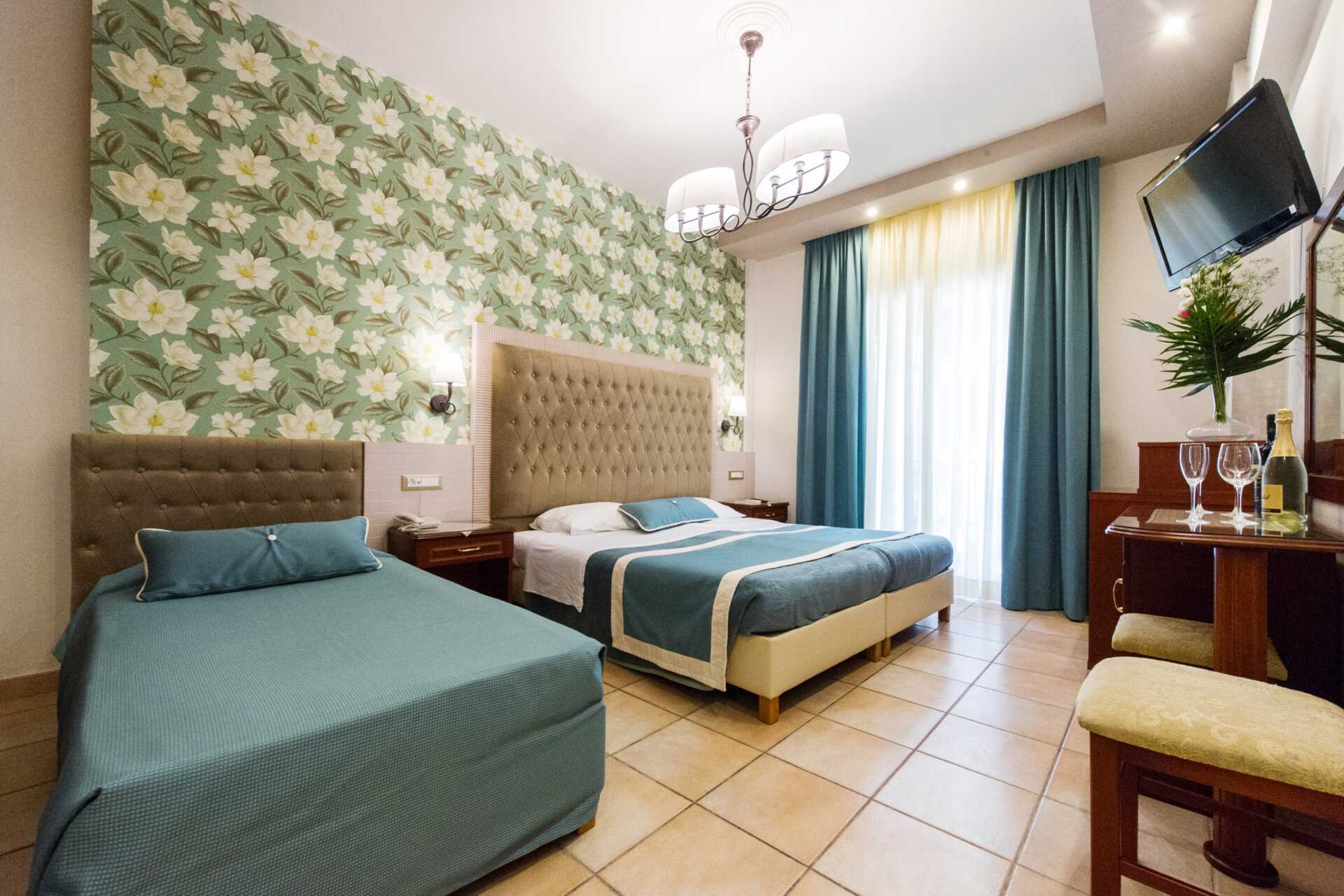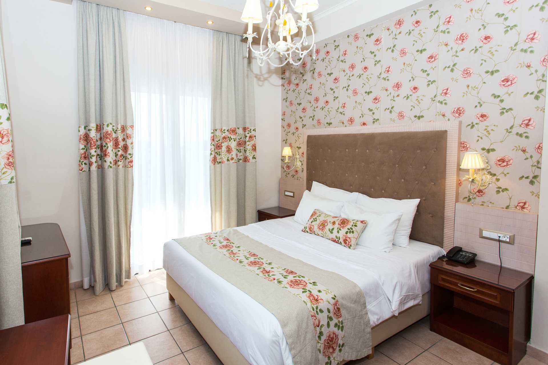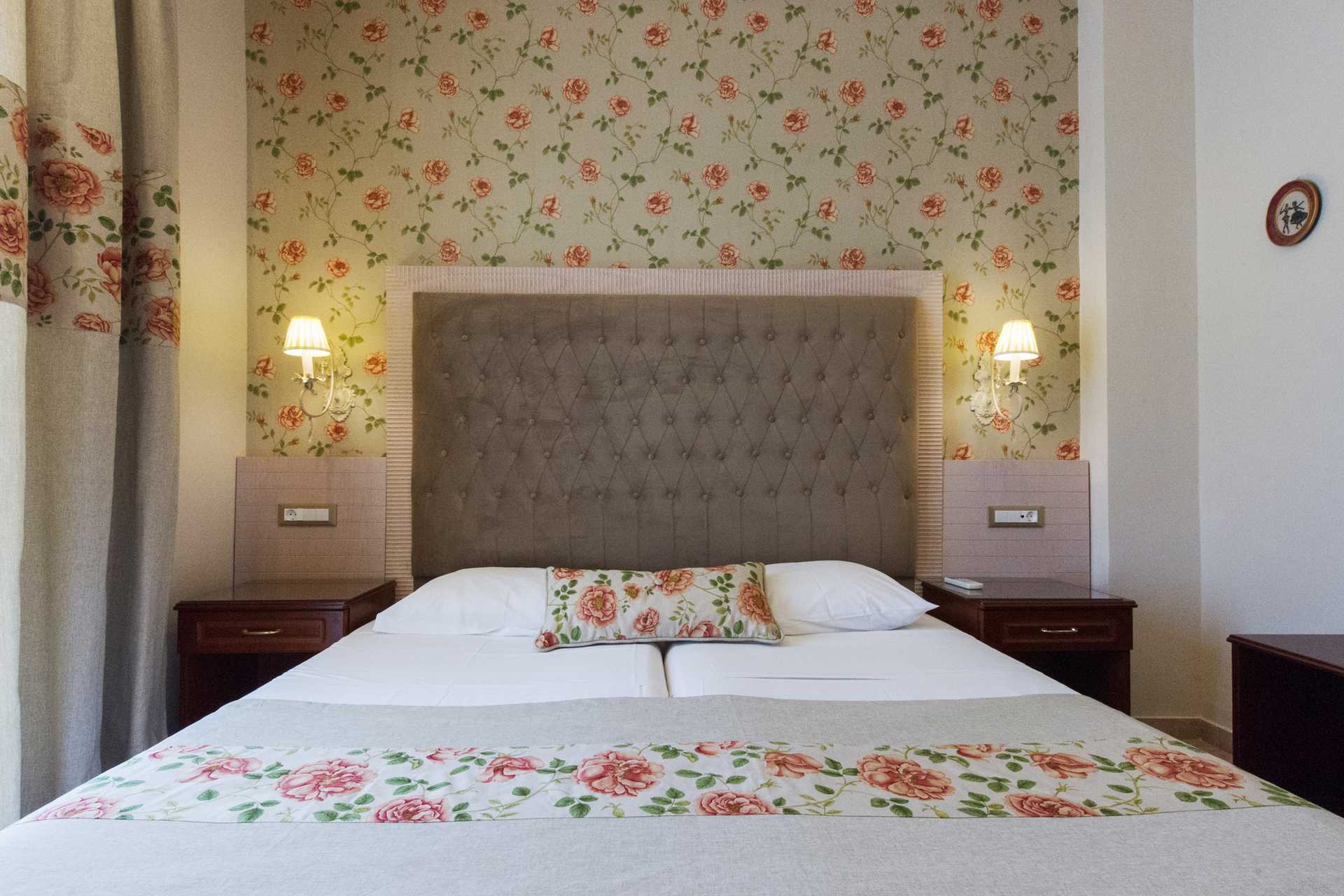 Dobbeltværelse med balkon, nogle af balkonerne ligger tæt på hinanden. En dobbeltseng eller to enkeltsenge. Mulighed for ekstra opredning i sovesofa. Køleskab. Gratis wifi, aircondition og deponering. Tv med internationale kanaler. Hårtørrer. Lille badeværelse med bruser eller lille badekar og toilet. Rengøring 7 gange om ugen.