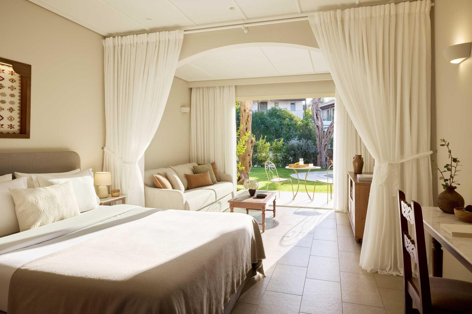 Deluxe-suite med balkon eller terrasse. Junior-suiterne består af et soveværelse og et opholdsrum, der kan adskilles med en skydedør. En dobbeltseng. Mulighed for ekstra opredninger i sovesofa. Pudemenu. Gratis wifi, aircondition og deponering. Minibar. Nespresso-maskine, kapsler mod betaling. El-kedel og kaffe/te. Tv med internationale kanaler. Badekåber og tøfler. Hårtørrer. Badeværelse med bruser og toilet. Rengøring 7 gange om ugen. Suiterne er placeret i en separat bygning og en mindre vej med begrænset trafik skal krydses for at nå stranden og andre dele af hotellet.