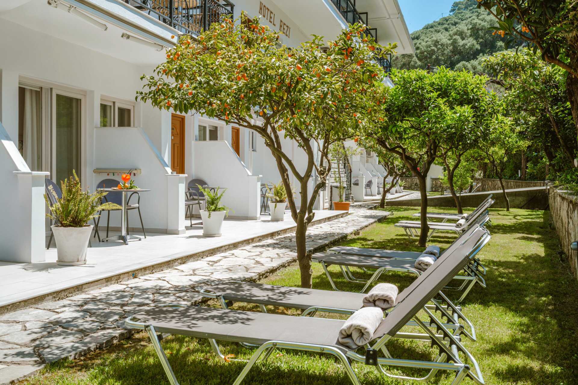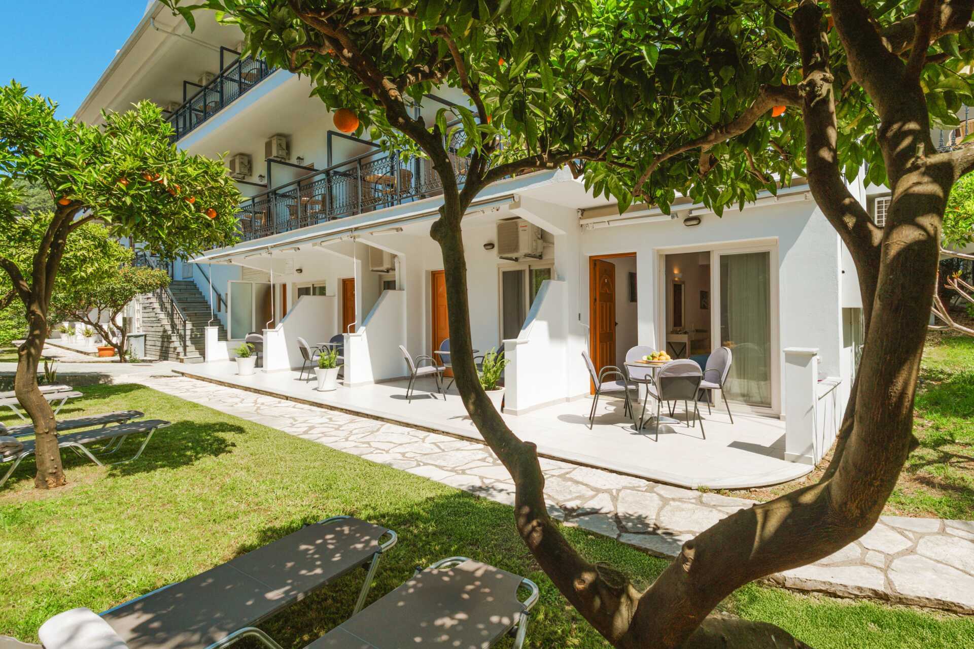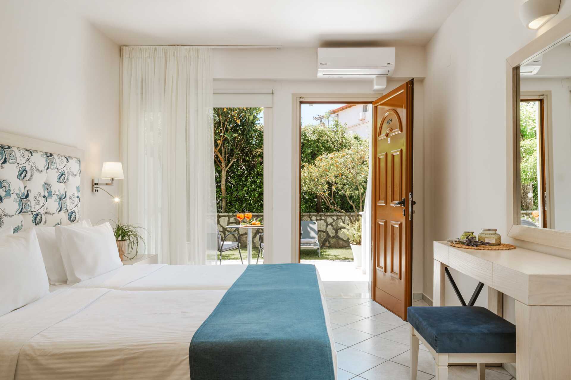 2-værelses lejligheder med terrasse og udsigt til haven. Et soveværelse med to enkeltsenge og et kombineret opholdsrum og minikøkken med yderligere to enkeltsenge. Minikøkken med kogeplader, køleskab, el-kedel, kaffemaskine, brødrister og enkelt køkkenudstyr. Gratis wifi og aircondition. Deponering mod betaling. Tv med internationale kanaler. Hårtørrer. Badeværelse med bruser og toilet. Rengøring 7 gange om ugen.