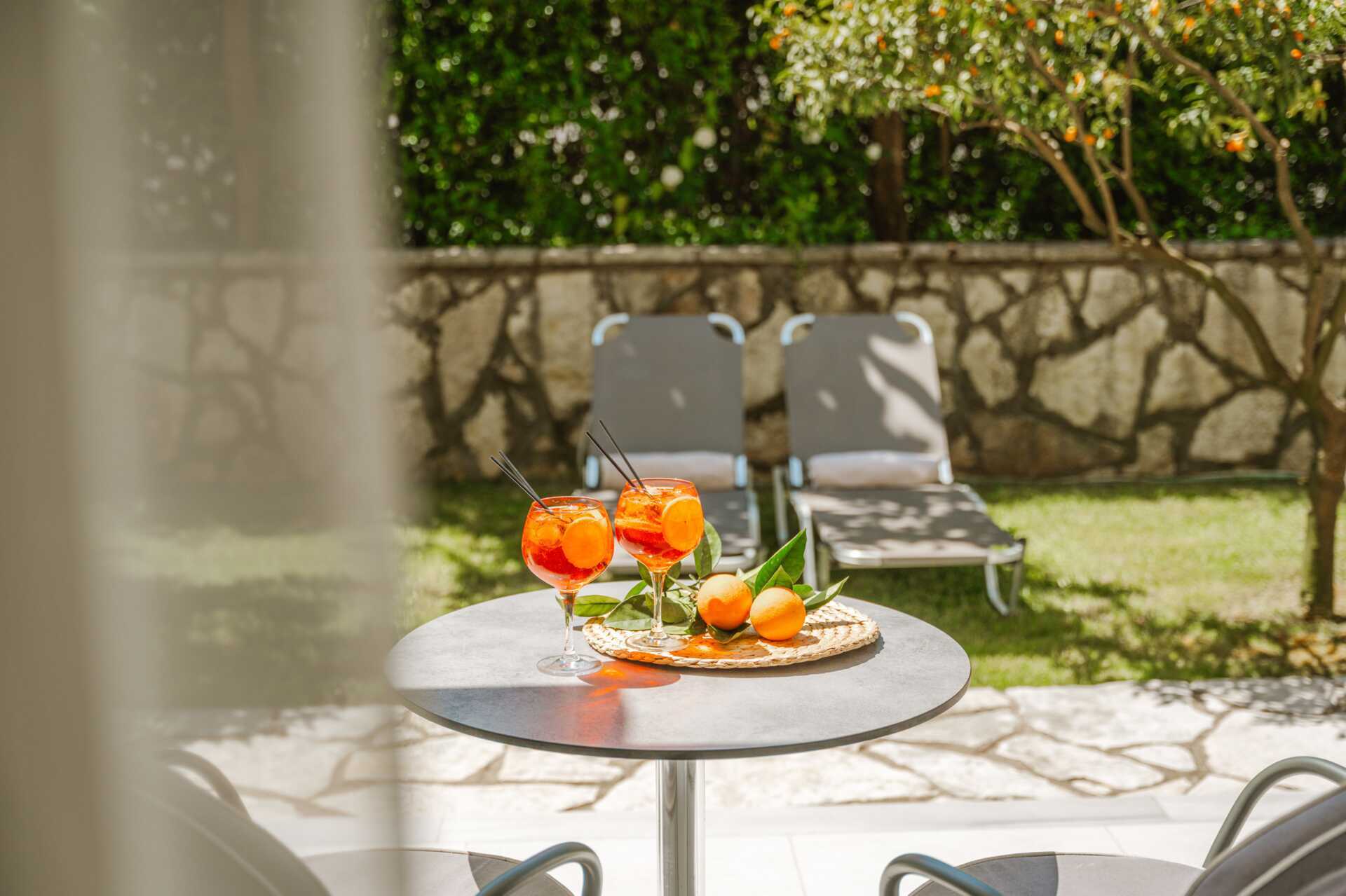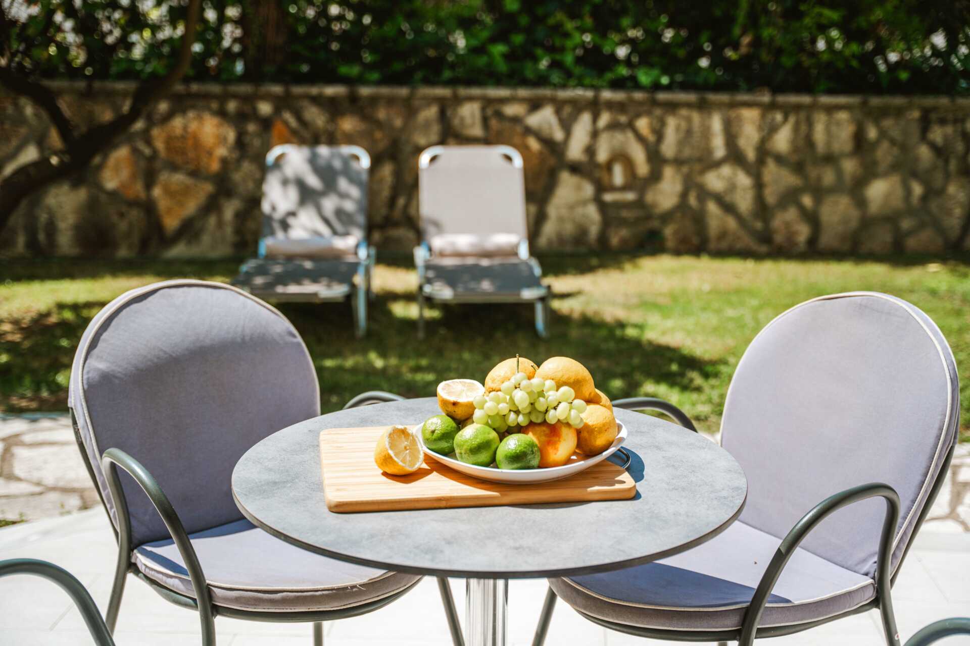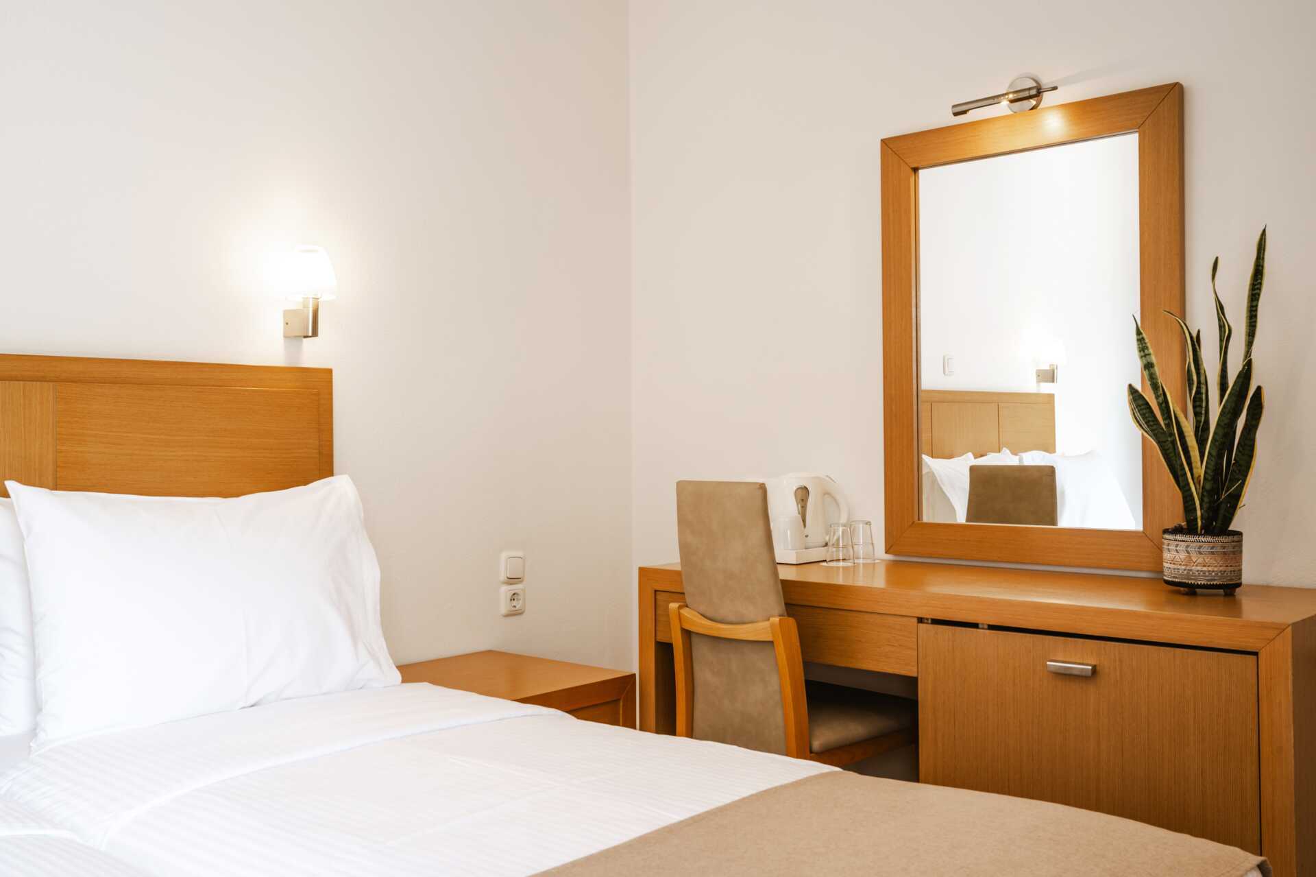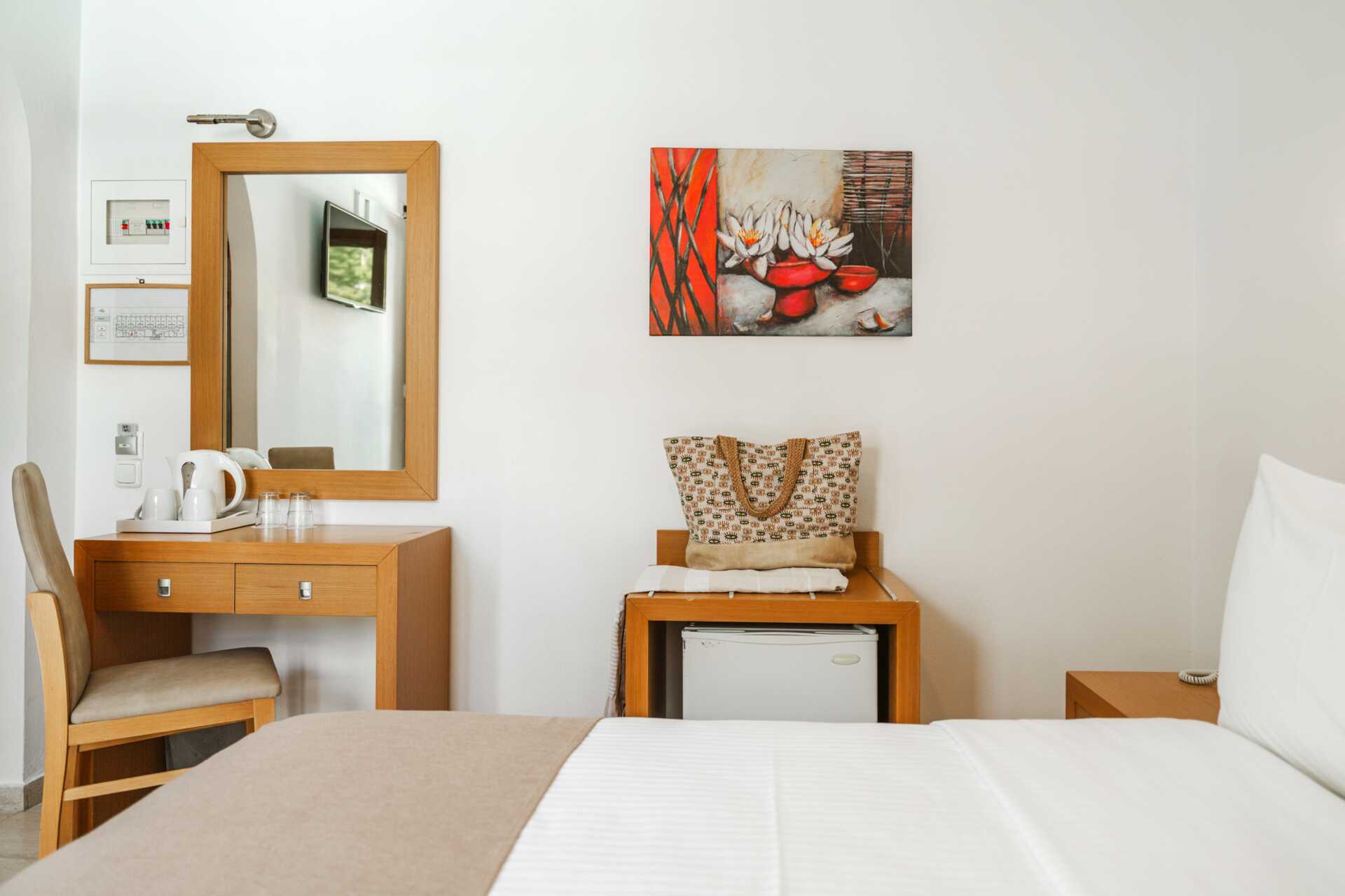 2-værelses lejligheder med terrasse og udsigt til haven. Et soveværelse med to enkeltsenge og et kombineret opholdsrum og minikøkken med yderligere to enkeltsenge. Minikøkken med kogeplader, køleskab, el-kedel, kaffemaskine, brødrister og enkelt køkkenudstyr. Gratis wifi og aircondition. Deponering mod betaling. Tv med internationale kanaler. Hårtørrer. Badeværelse med bruser og toilet. Rengøring 7 gange om ugen.