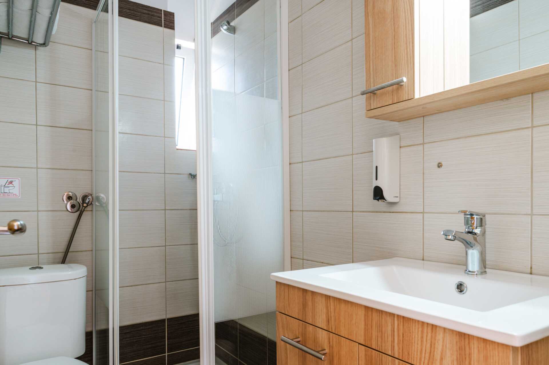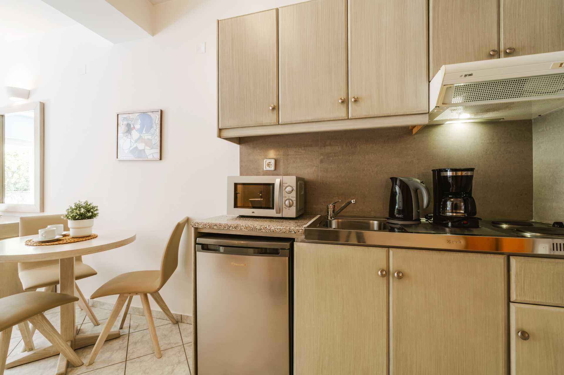 1-værelses lejlighed med terrasse med udsigt over haven. Et soveværelse og et kombineret opholdsrum med minikøkken. To enkeltsenge. Minikøkken med kogeplader, køleskab og fryser, mikroovn, el-kedel, kaffemaskine, brødrister og enkelt køkkenudstyr. Gratis wifi og aircondition. Deponering mod betaling. Tv med internationale kanaler. Hårtørrer. Badeværelse med bruser og toilet. Rengøring 7 gange om ugen.