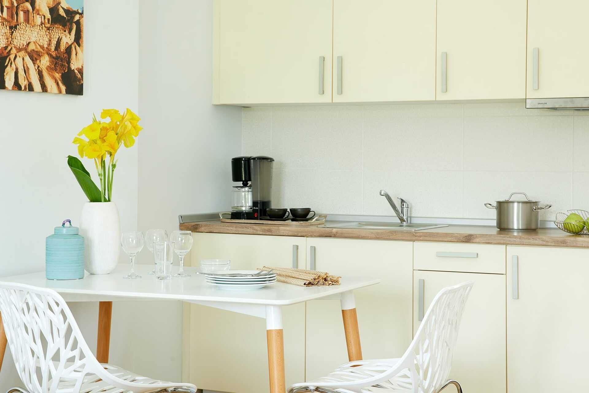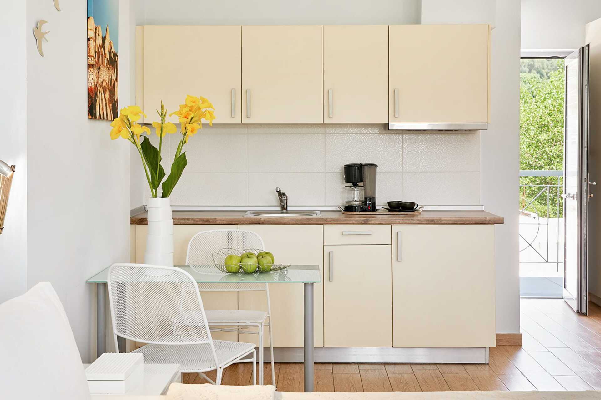 1-værelses lejligheder med balkon eller terrasse. Soveværelse kombineret med minikøkken. Lejlighederne har forskellige planløsninger. En dobbeltseng eller to enkeltsenge. Pudemenu. Tv med internationale kanaler. Minikøkken med køleskab, kogeplader, enkelt køkkenudstyr, Nespressomaskine og el-kedel. Gratis wifi, aircondition og deponering. Hårtørrer. Badekåber og tøfler. Badeværelse med badekar og toilet. Rengøring 7 gange om ugen.