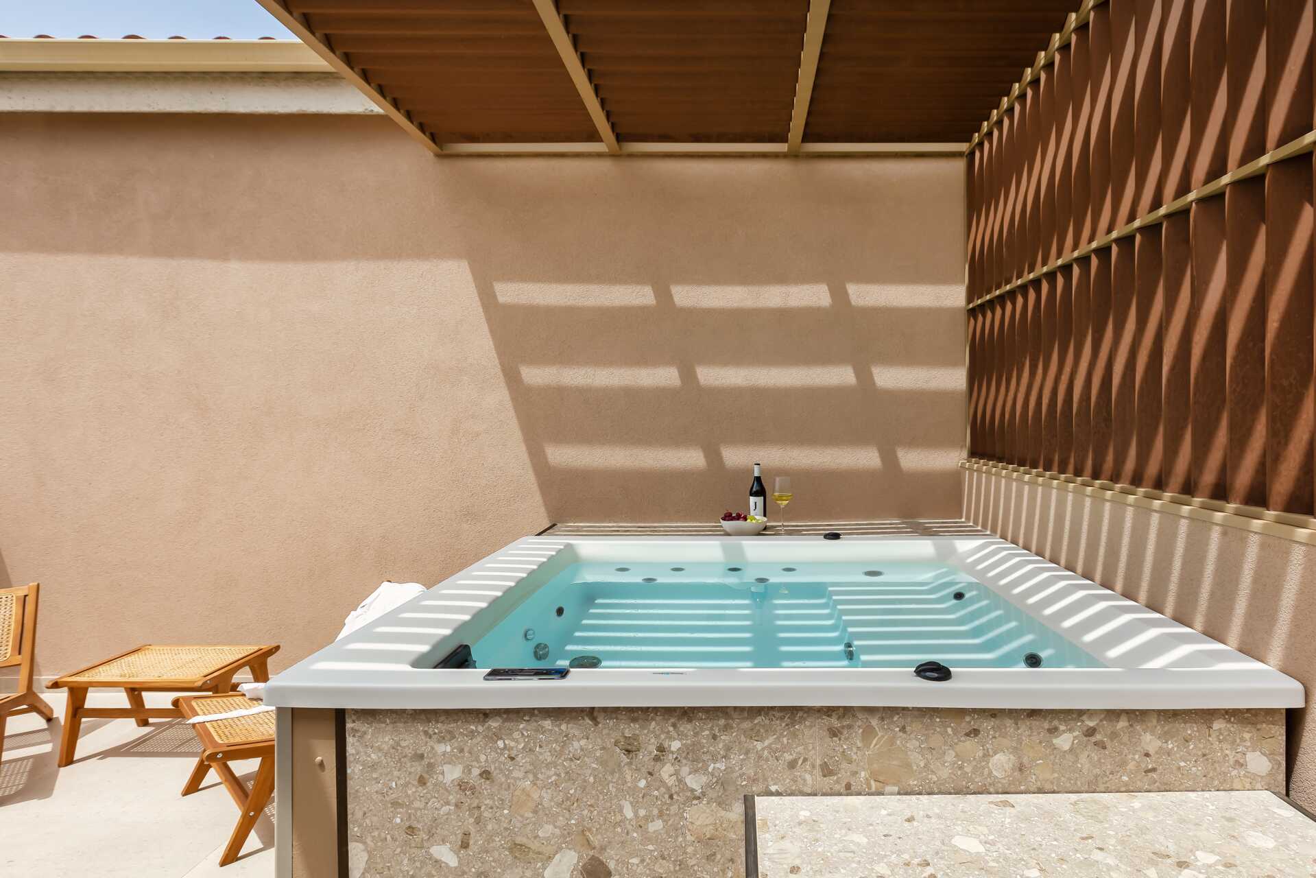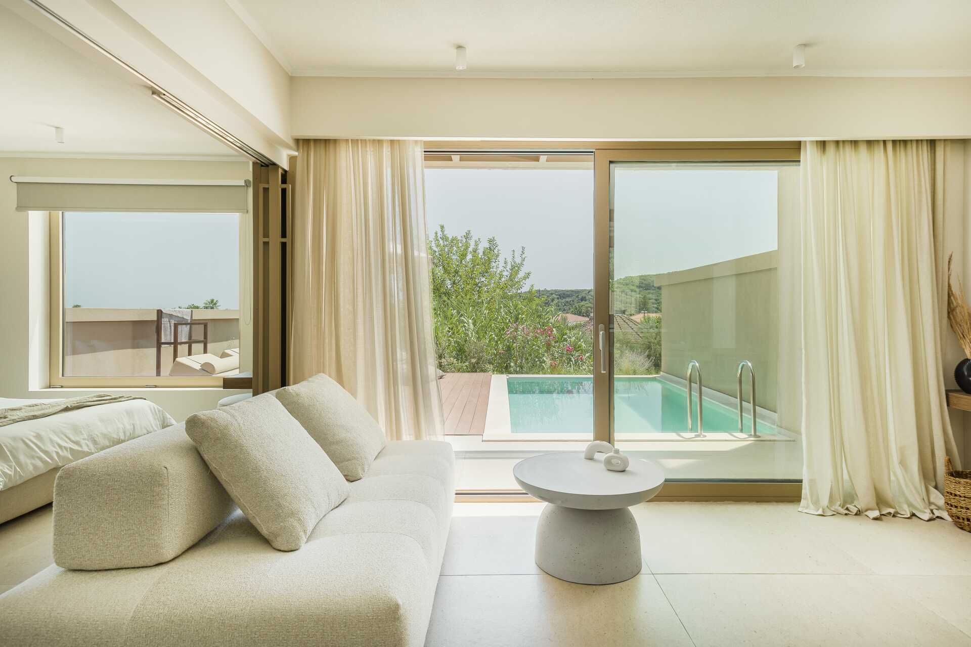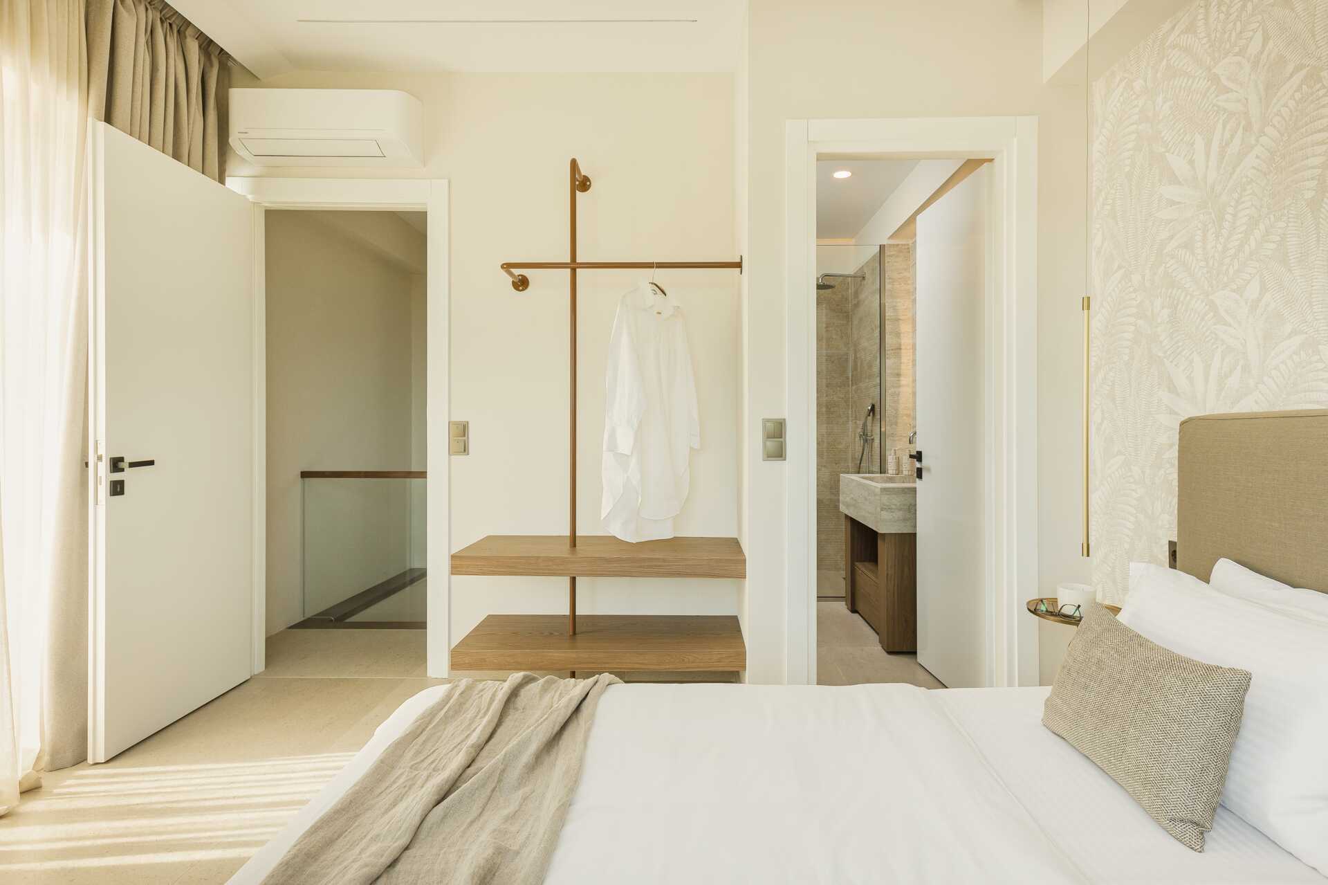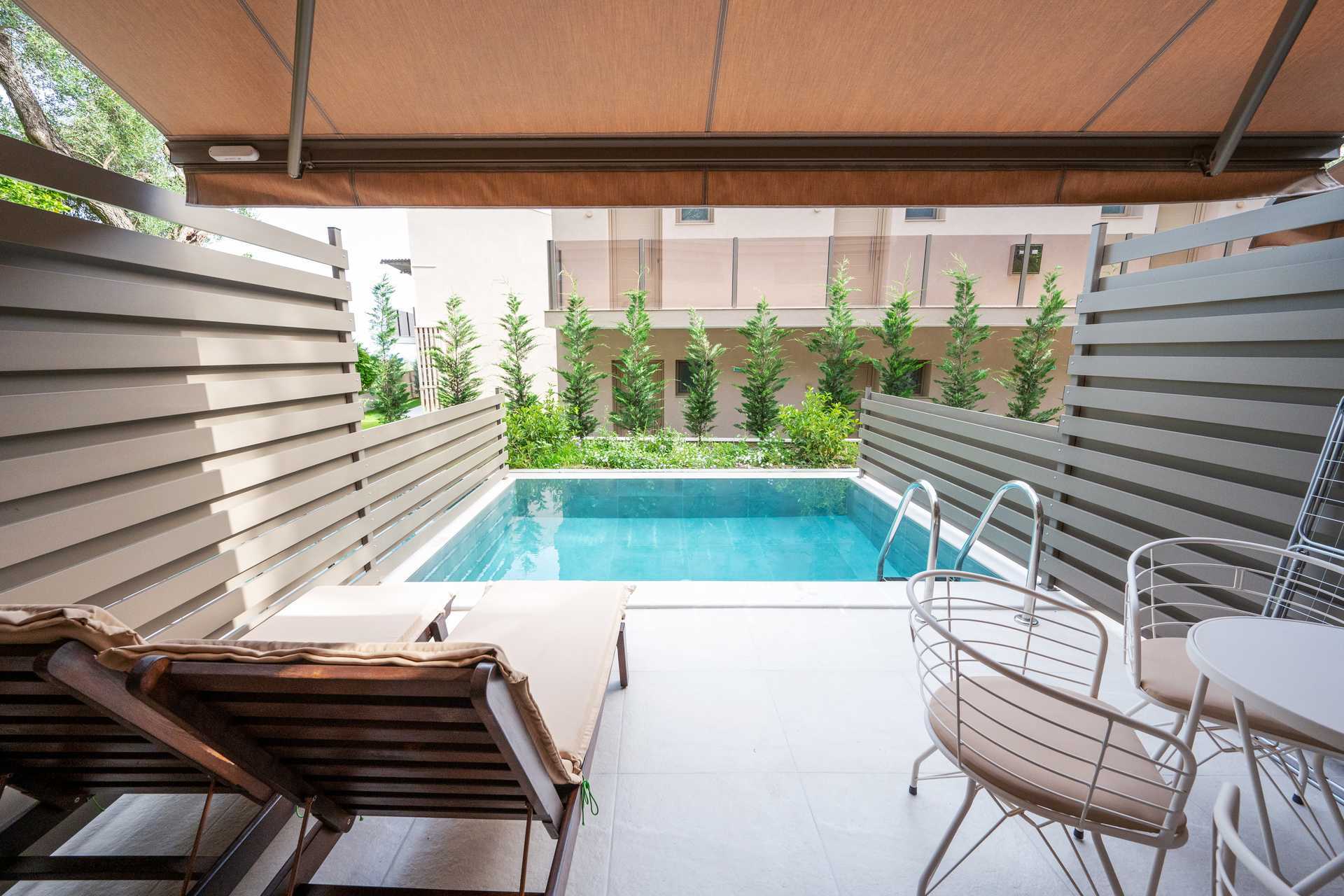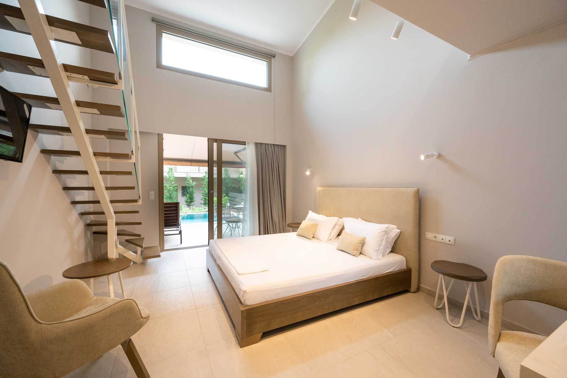 Suiter med terrasse i stueplan, solstole og privat pool. En dobbeltseng på stueplan og en hems med endnu en dobbeltseng ovenpå. Gratis wifi, aircondition (på øverste niveau) og deponering. Køleskab. El-kedel og kaffe/te. Espressomaskine. Tv med internationale kanaler. Hårtørrer. Badeværelse med bruser og toilet. Rengøring 7 gange om ugen.