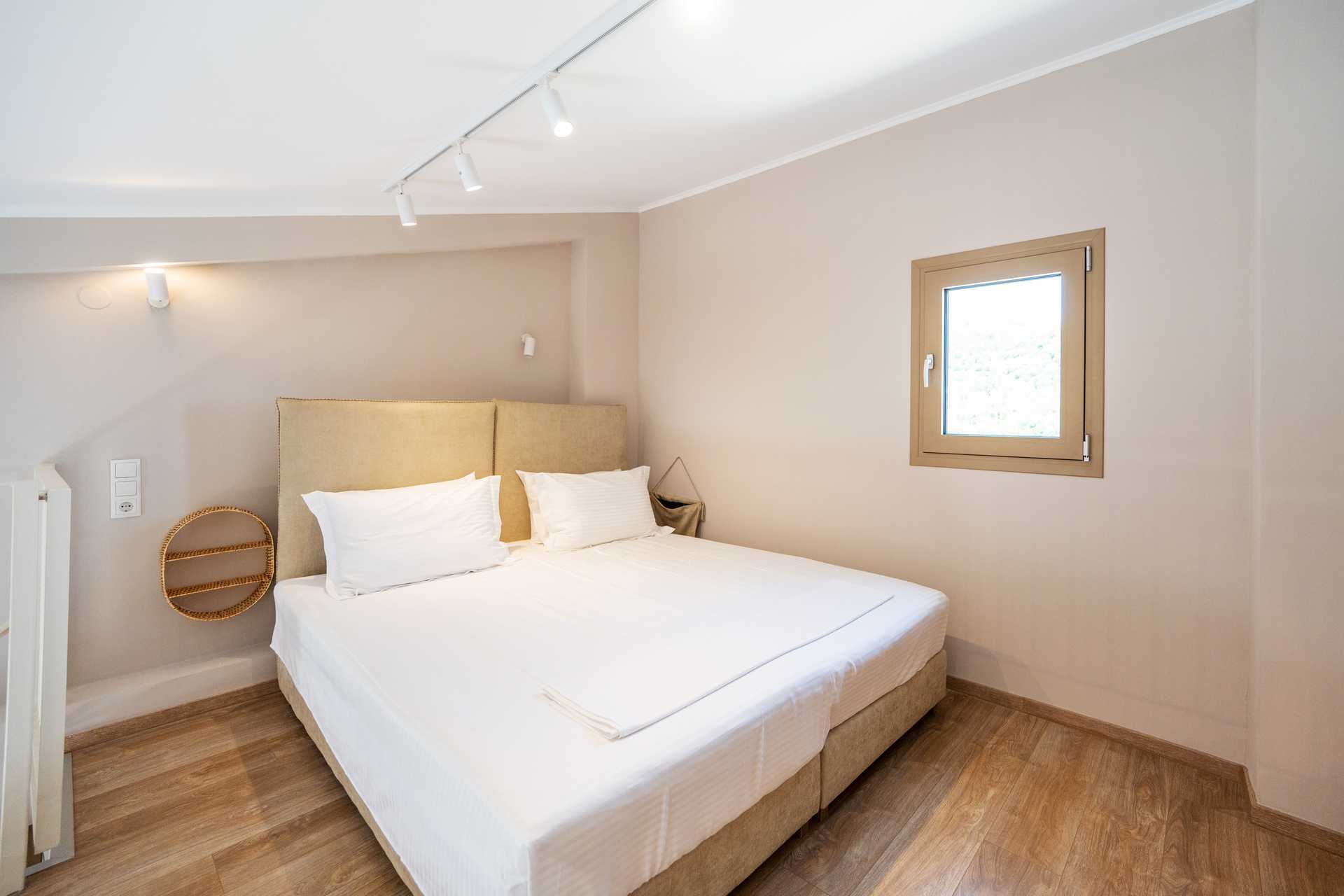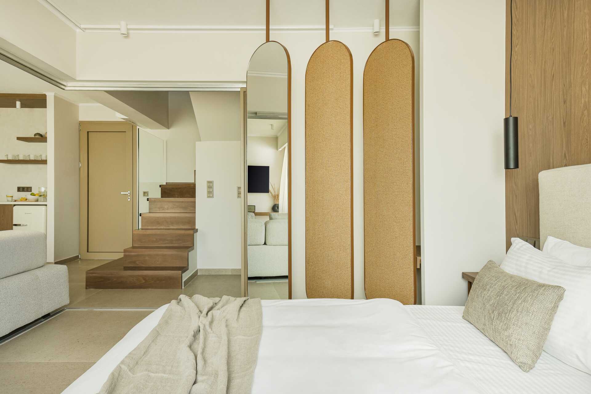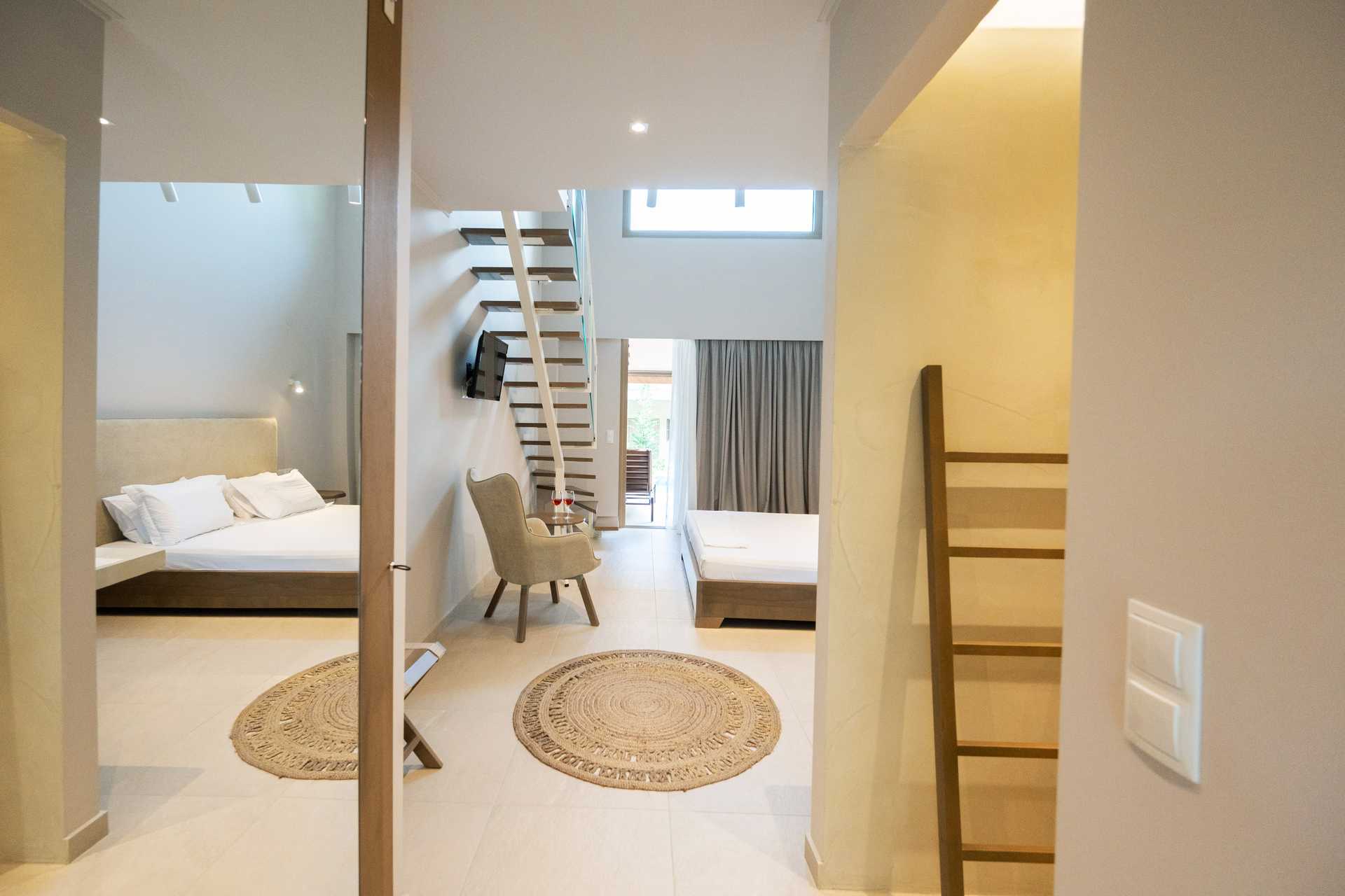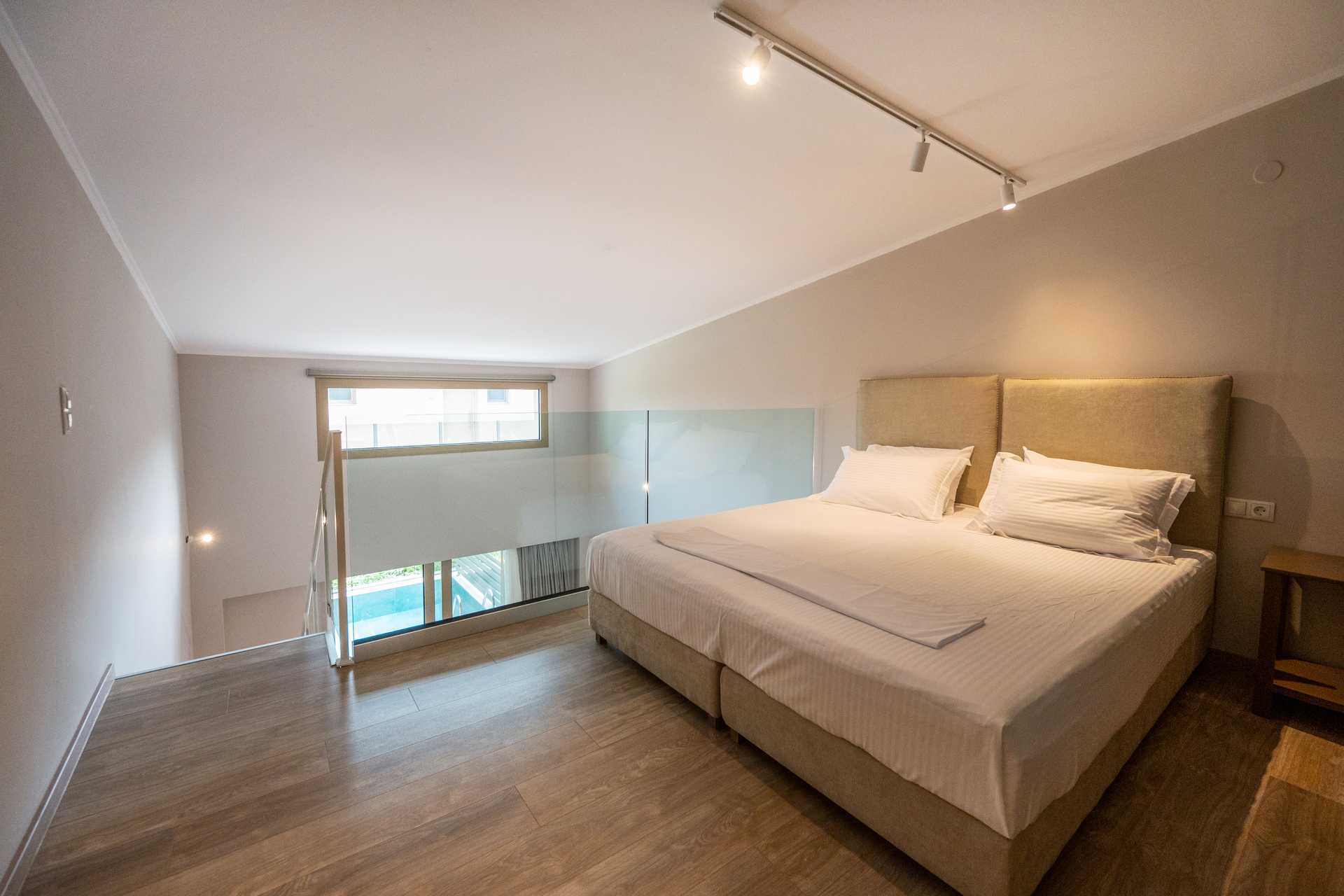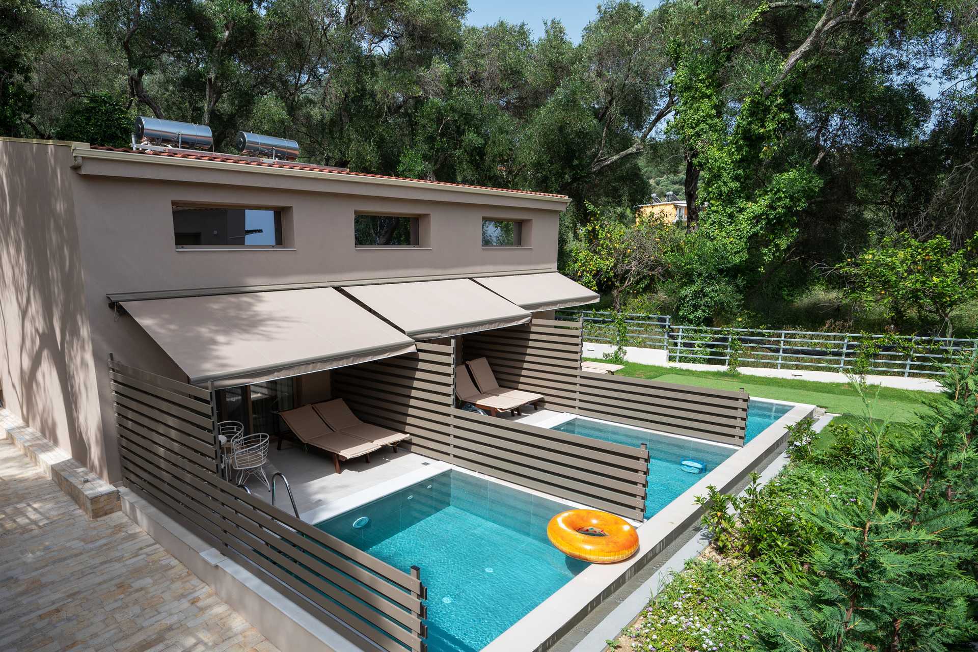Suiter med terrasse i stueplan, solstole og privat pool. En dobbeltseng på stueplan og en hems med endnu en dobbeltseng ovenpå. Gratis wifi, aircondition (på øverste niveau) og deponering. Køleskab. El-kedel og kaffe/te. Espressomaskine. Tv med internationale kanaler. Hårtørrer. Badeværelse med bruser og toilet. Rengøring 7 gange om ugen.