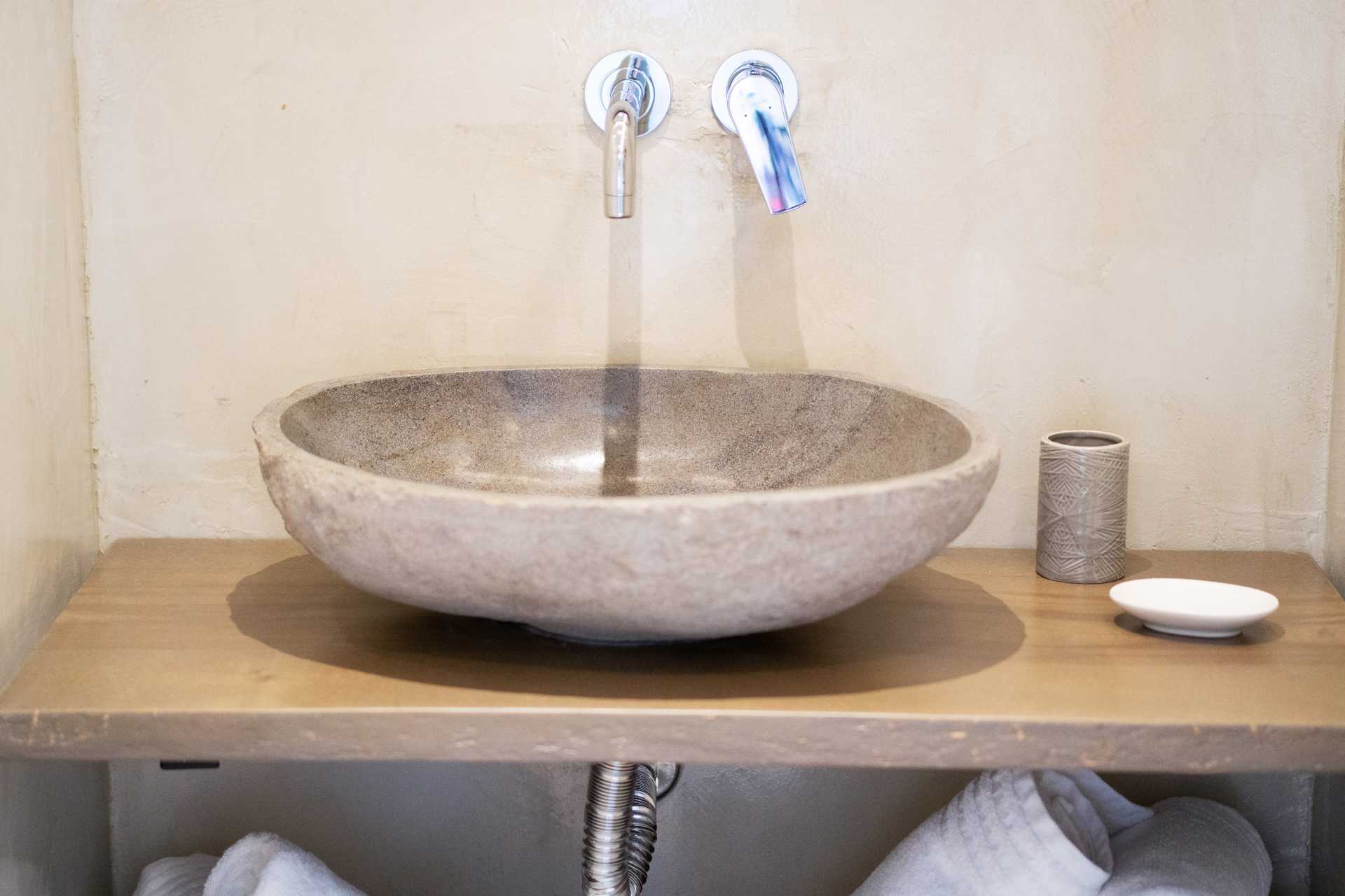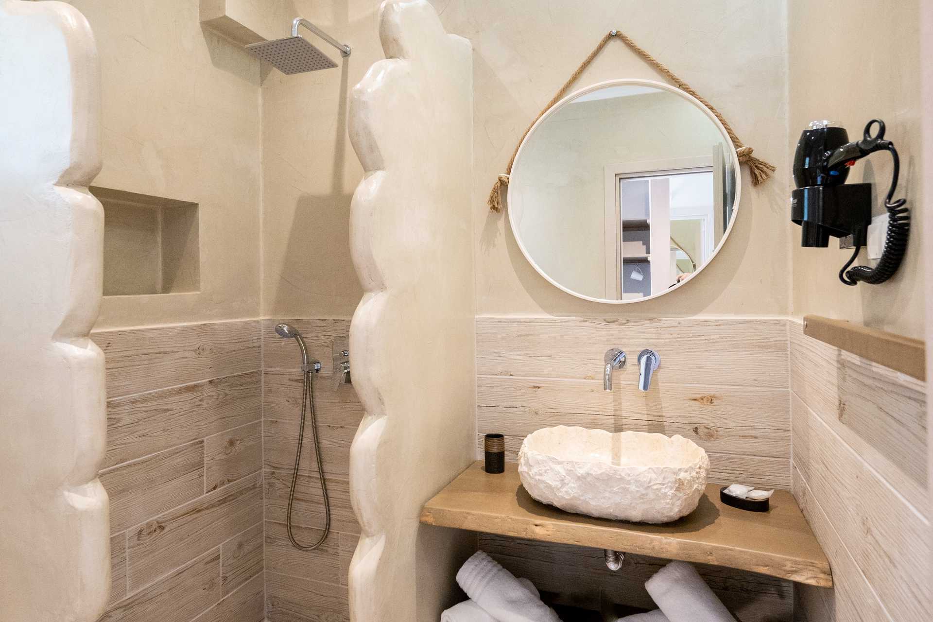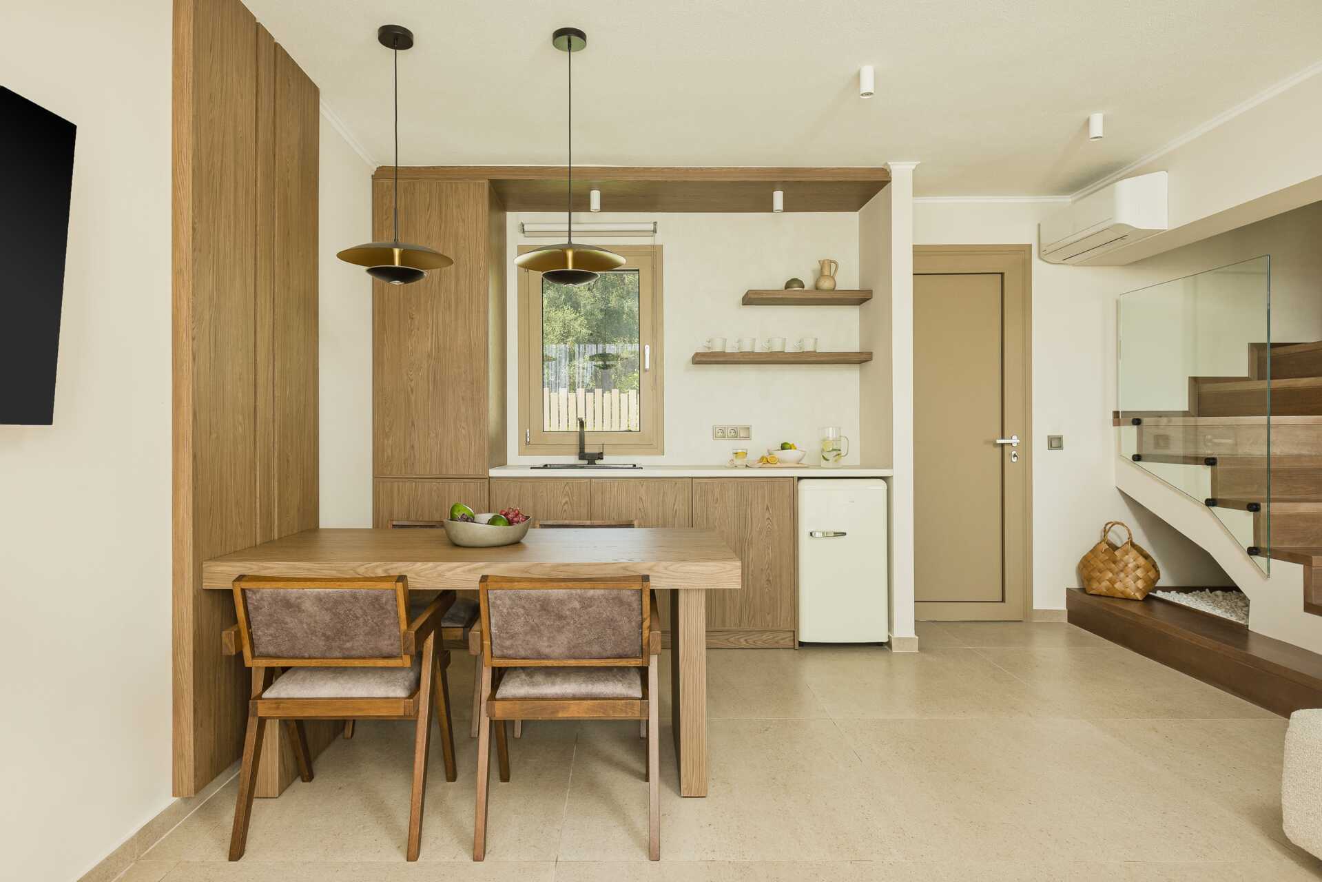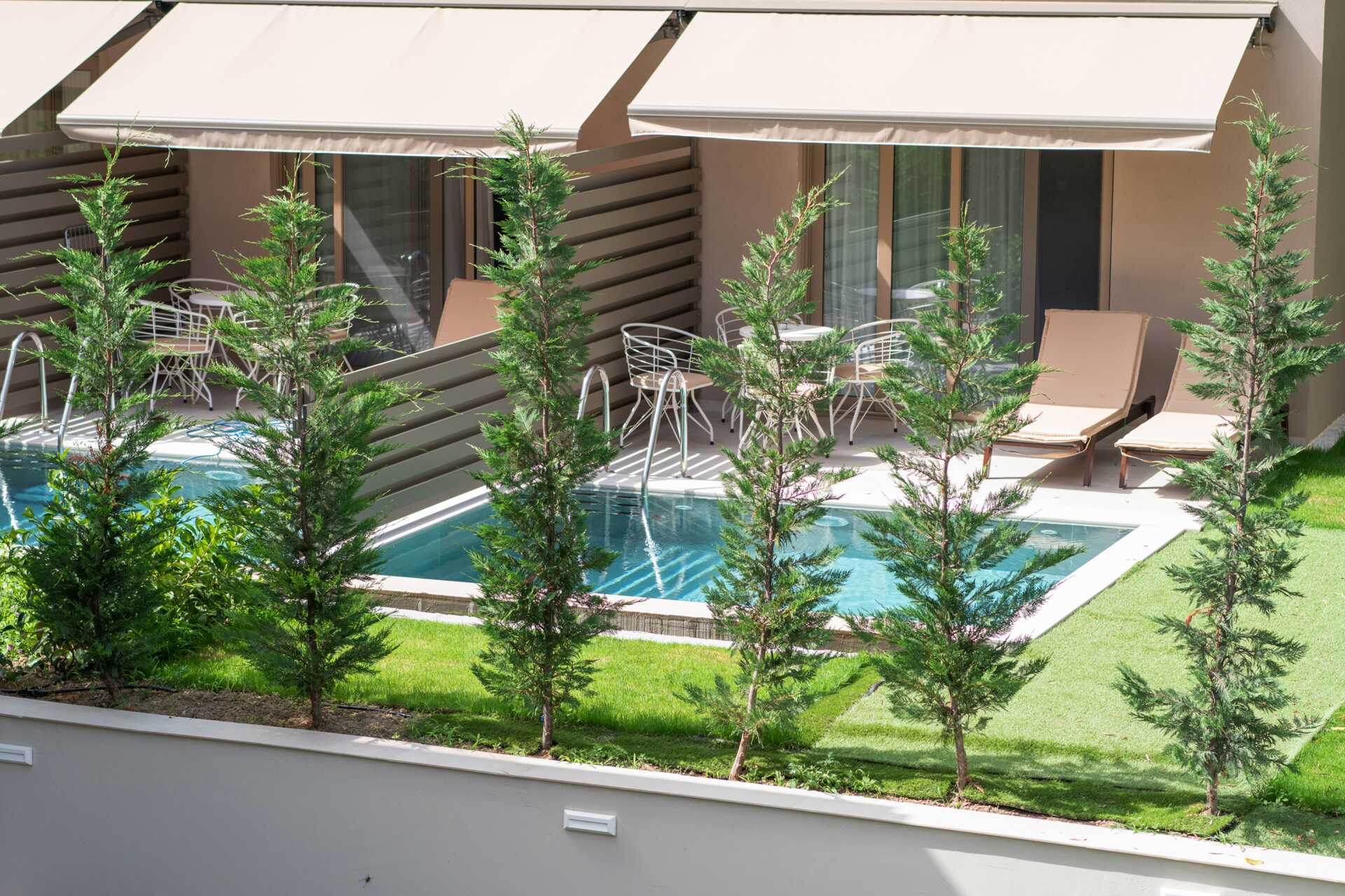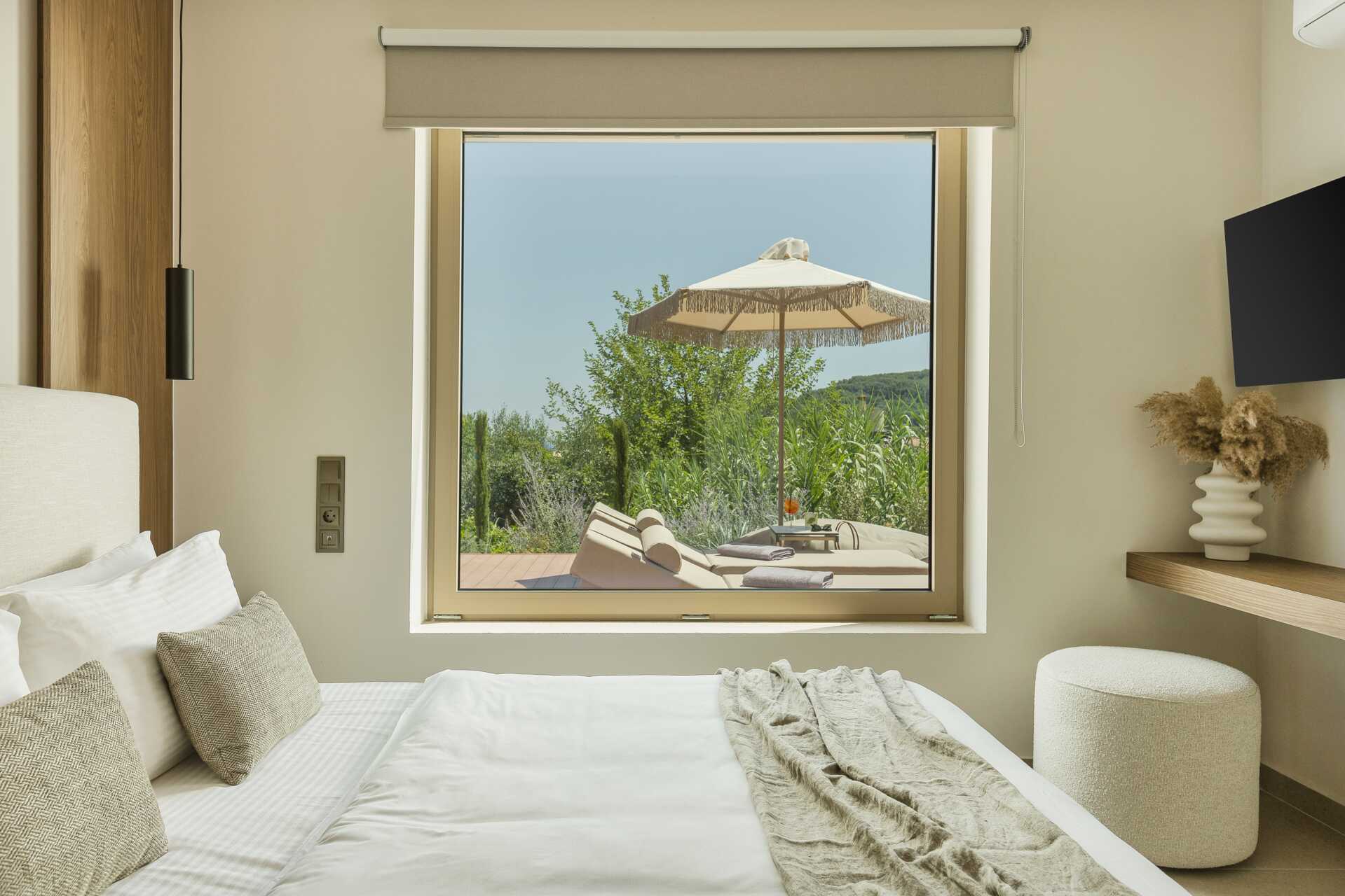 Suiter med terrasse i stueplan, solstole og privat pool. En dobbeltseng på stueplan og en hems med endnu en dobbeltseng ovenpå. Gratis wifi, aircondition (på øverste niveau) og deponering. Køleskab. El-kedel og kaffe/te. Espressomaskine. Tv med internationale kanaler. Hårtørrer. Badeværelse med bruser og toilet. Rengøring 7 gange om ugen.