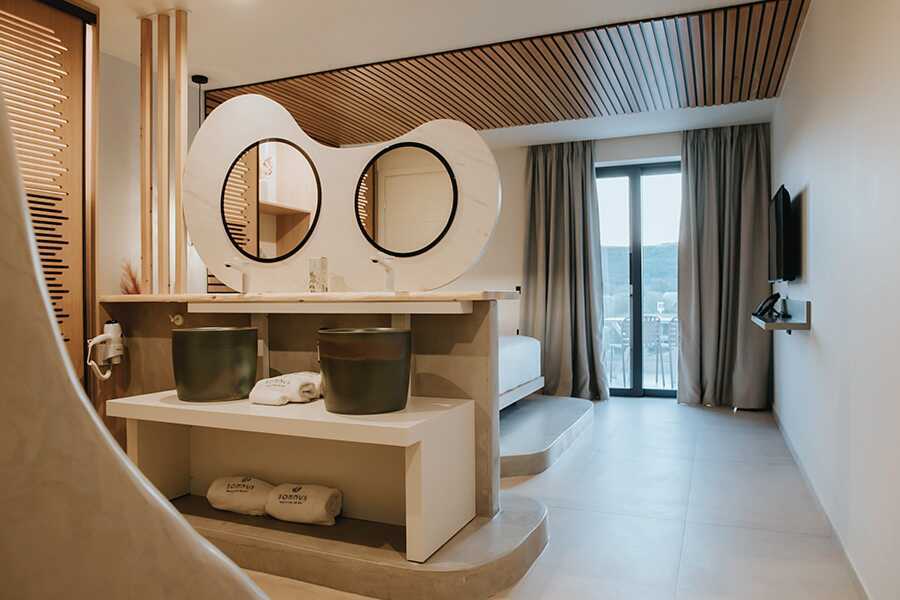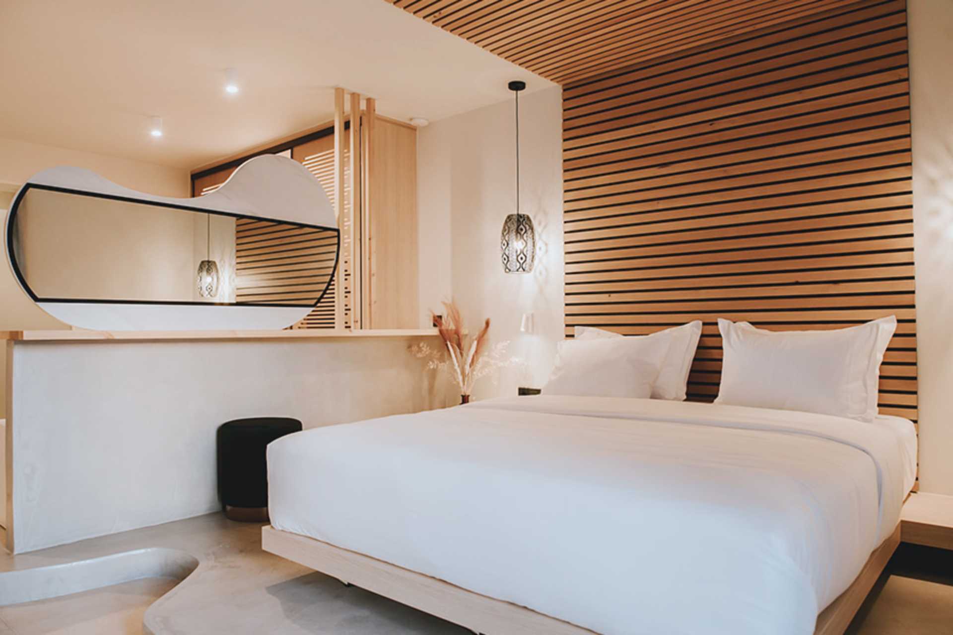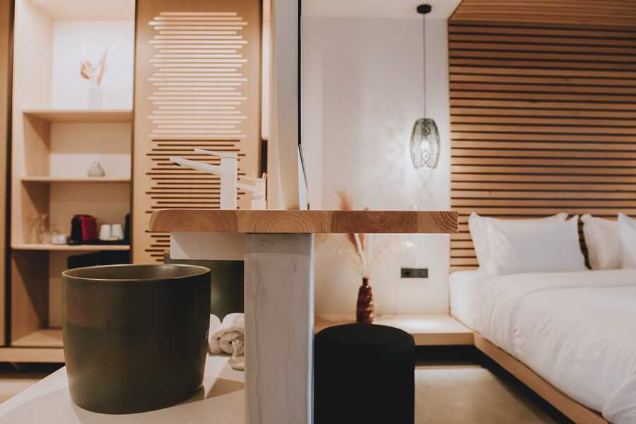 Dobbeltværelse med mindre privat pool på udepladsen. En dobbeltseng. Gratis wifi, deponering og aircondition. Køleskab. Espressomaskine og el-kedel. Badeværelse, som er delvist åbent til værelset, med bruser og toilet. Rengøring 7 gange om ugen.