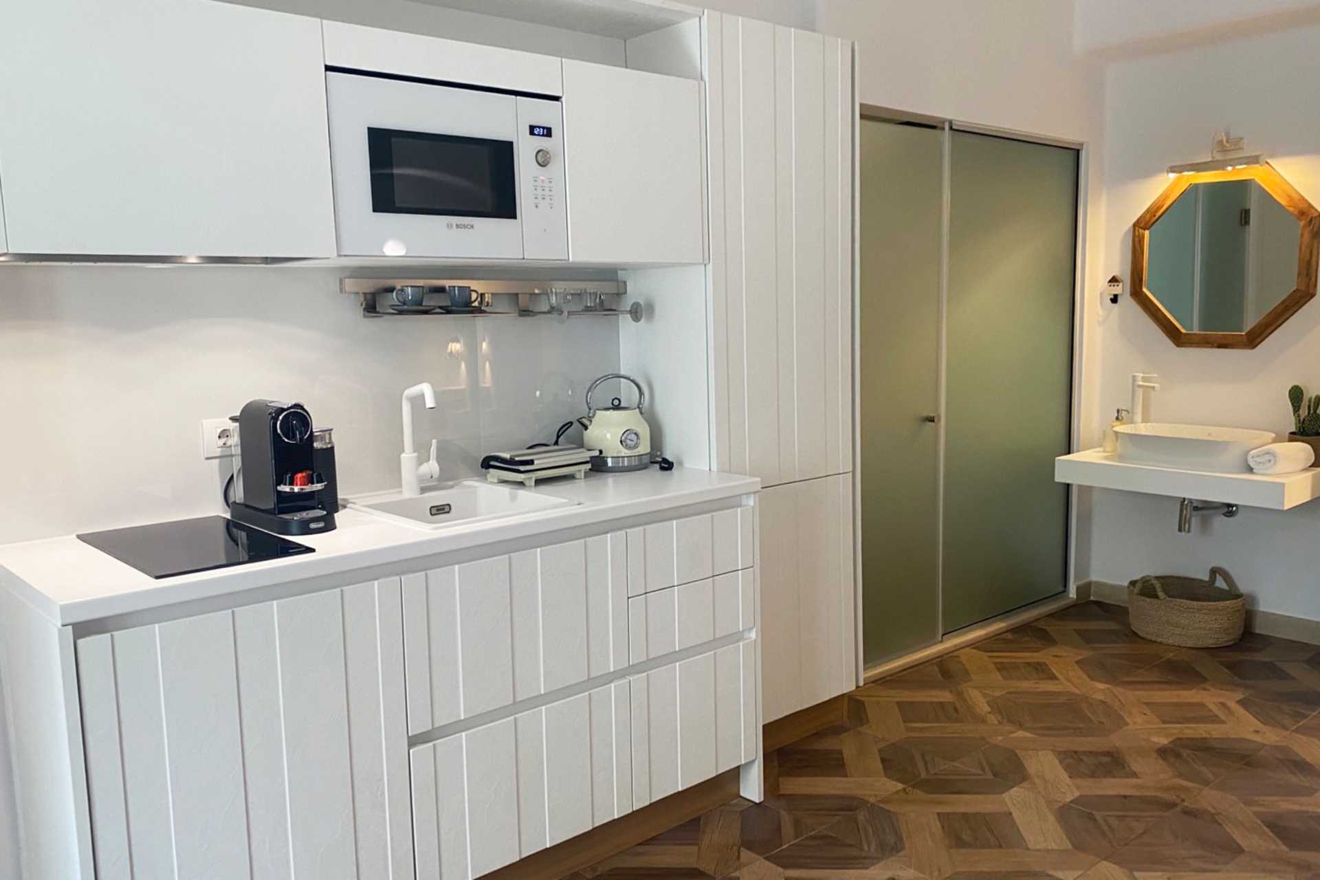 Suite med balkon eller terrasse. Kombineret soveværelse og minikøkken. En dobbeltseng. Gratis wifi, aircondition og deponering. Minikøkken med køleskab, el-kedel og kaffe og te, Nespresso-kaffemaskine, kaffemaskine, kogeplade og mikrobølgeovn. Tv med internationale kanaler. Strygejern og strygebræt. Badekåber og tøfler. Hårtørrer. Badeværelse med bruser og toilet. Rengøring 5 gange om ugen.