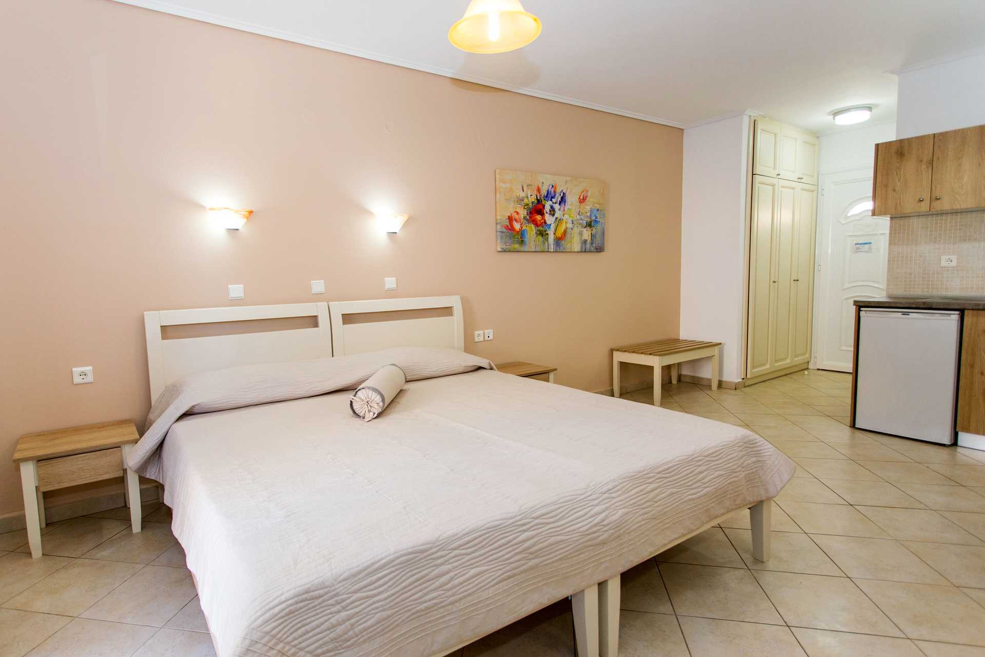 1-værelses lejligheder med balkon. Kombineret soveværelse og minikøkken. En dobbeltseng eller to enkeltsenge. Minikøkken med køleskab, kogeplader, mikrobølgeovn og enkelt køkkenudstyr. Gratis wifi og deponering. Aircondition mod betaling. Tv med lokale kanaler. Badeværelse med bruser og toilet. Rengøring 6 gange om ugen. Børn under to år tæller med i det maksimale antal personer på værelset.