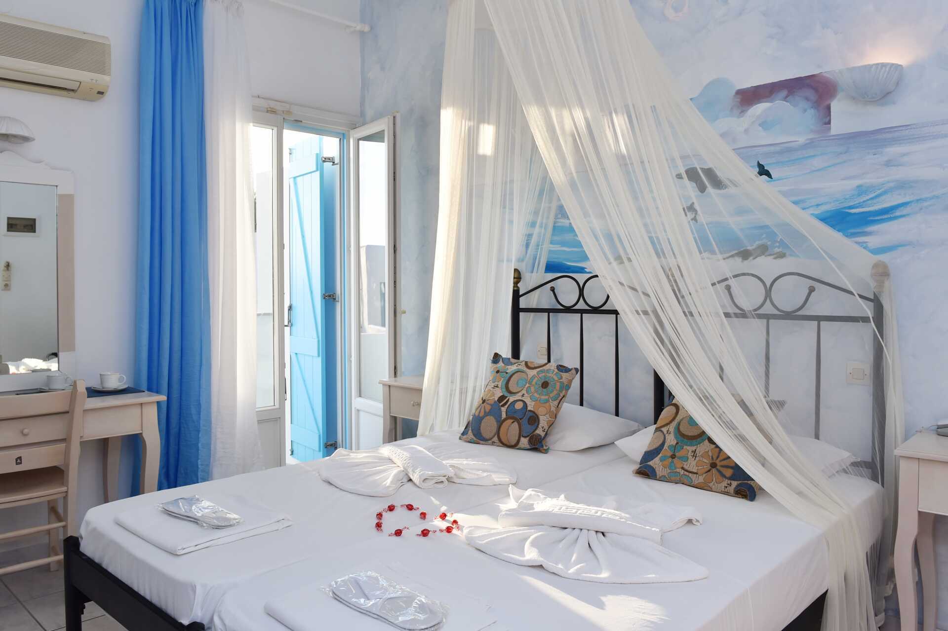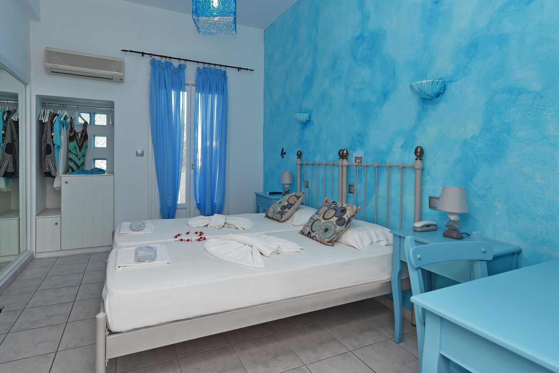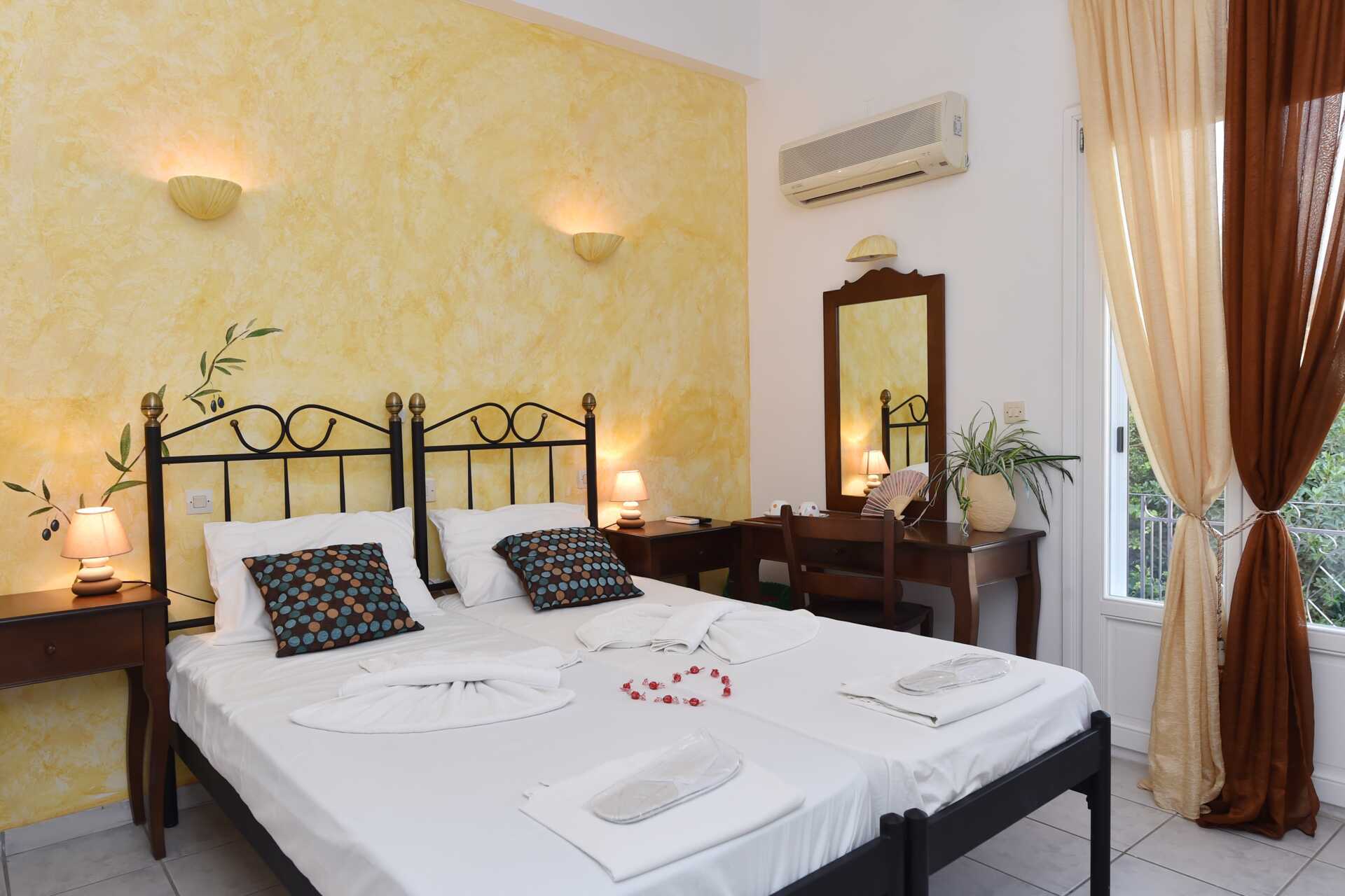 Dobbeltværelse med balkon eller terrasse. En dobbeltseng eller to enkeltsenge. Gratis wifi og aircondition. Køleskab. El-kedel. Tv med internationale kanaler. Hårtørrer. Badeværelse med bruser og toilet. Rengøring 7 gange om ugen.