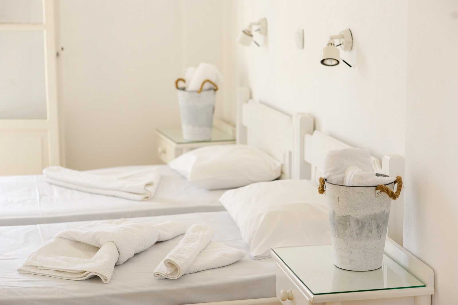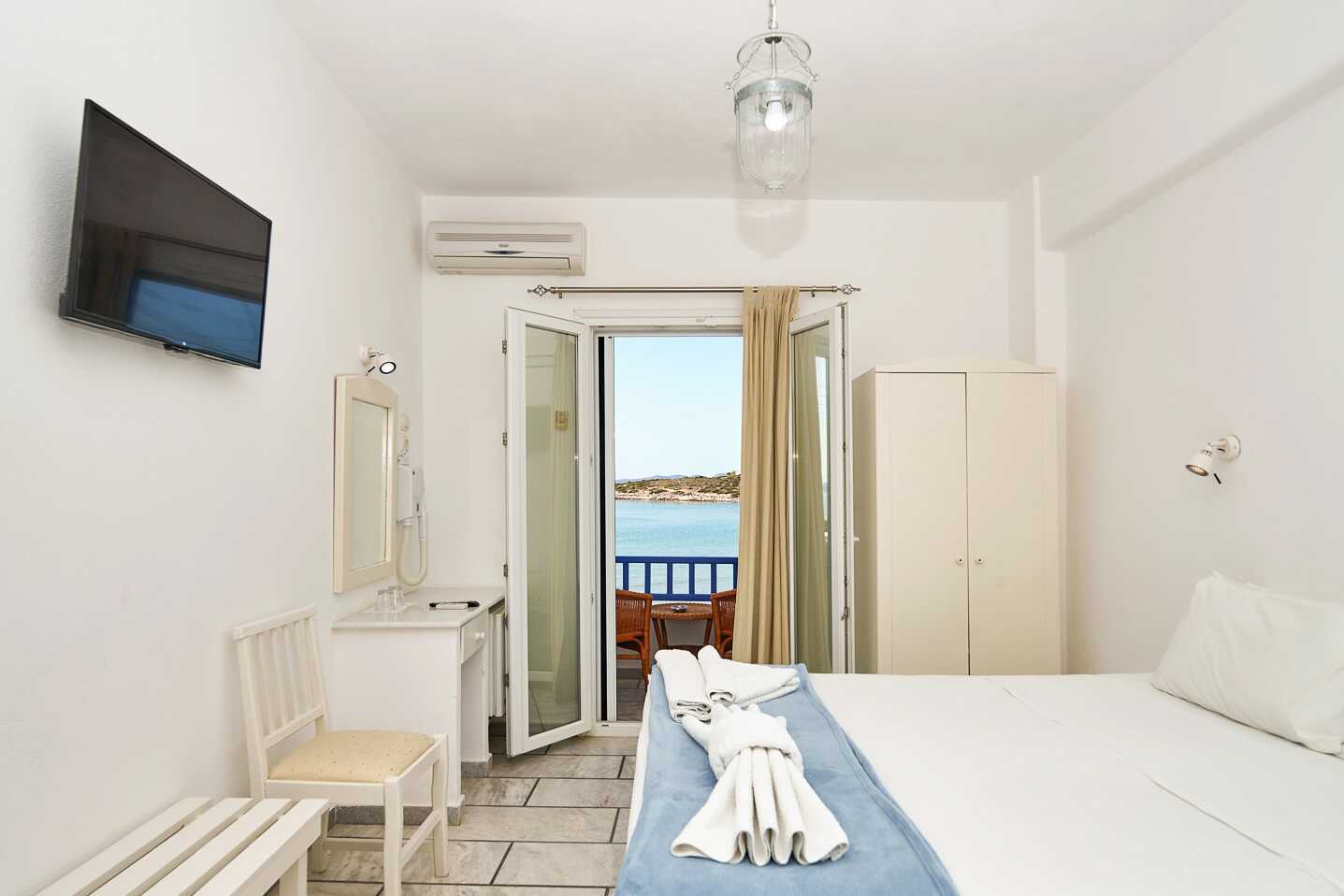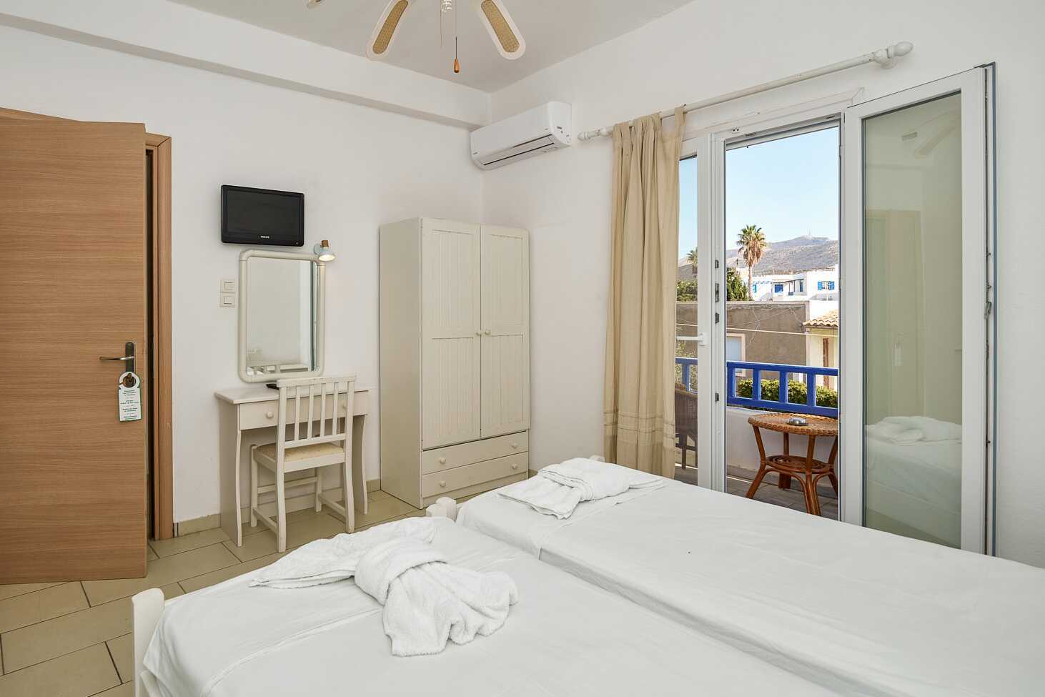 Dobbeltværelse med balkon. Nogle med havudsigt. En dobbeltseng eller to enkeltsenge. Gratis wifi og aircondition. Køleskab. Tv med internationale kanaler. Hårtørrer. Badeværelse med bruser og toilet. Rengøring 7 gange om ugen. Børn under to år tæller med i det maksimale antal personer på værelset.
