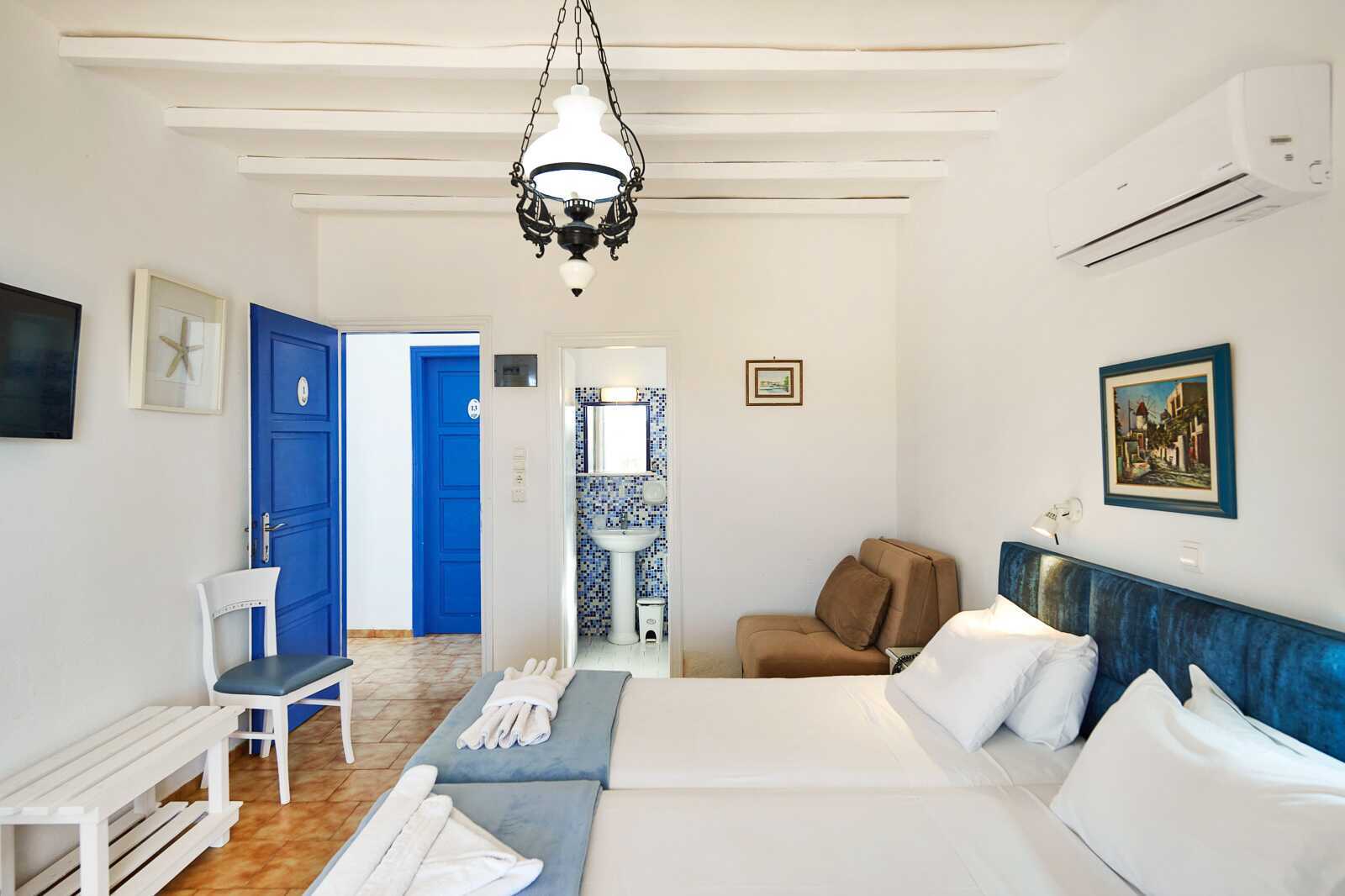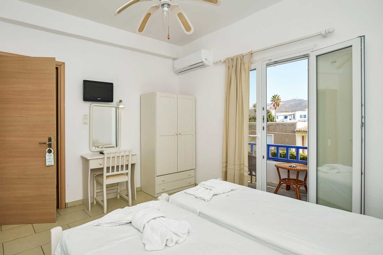 Trippel-værelse med balkon. En dobbeltseng eller to enkeltsenge og en enkeltseng. Gratis wifi og aircondition. Køleskab. Tv med internationale kanaler. Hårtørrer. Badeværelse med bruser og toilet. Rengøring 7 gange om ugen. Børn under to år tæller med i det maksimale antal personer på værelset.