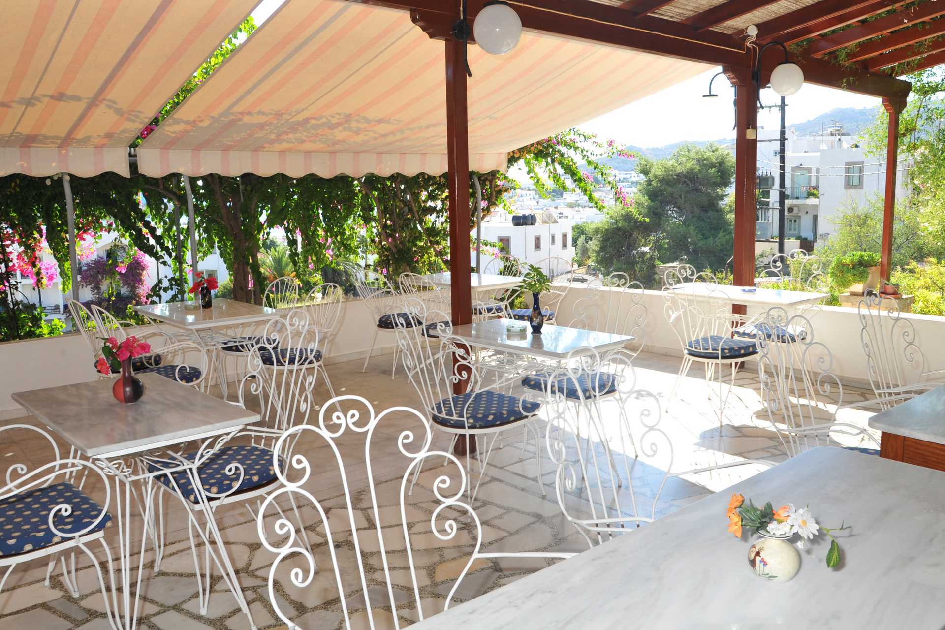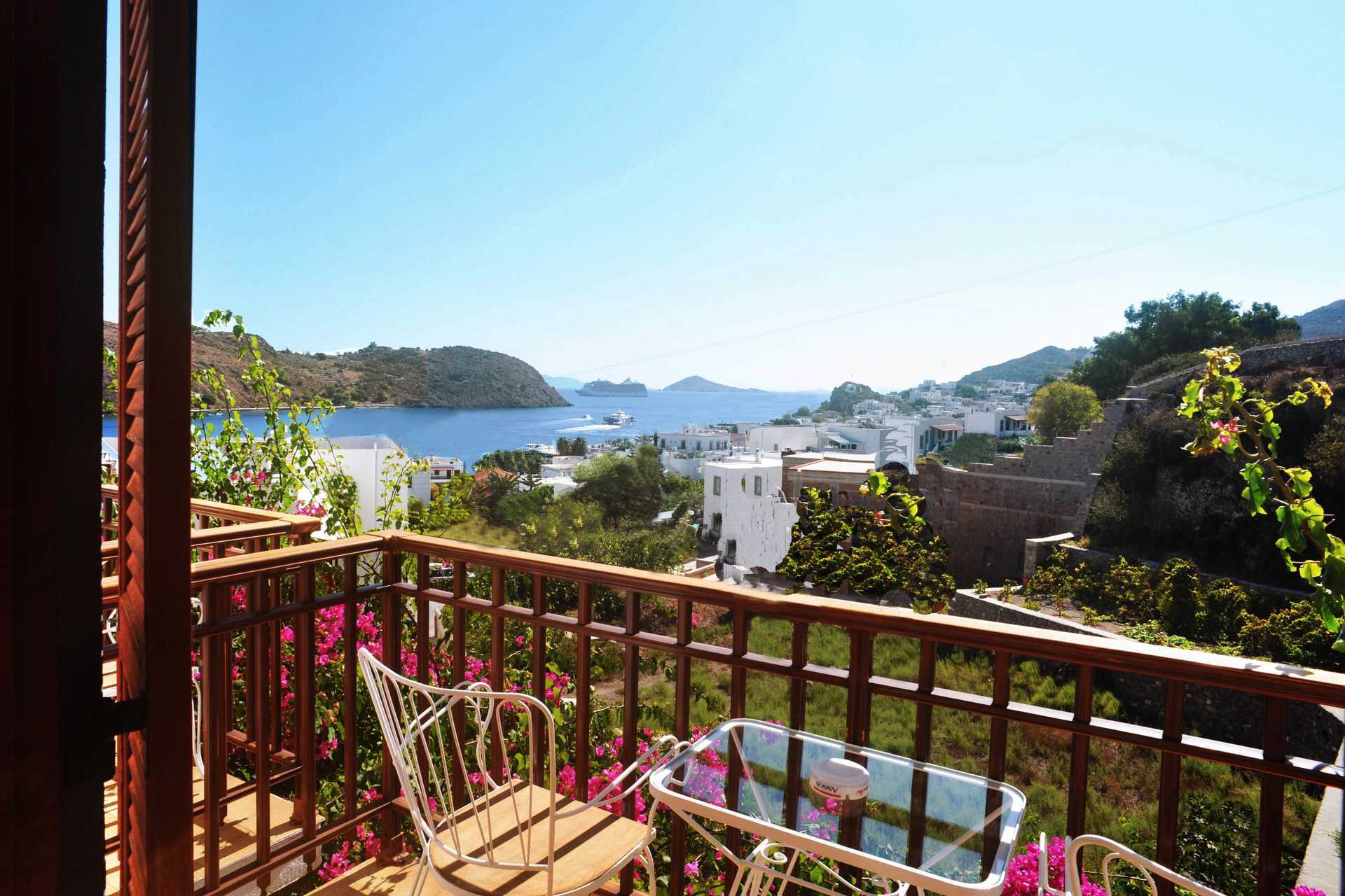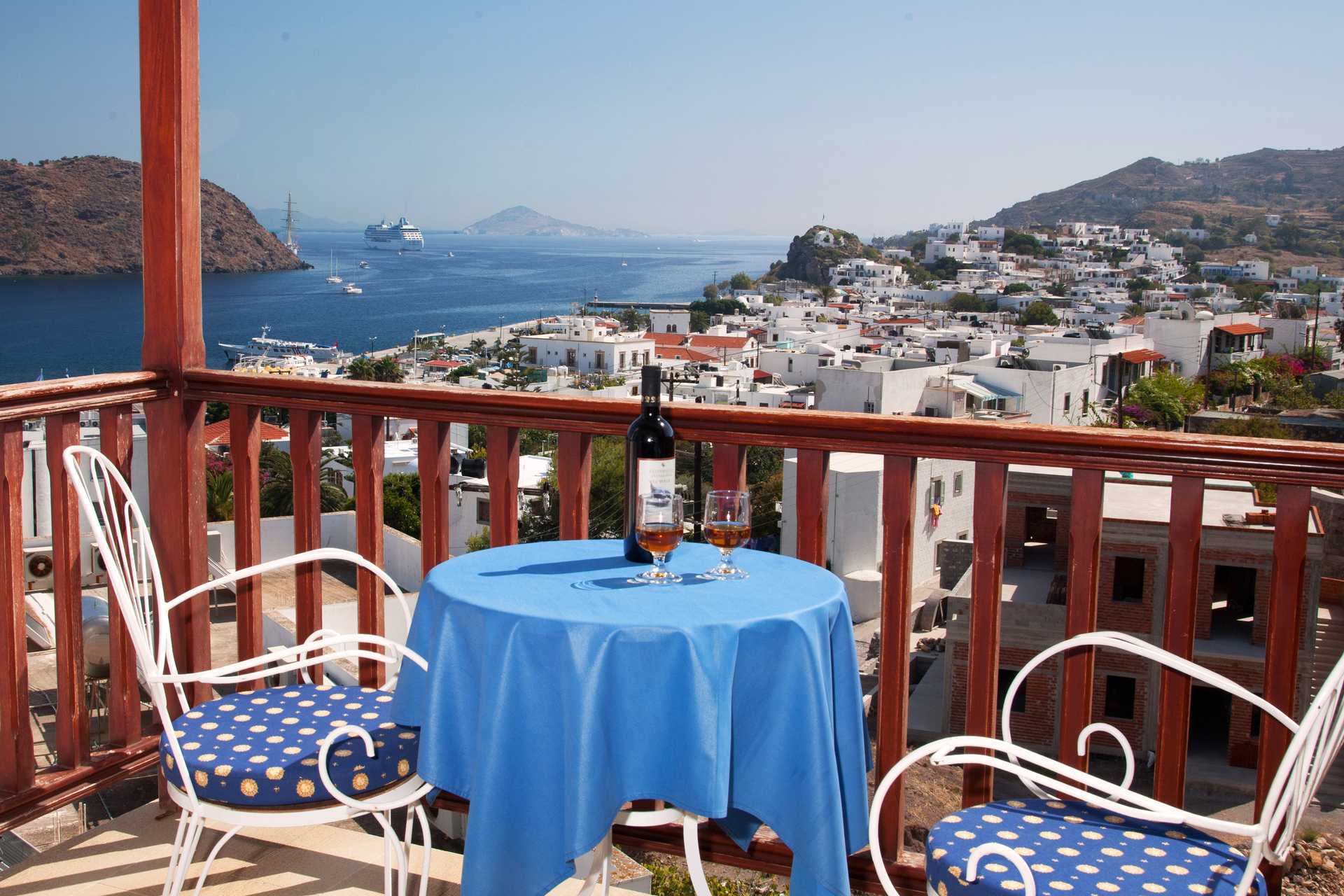 Fra Hotel Castelli på Patmos har du en fantastisk udsigt over havnen i Skala. Hotellet er enkelt og komfortabelt. Morgenmadslokale.
