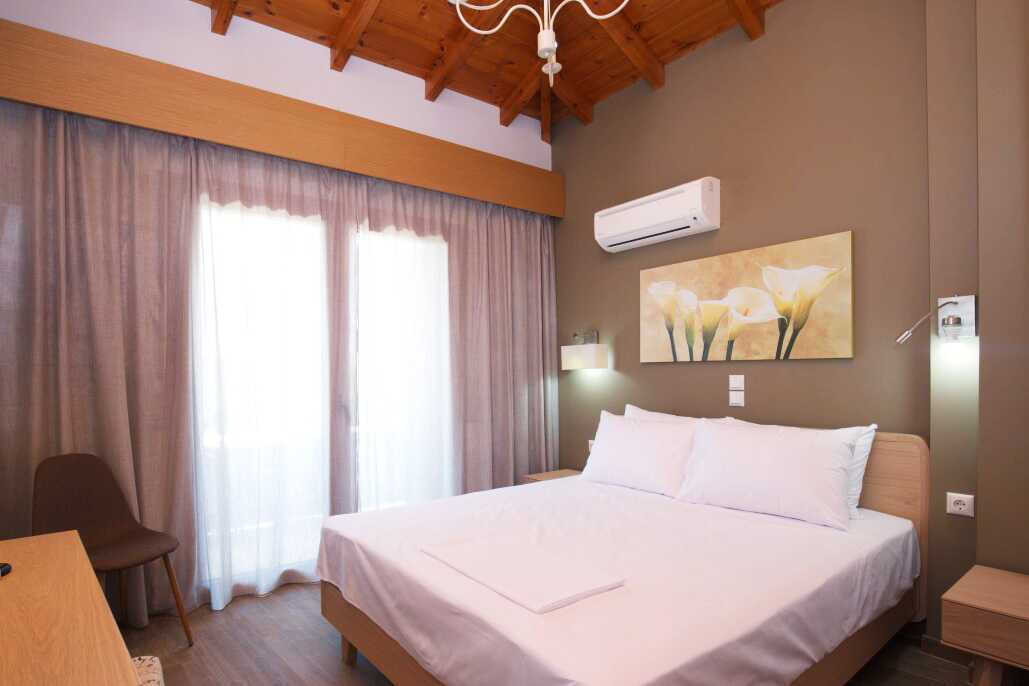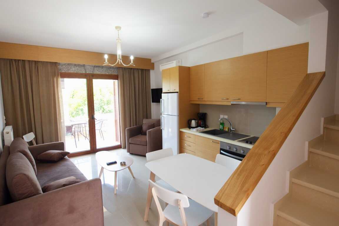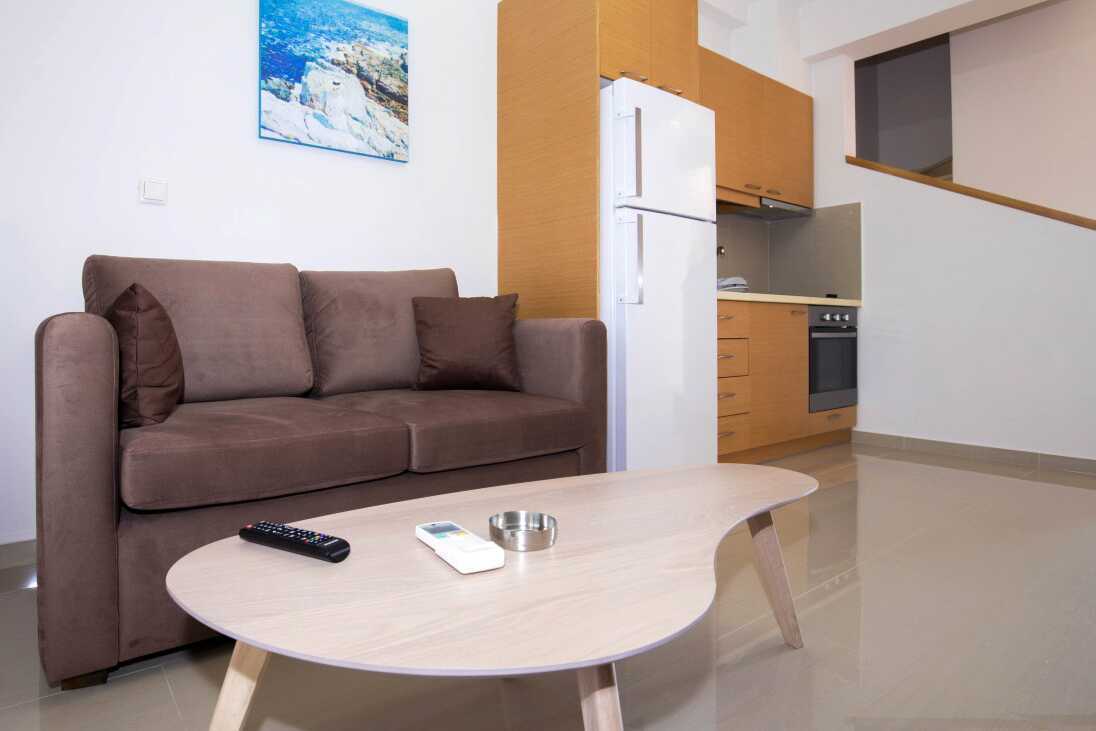 1-værelses lejlighed i etage med to balkoner. Ovenpå er der en balkon, en dobbeltseng, tv, aircondition og et badeværelse med badekar og bruser samt toilet og hårtørrer. I entréplan er der en balkon, en sovesofa med mulighed for ekstra opredning, tv, aircondition og et minikøkken med kogeplader, køleskab, ovn, el-kedel, kaffemaskine, brødrister og enkelt køkkenudstyr samt badeværelse med bruser, toilet og hårtørrer. Gratis wifi, aircondition og deponering. Strygebræt og strygejern. Rengøring 3 gange/uge.