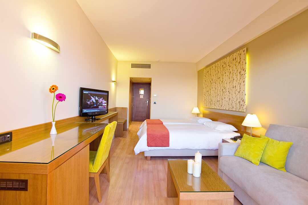 Dobbeltværelser med balkon, nogle med delvis havudsigt. En dobbeltseng eller to enkeltsenge. Mulighed for en ekstra opredning i en sovesofa eller i en fold ud-lænestol. Gratis wifi, aircondition og deponering. Køleskab. El-kedel og kaffe/te. Tv med internationale kanaler. Hårtørrer. Badeværelse med badekar eller bruser samt toilet. Rengøring 7 gange om ugen. Børn under to år tæller med i det maksimale antal personer på værelset.