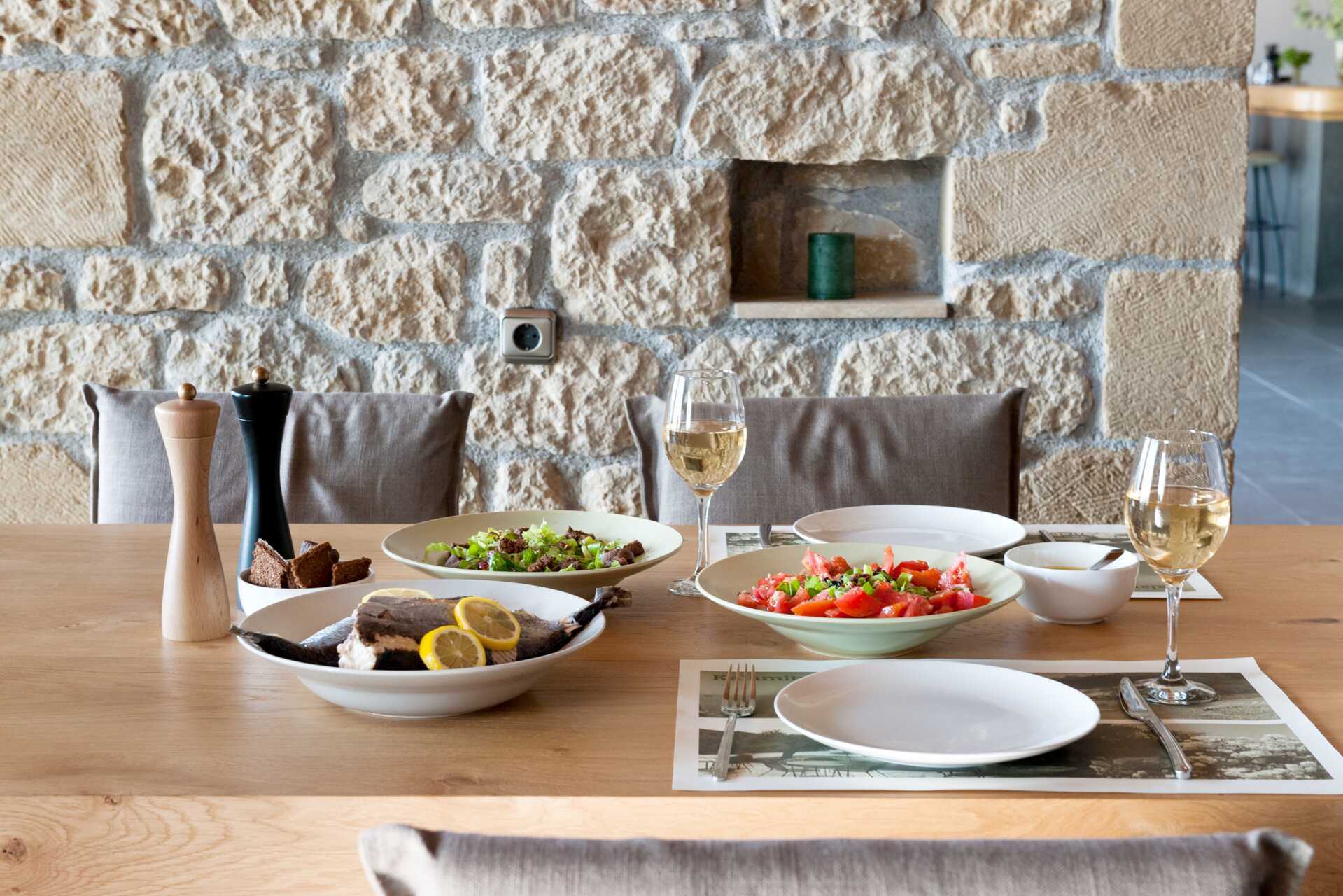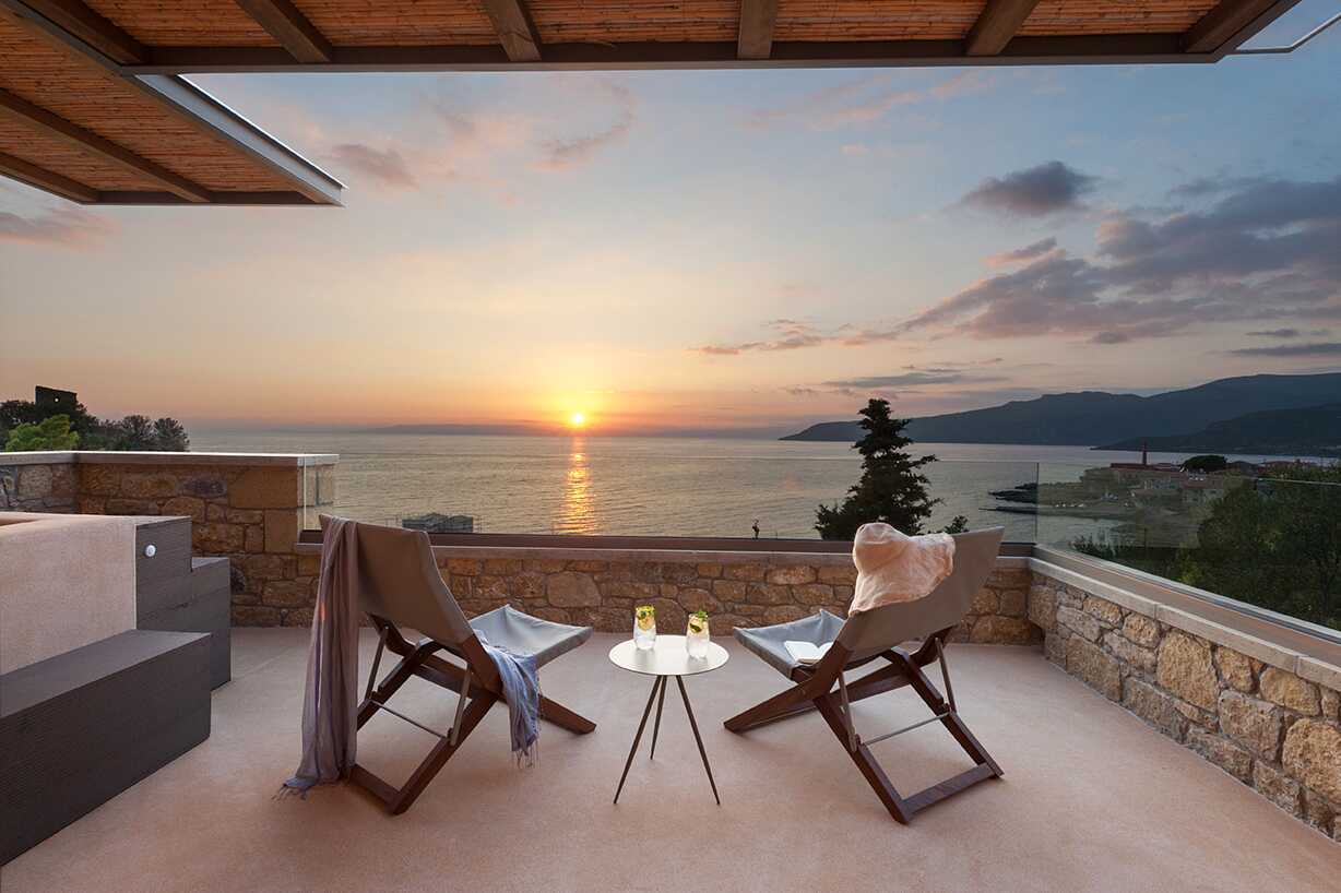 Slap af ved det rolige poolområde, hvor infinity-poolen venter med smuk udsigt over bjergene, de stolte cypresser og havet, der inviterer dig til en magisk solnedgang. Solstole, parasoller og pool- og strandhåndklæder kan lånes. Når du vil svømme i havet, fører en smal sti og omkring 60 trin ned til den hvide stenstrand, hvor det krystalklare vand indbyder til snorkling og en stille svømmetur.