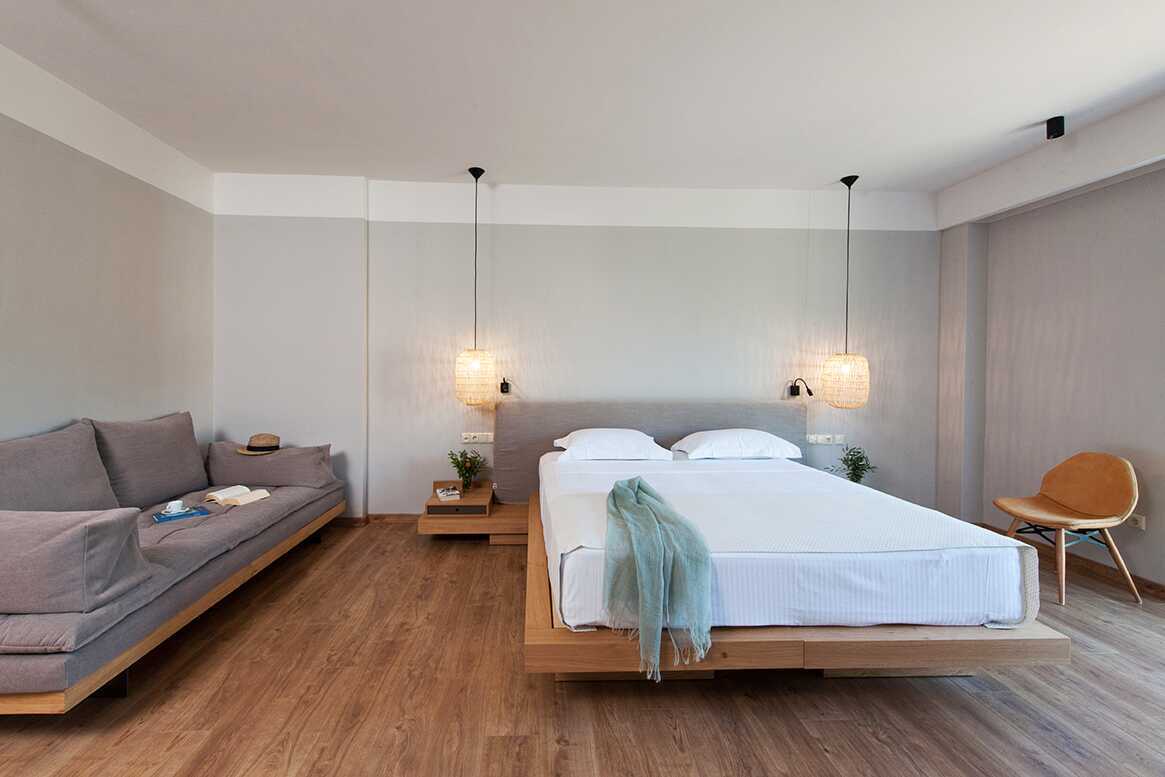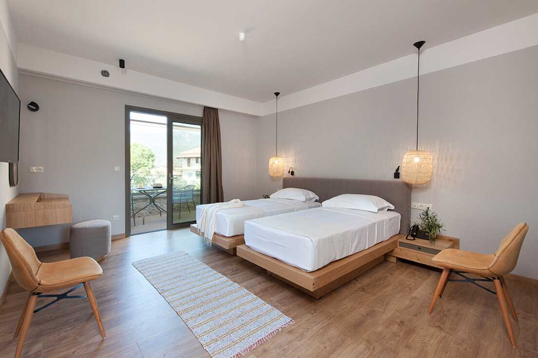 Dobbeltværelse med balkon eller terrasse. En dobbeltseng eller to enkeltsenge. Mulighed for ekstra opredning i sovesofa. Gratis wifi, aircondition og deponering. Køleskab. El-kedel og kaffe/te. Tv med internationale kanaler. Hårtørrer. Badekåber og tøfler. Badeværelse med bruser og toilet. Rengøring 7 gange om ugen.