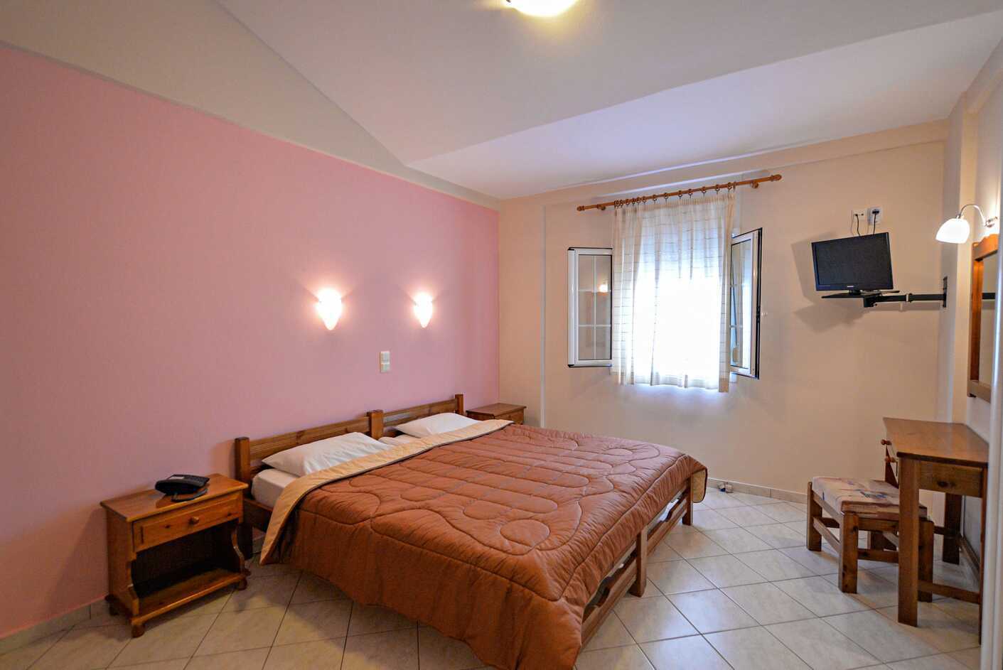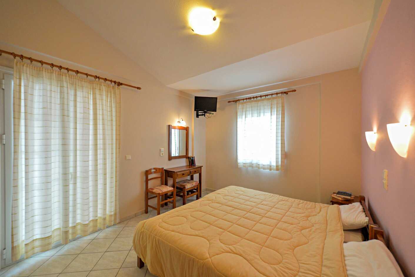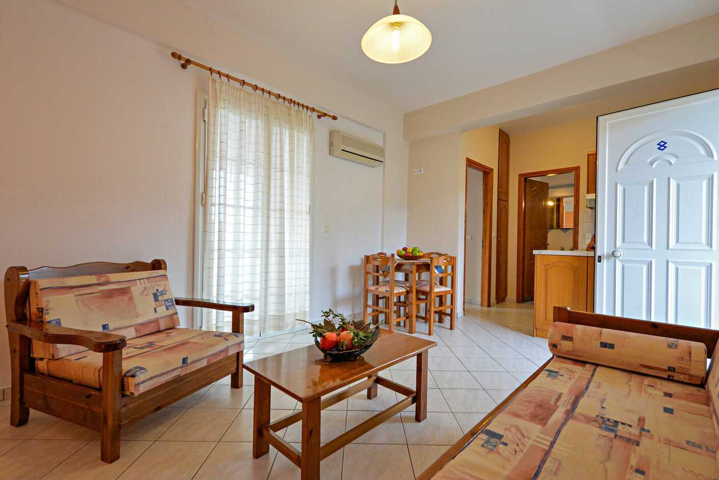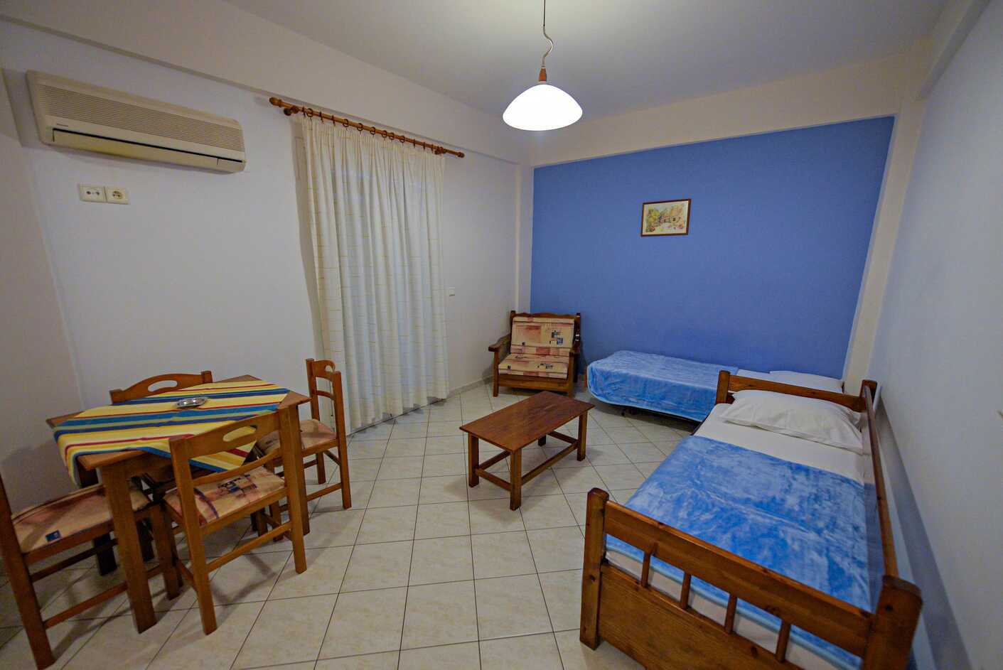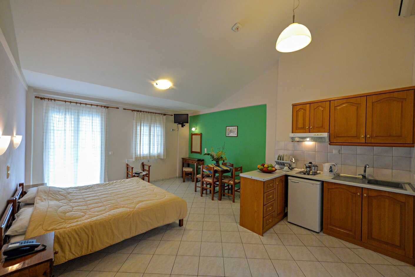 1-værelses lejligheder med balkon. Soveværelse kombineret med minikøkken. To enkeltsenge. Mulighed for ekstra opredning i sovesofa. Minikøkken med kogeplader, køleskab, el-kedel og enkelt køkkenudstyr. Deponering indgår. Aircondition mod betaling. Tv med lokale kanaler. Badeværelse med bruser og toilet. Rengøring 6 gange om ugen. Børn under to år tæller med i det maksimale antal personer på værelset.