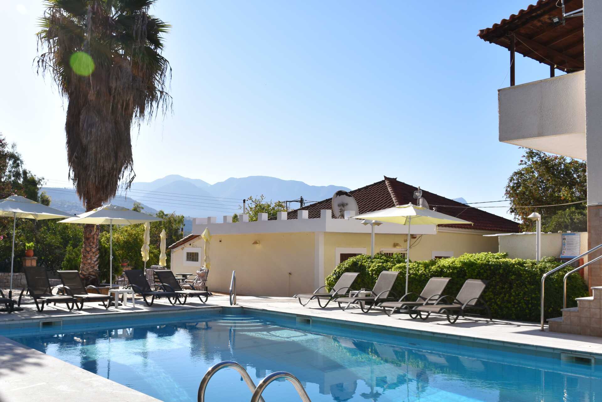 Slap af ved det lille og dejlige poolområde. Der er solstole og parasoller her.