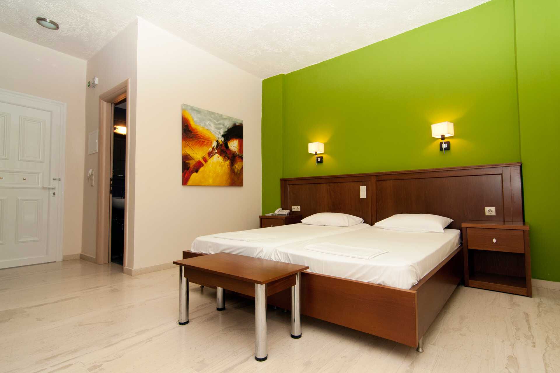 Dobbeltværelse med balkon eller terrasse. To enkeltsenge. Mulighed for ekstra opredning i enkeltseng. Gratis wifi, aircondition og deponering. Køleskab. Tv med internationale kanaler. Strygejern og strygebræt. Hårtørrer. Badeværelse med bruser og toilet. Rengøring 6 gange om ugen. Børn under to år tæller med i det maksimale antal personer på værelset.
