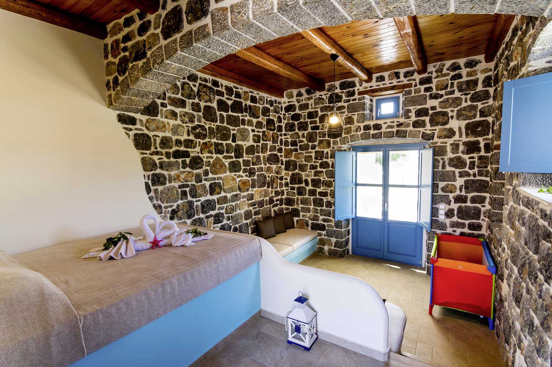 3-værelses lejligheder superior der er beliggende i fritstående stenhuse. Kombineret opholdsrum og minikøkken med køleskab, kogeplader, køkkenudstyr og el-kedel. Sovehems en halv trappe op samt et soveværelse en halv trappe ned fra køkkenet. To dobbeltsenge og en enkeltseng eller en dobbeltseng og tre enkeltsenge. Tv med internationale kanaler. Hårtørrer. Gratis wifi og aircondition. Badeværelse med bruser og toilet. Balkon.
