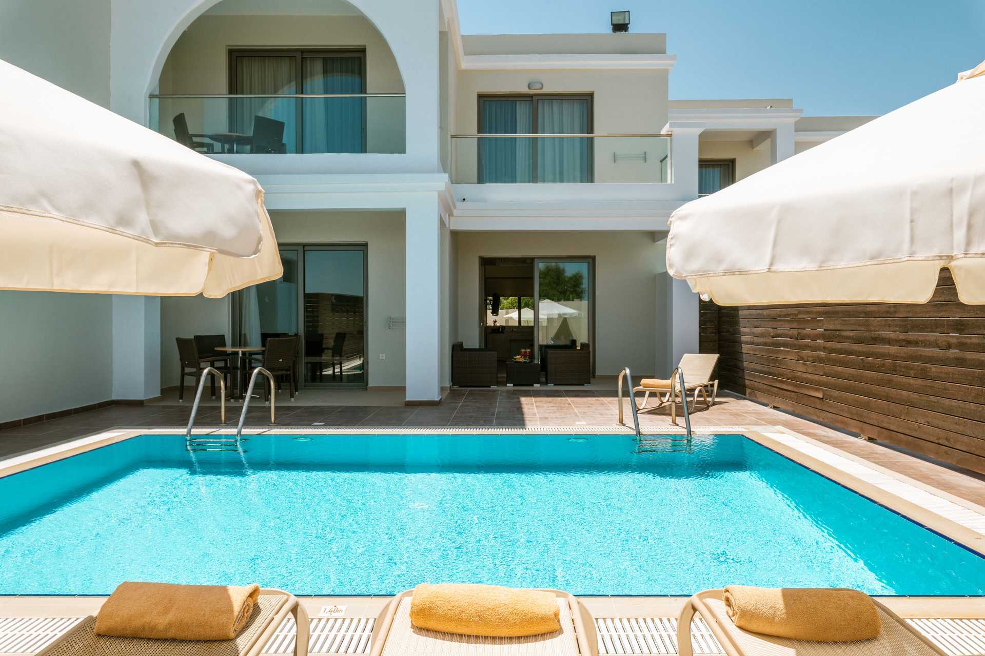 Familie-værelser med terrasse og privat pool. På terrassen er der komfortable loungemøbler og solstole. Et soveværelse og et opholdsområde, der kan adskilles med en skydedør. En dobbeltseng. Mulighed for ekstra opredninger i sovesofaer. Gratis wifi, aircondition og deponering. Køleskab. El-kedel. Tv med internationale kanaler. Hårtørrer. Badeværelse med badekar eller bruser og toilet. Rengøring 7 gange om ugen.
