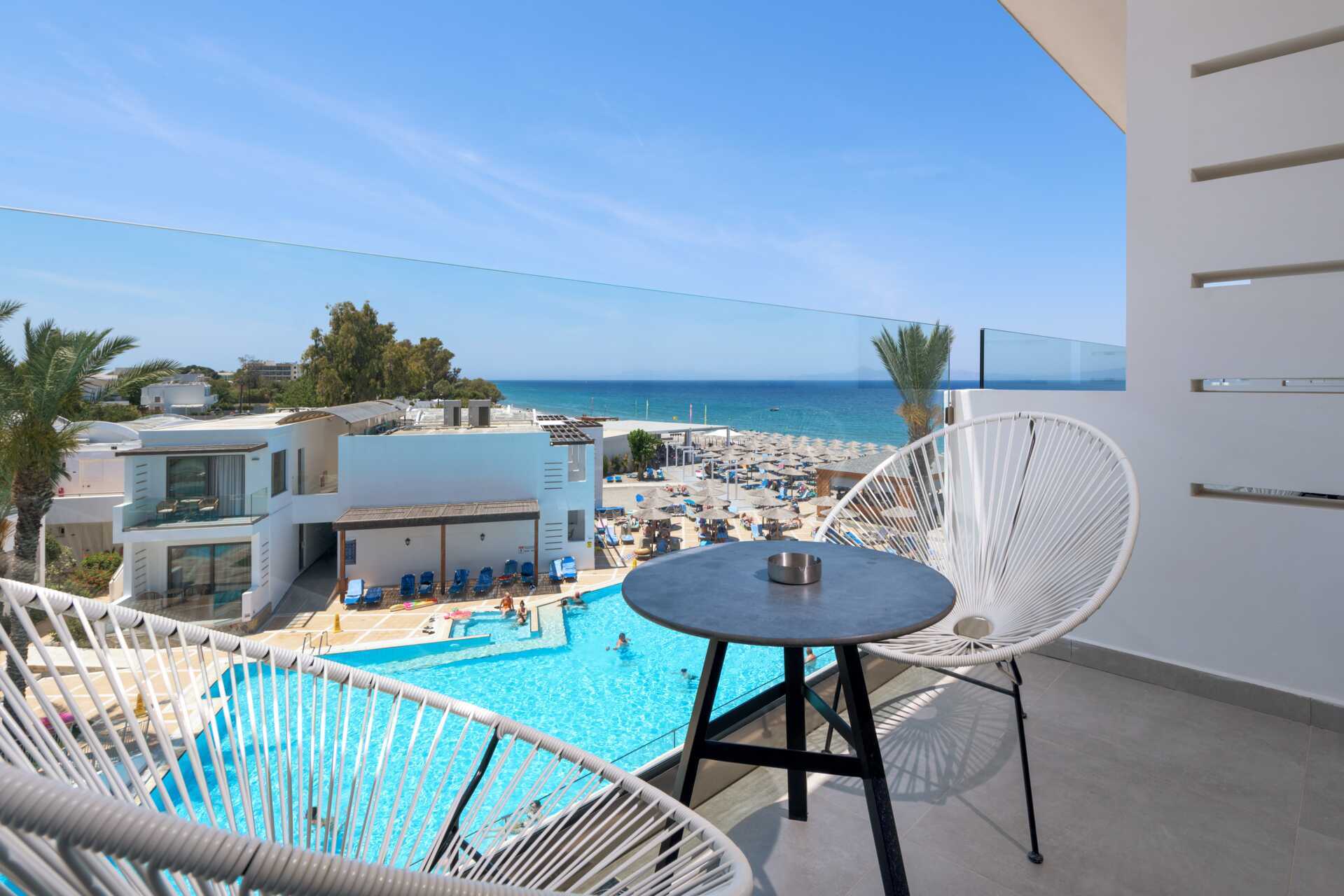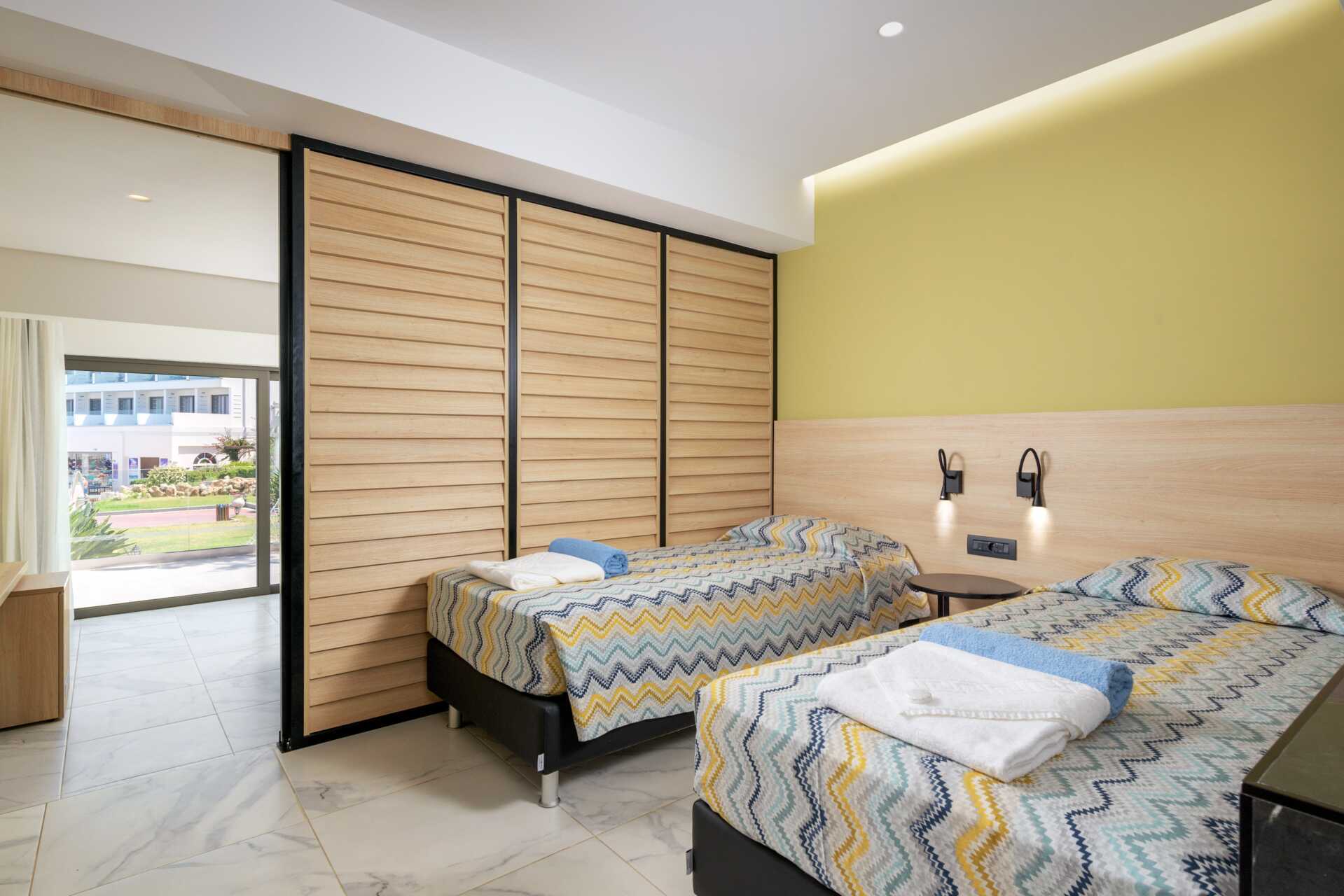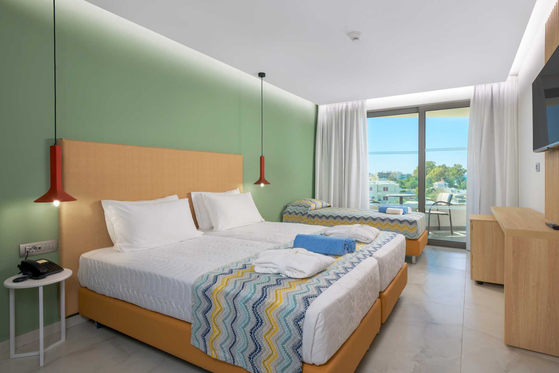 Familie-værelser superior med balkon eller terrasse, nogle med havudsigt. Rummet er opdelt med skydedøre. En dobbeltseng eller to enkeltsenge. Mulighed for ekstra opredning to enkeltsenge. Gratis wifi og aircondition. Deponering mod betaling. Køleskab. Tv med internationale kanaler. Hårtørrer. Badeværelse med bruser og toilet. Rengøring 7 gange om ugen.