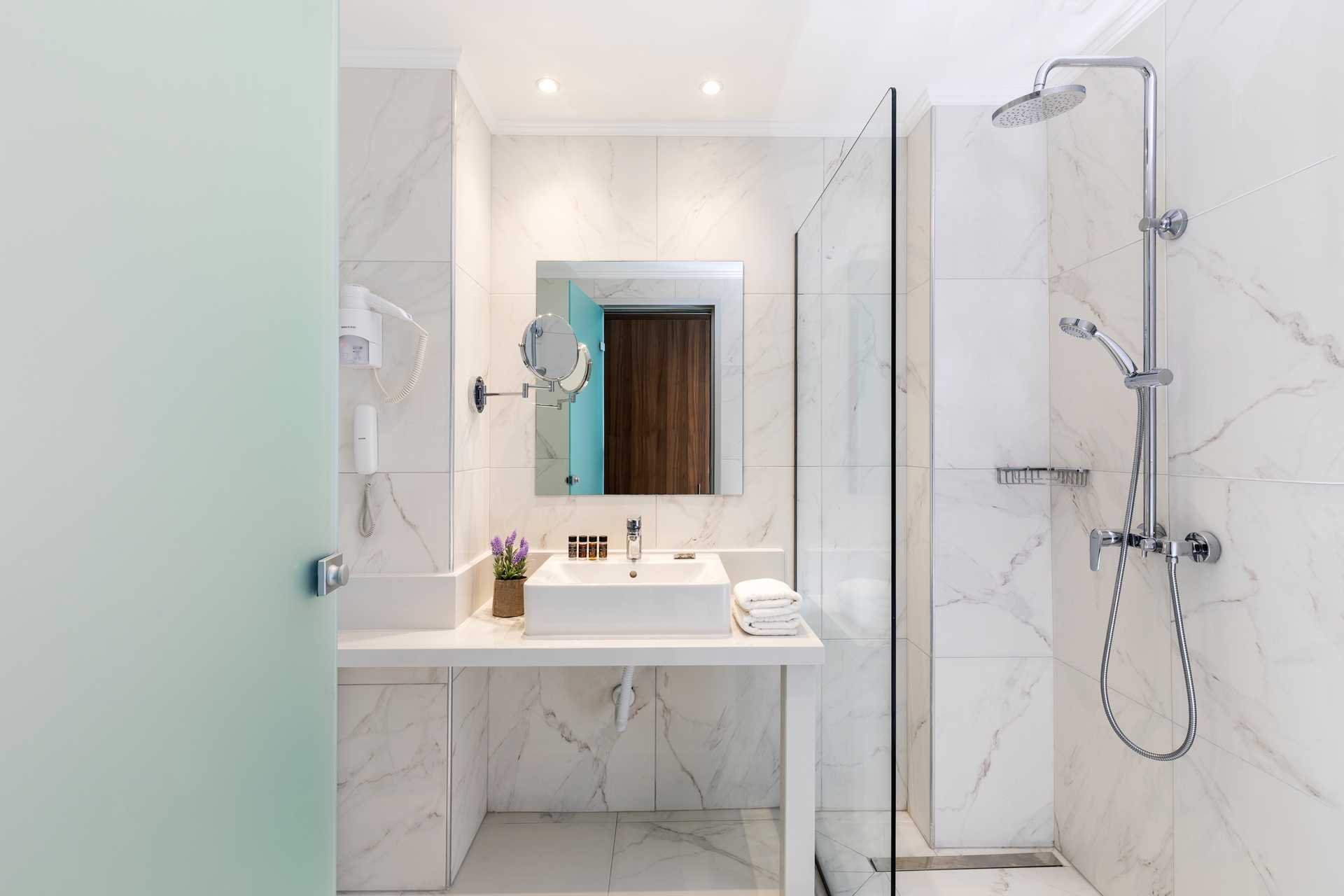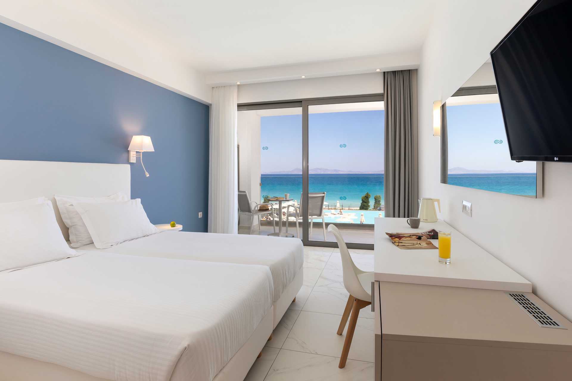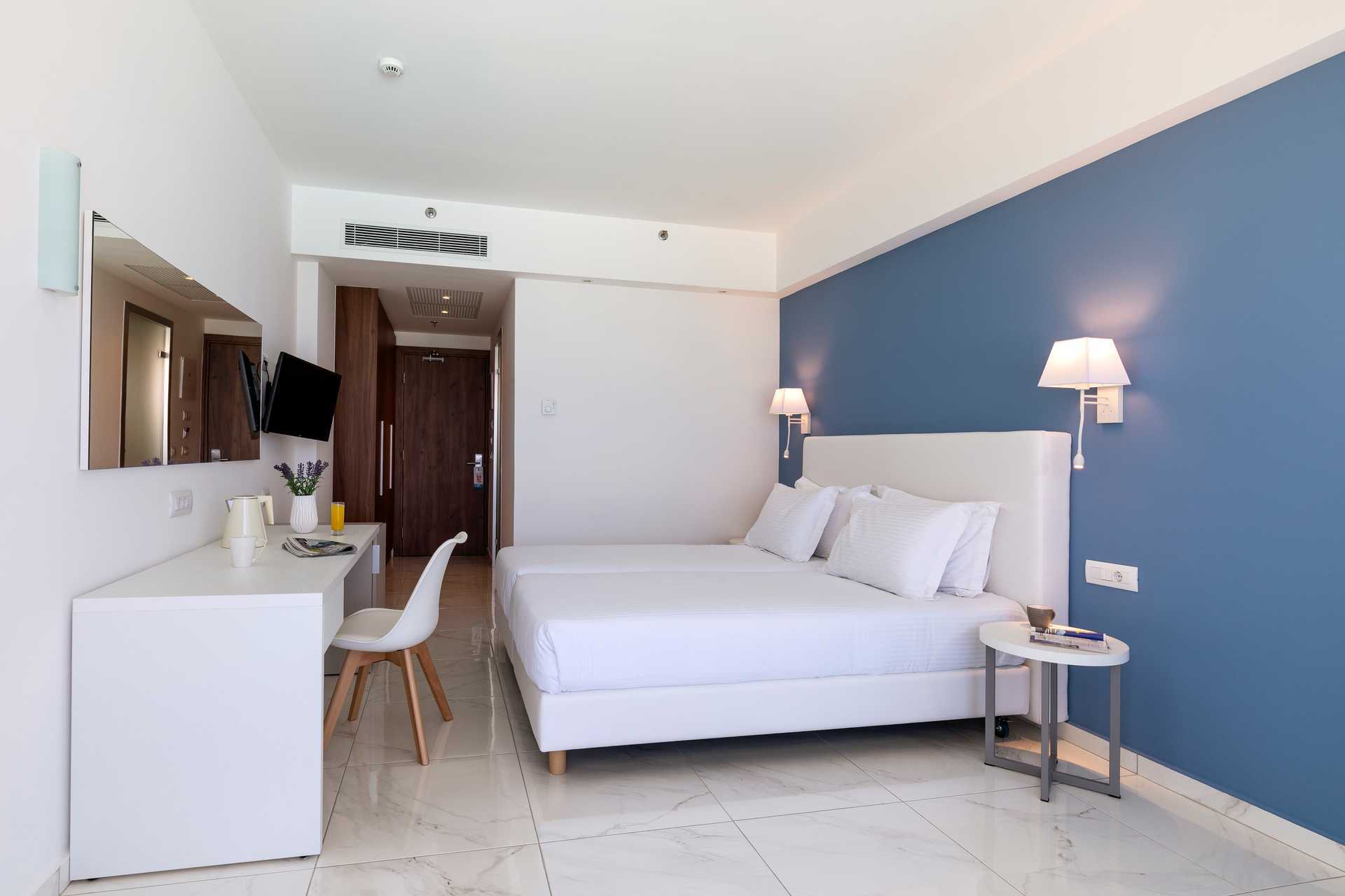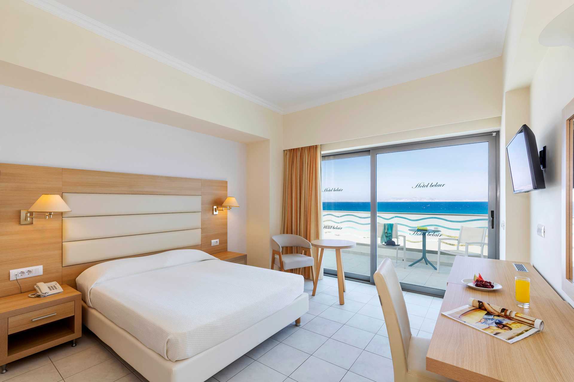 Deluxe-værelser med balkon eller terrasse, nogle med havudsigt. En dobbeltseng eller to enkeltsenge. Mulighed for ekstra opredning i fold ud-seng. Gratis wifi og aircondition. Aircondition er tilgængelig i juni-september. Deponering mod betaling. Køleskab. El-kedel og kaffe/te. Tv med internationale kanaler. Strygejern og strygebræt. Hårtørrer. Badeværelse med bruser og toilet. Rengøring 6 gange om ugen.