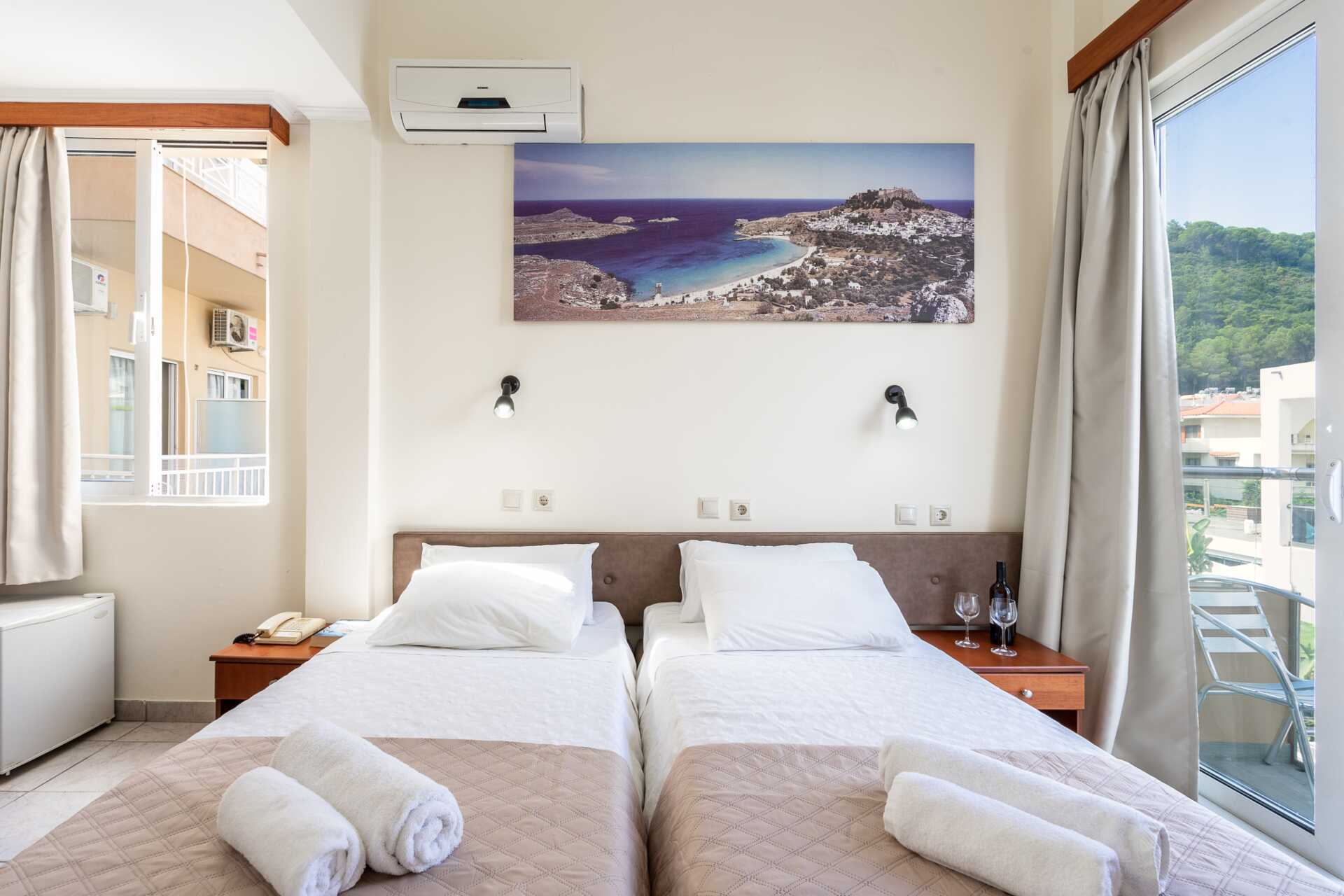 Dobbeltværelse med balkon. En dobbeltseng eller to enkeltsenge. Gratis wifi, aircondition og deponering. Deponering mod betaling. Køleskab. Tv med internationale kanaler. Hårtørrer. Badeværelse med bruser og toilet. Rengøring 6 gange om ugen.