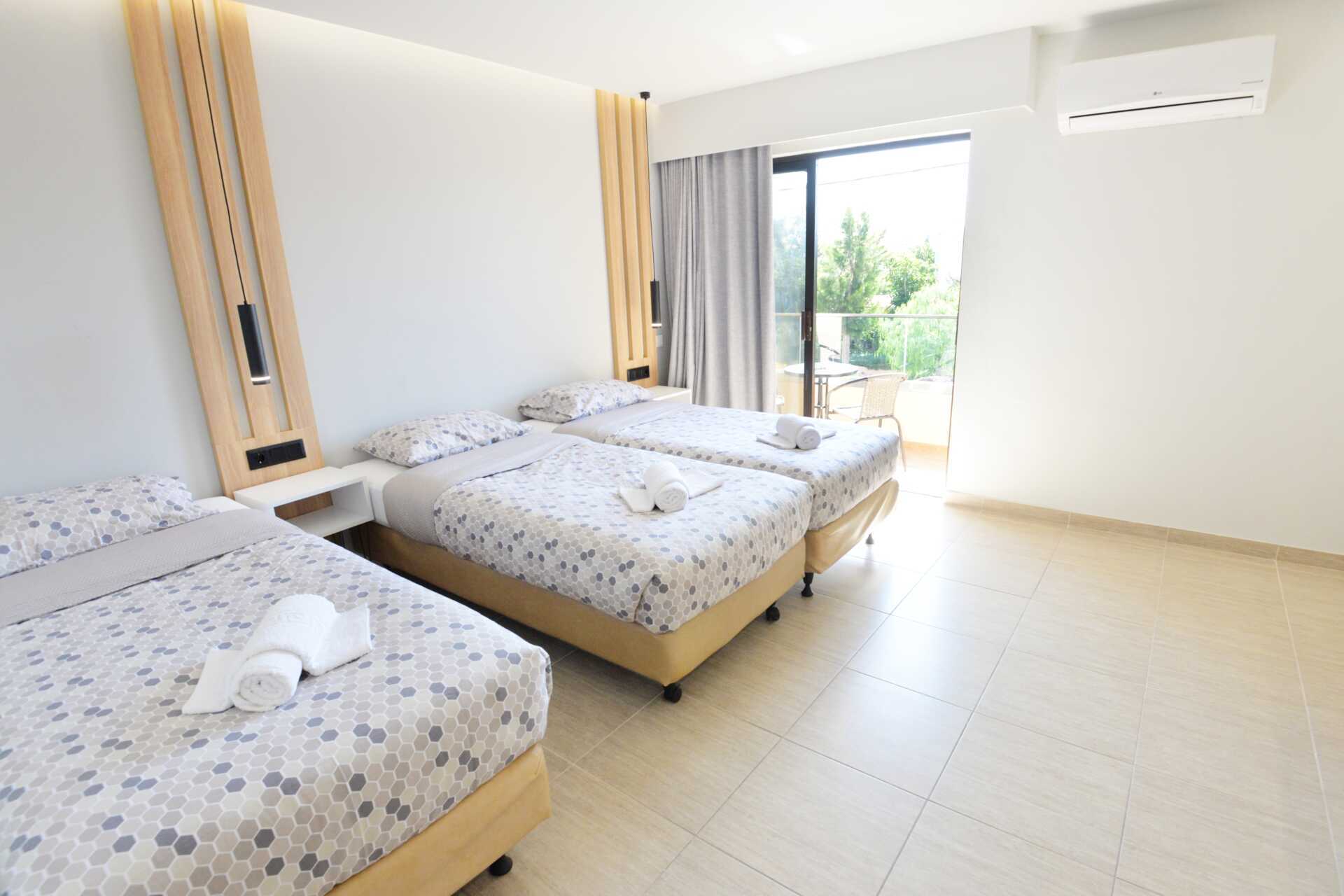Dobbeltværelse med balkon, balkon i stueetagen eller delt udeplads. En dobbeltseng eller to enkeltsenge. Mulighed for ekstra opredning i enkeltseng. Gratis wifi, aircondition og deponering. Køleskab. El-kedel. Tv med internationale kanaler. Hårtørrer. Badeværelse med badekar eller bruser samt toilet. Rengøring 6 gange om ugen.