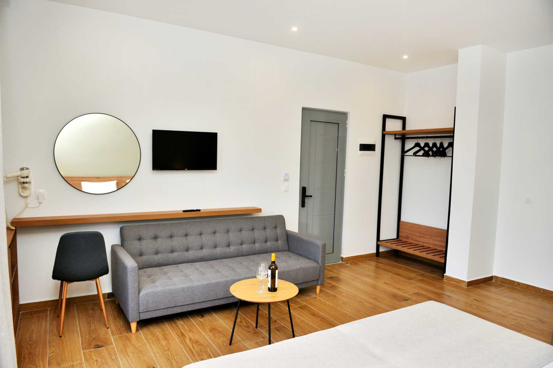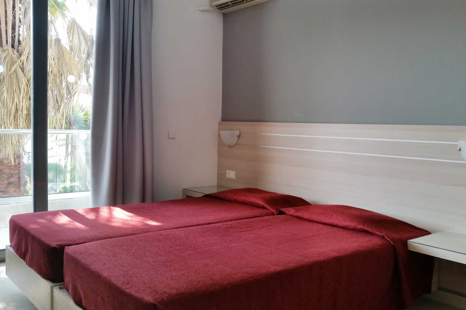 Familie-værelse med terrasse og udgang til delt pool. Familie-værelset vender ud mod poolområdet bag hotellet. To enkeltsenge eller en dobbeltseng. Mulighed for ekstra opredning i sovesofa. Gratis wifi, aircondition og deponering. El-kedel. Tv med internationale kanaler. Hårtørrer. Glasvæg til badeværelse med badekar eller bruser og toilet. Rengøring 5 gange om ugen.