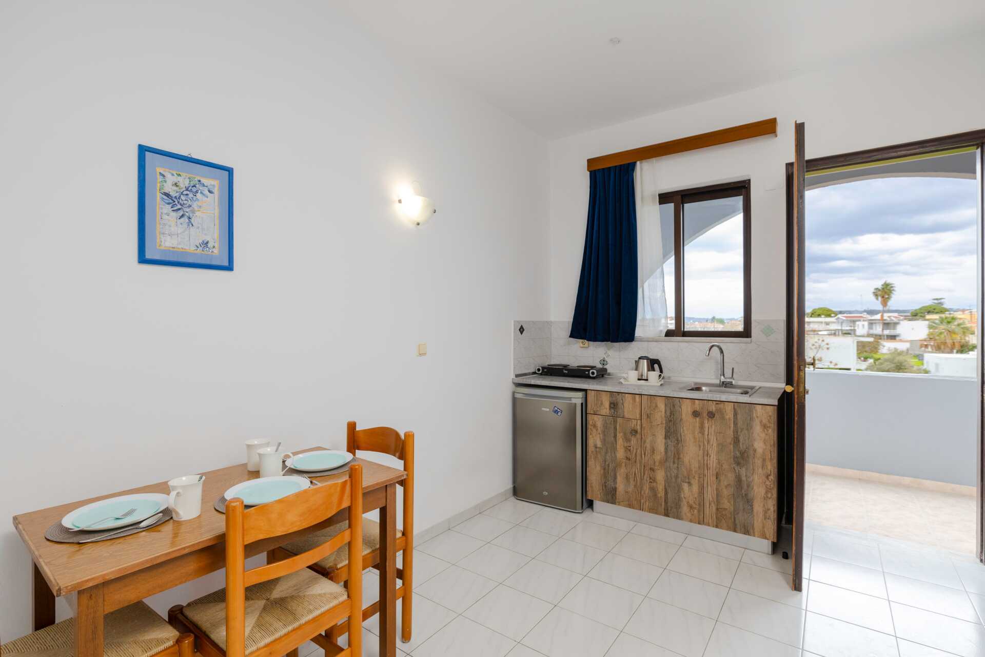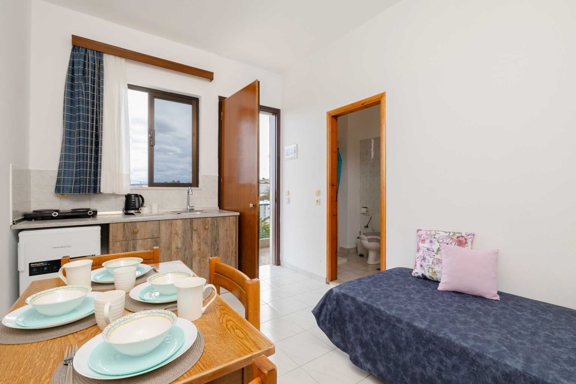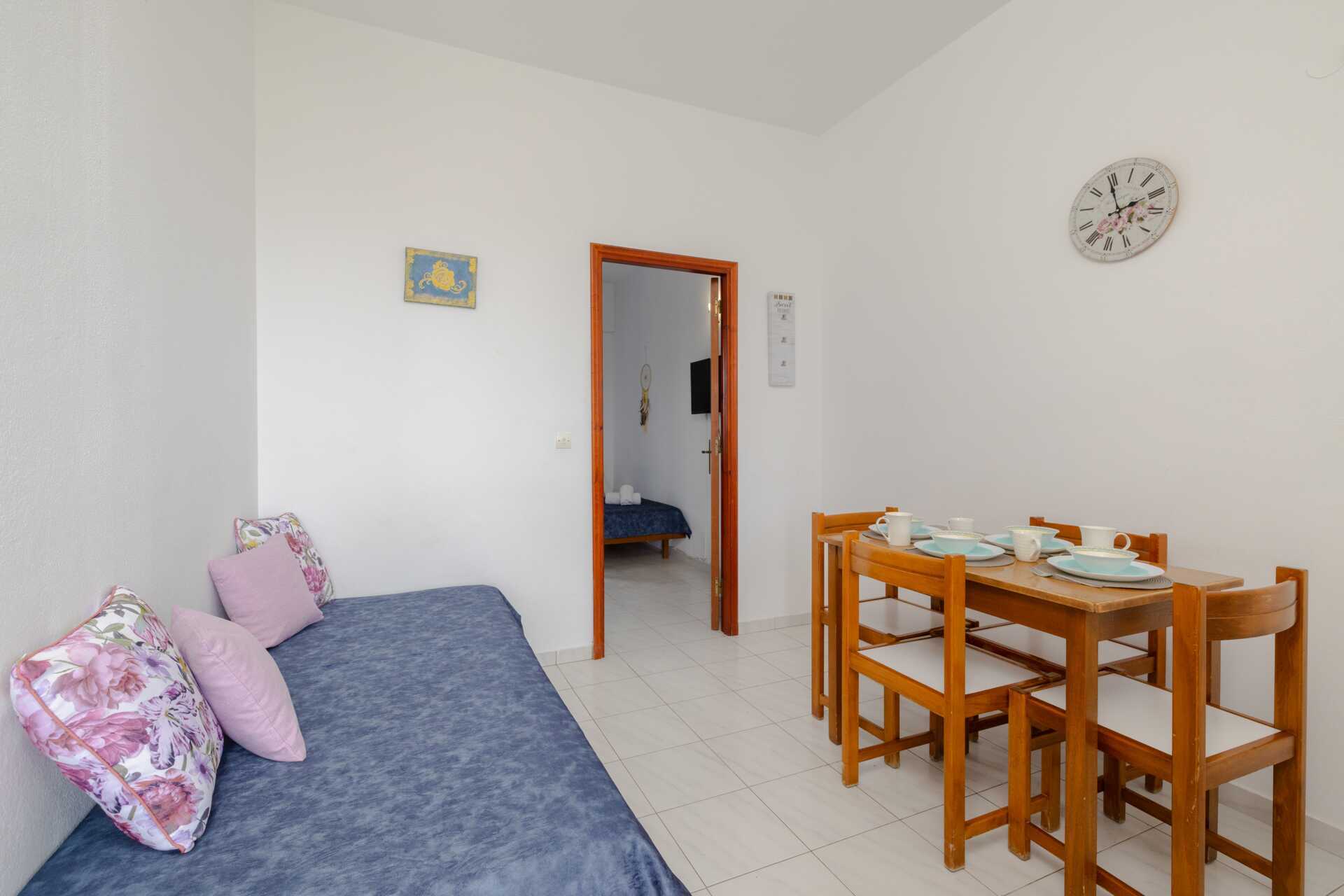 1-værelses lejlighed med balkon eller balkon i stueplan. Soveværelse kombineret med minikøkken. To enkeltsenge. Mulighed for ekstra opredning i enkeltseng eller i sovesofa. Minikøkken med køleskab, kogeplader, el-kedel og enkelt køkkenudstyr. Gratis wifi og deponering. Aircondition mod betaling. Tv med lokale kanaler. Badeværelse med bruser og toilet. Rengøring 6 gange om ugen.