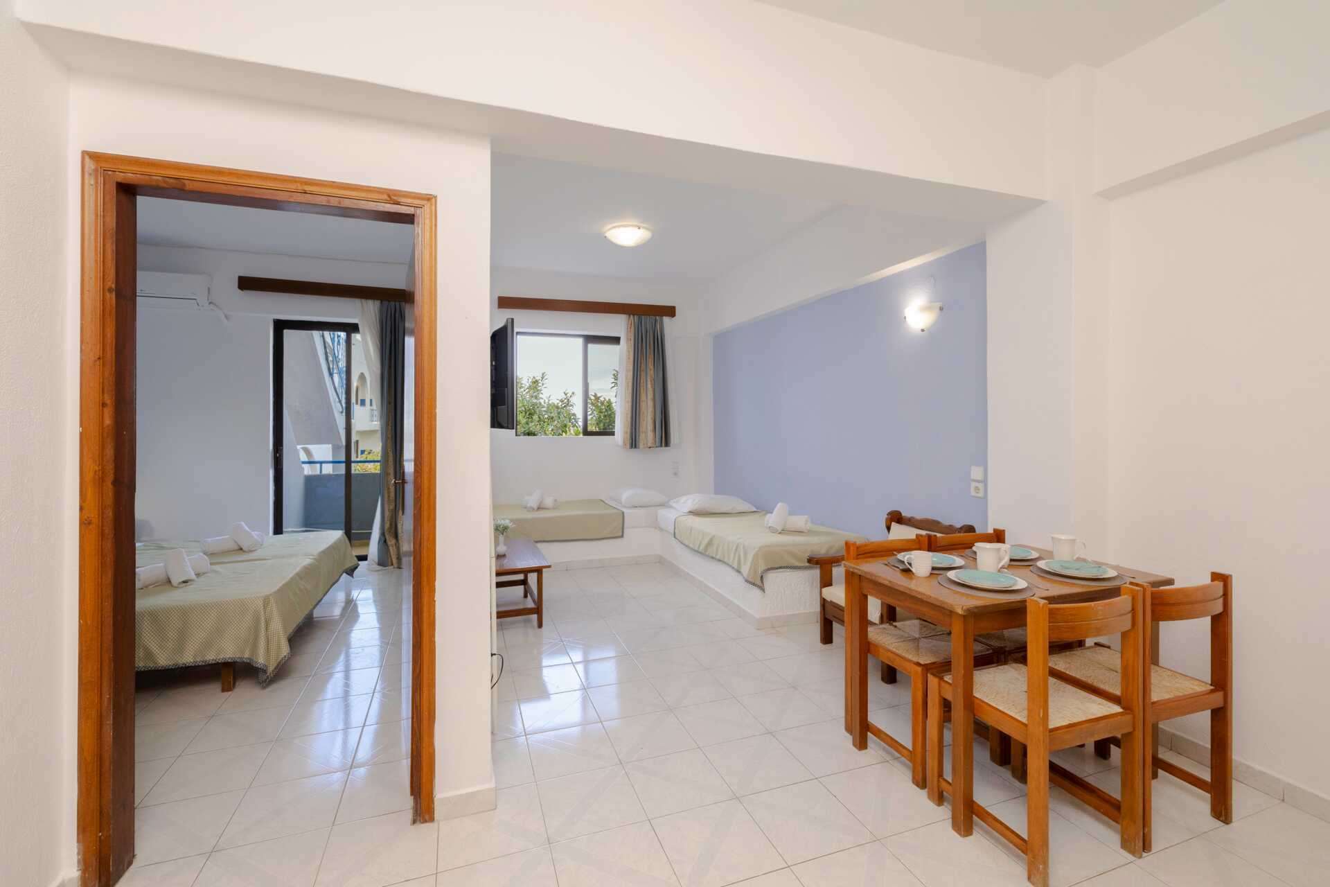 2-værelses lejlighed med balkon eller balkon i stueplan. Soveværelse og kombineret opholdsrum med minikøkken. To enkeltsenge. Mulighed for ekstra opredning i enkeltsenge. Minikøkken med køleskab, kogeplader, el-kedel og enkelt køkkenudstyr. Gratis wifi og deponering. Aircondition mod betaling. Tv med lokale kanaler. Badeværelse med bruser og toilet. Rengøring 6 gange om ugen.