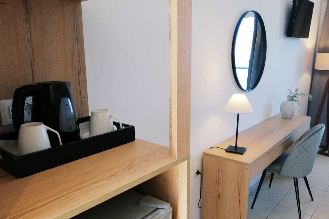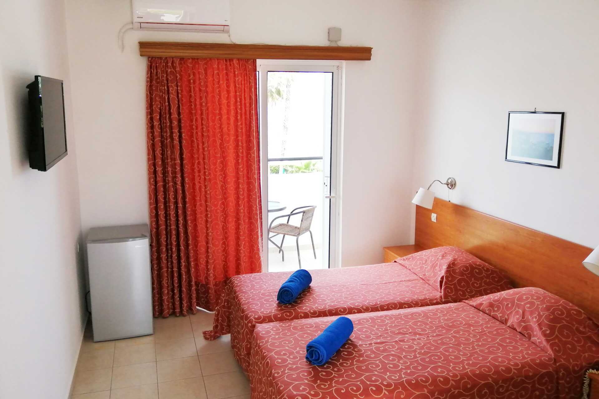 Dobbeltværelse med balkon i stueplan. To enkeltsenge. Mulighed for en ekstra opredning til en tredje person. Gratis wifi og aircondition. Deponering mod betaling. Køleskab. El-kedel. Tv med internationale kanaler. Hårtørrer. Badeværelse med badekar og toilet. Rengøring 7 gange om ugen.