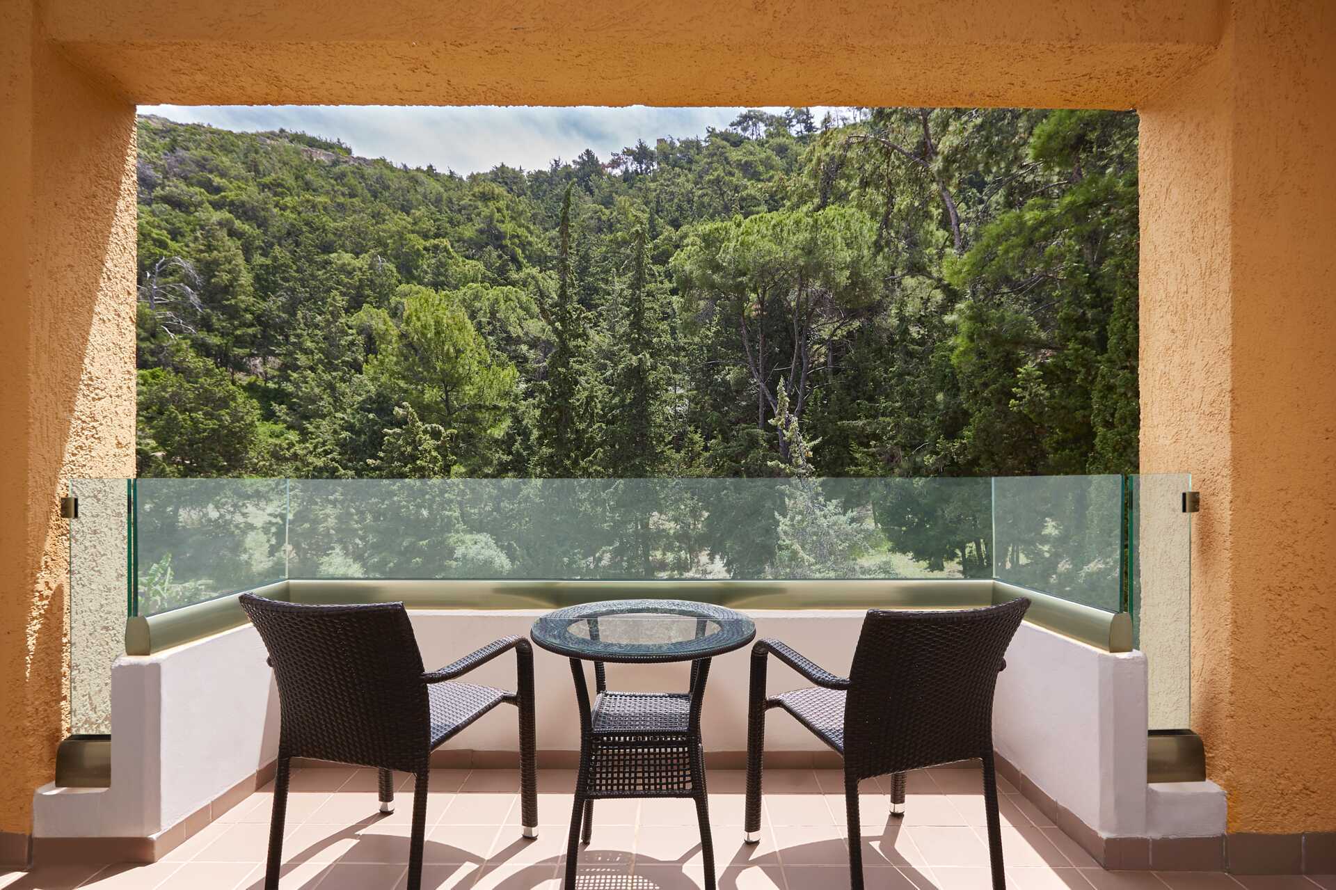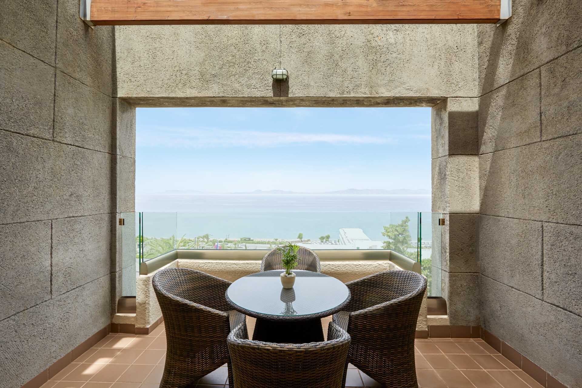 Deluxe-værelse med balkon og havudsigt. En dobbeltseng eller to enkeltsenge. Mulighed for ekstra opredning i fold ud-seng. Gratis wifi, aircondition og deponering. Køleskab. En flaske vand pr. personer inkluderet ved ankomst. El-kedel og kaffe/te. Skrivebord og et lille bord med to stole. Tv med internationale kanaler. Hårtørrer. Badeværelse med bruser og toilet. Rengøring 7 gange om ugen.